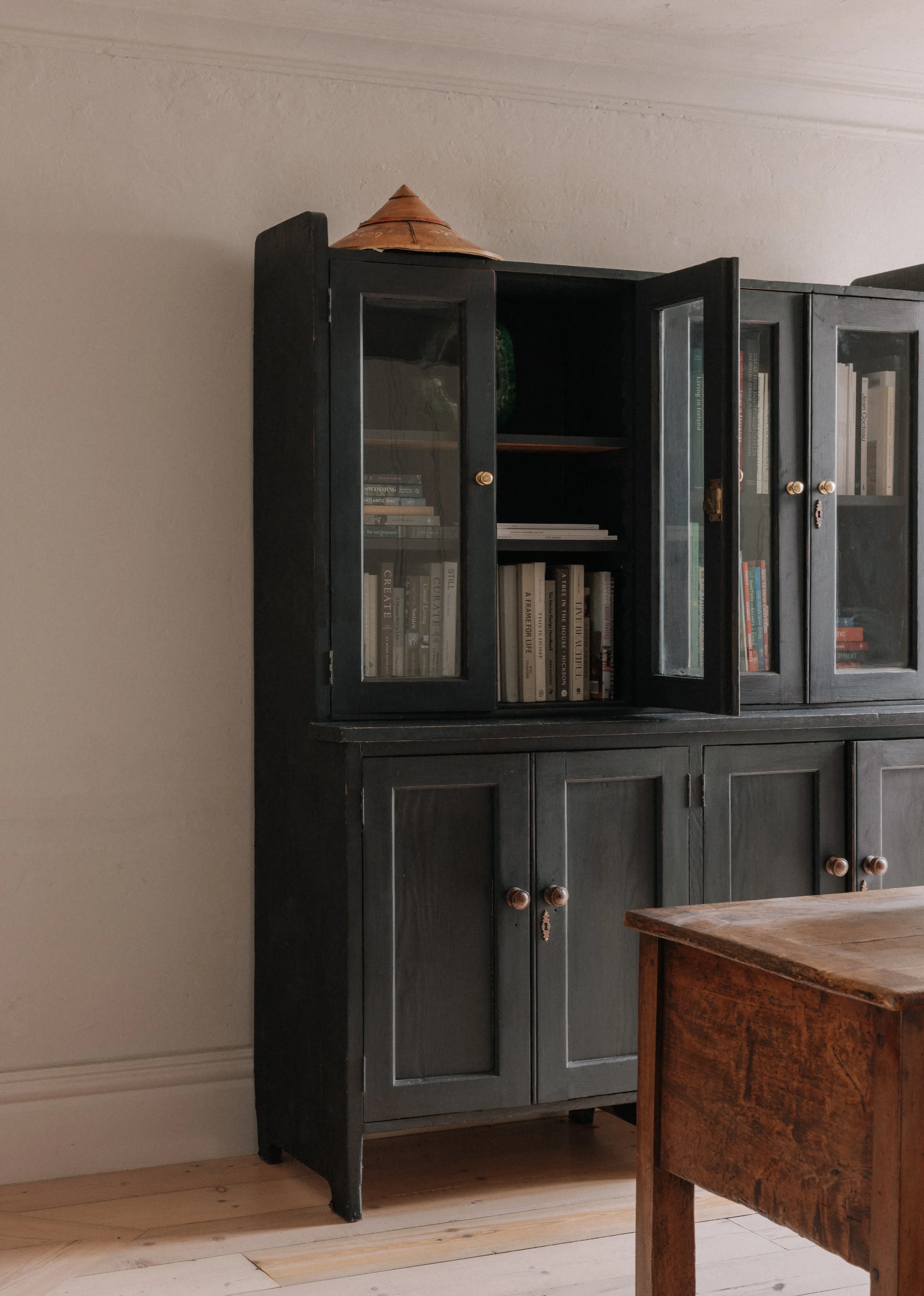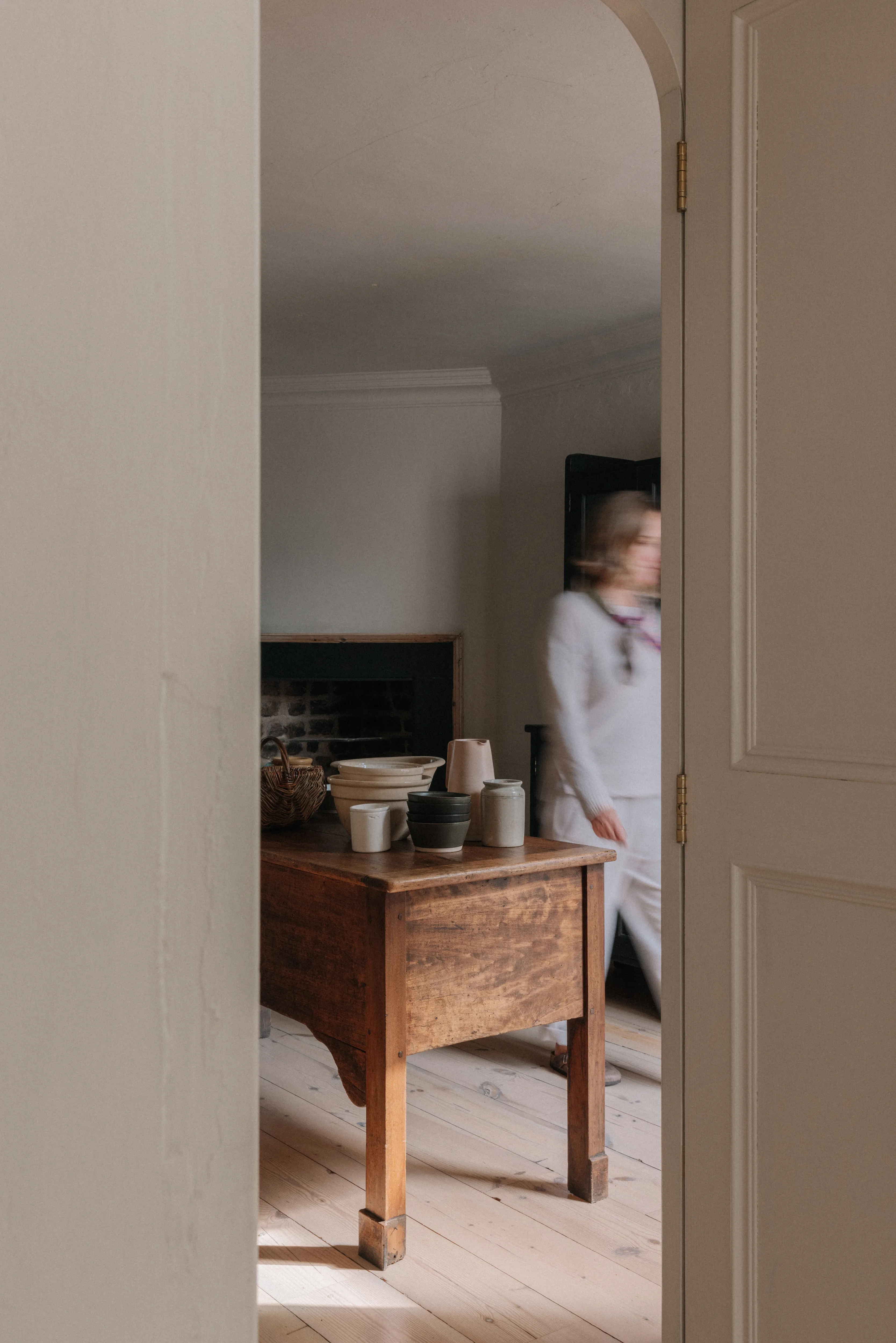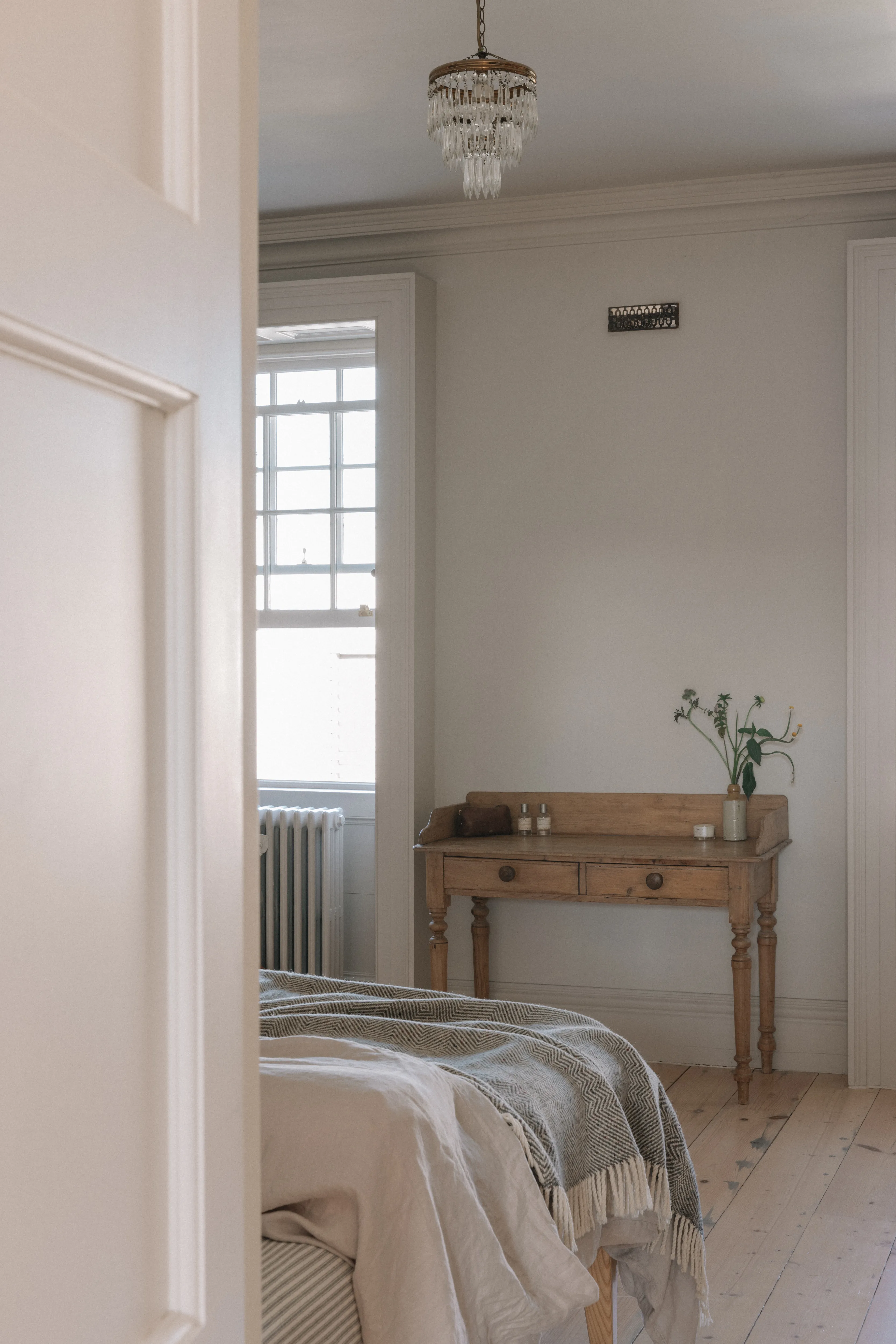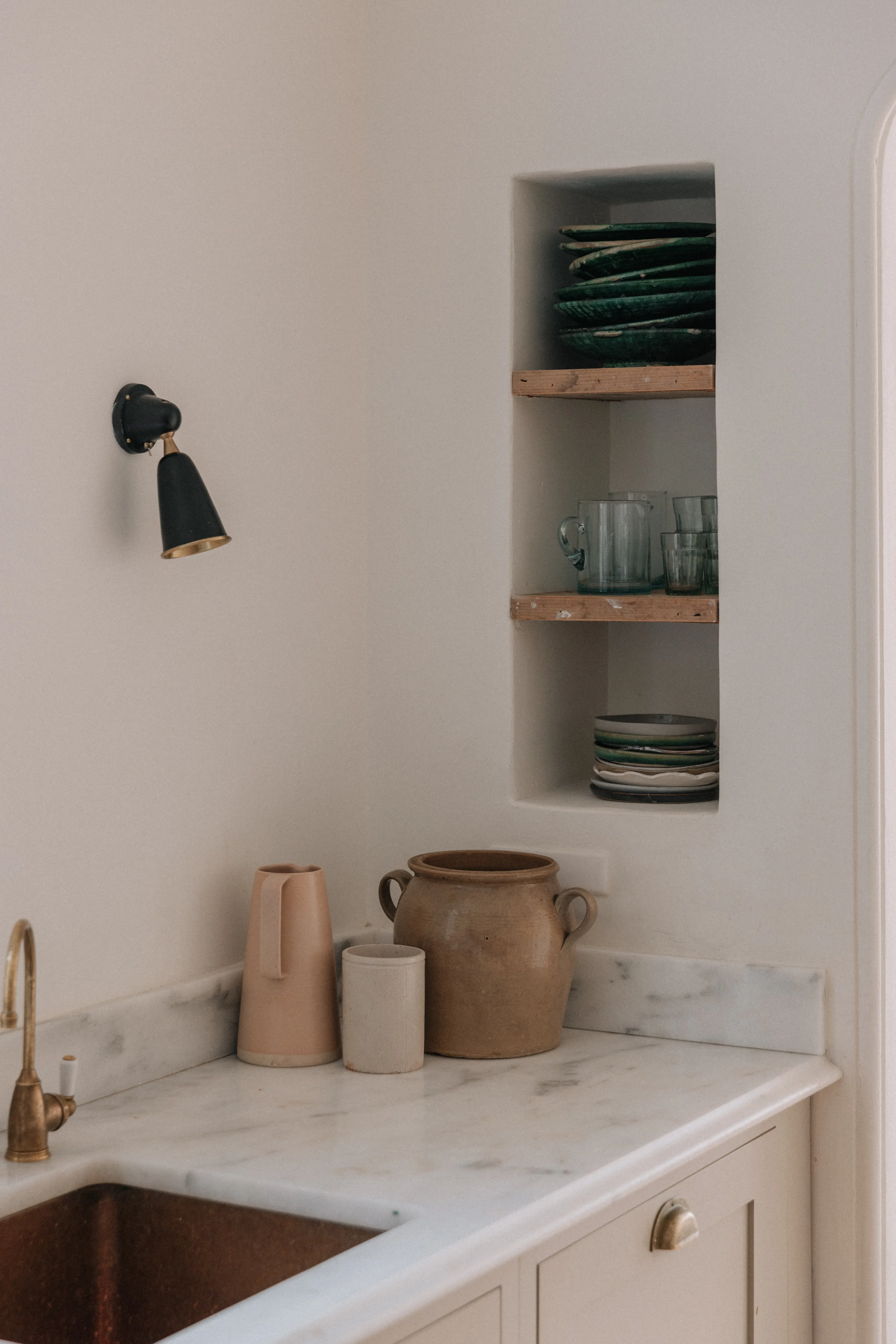 “Every sink, every tap, every handle has a story.” Paying attention to the ordinary things – the sweeping brush, the clothes horse, the light switches – was important to her. “I made all these things tactile so I would enjoy using them. For me, it’s about feel as well as function.” The result is a series of calm, earthy rooms, with a tight colour palette – Farrow & Ball’s Skimming Stone dominates – dotted with antique and vintage finds, some sourced on her travels with her husband to India and Morocco, others from her childhood home in Donegal.