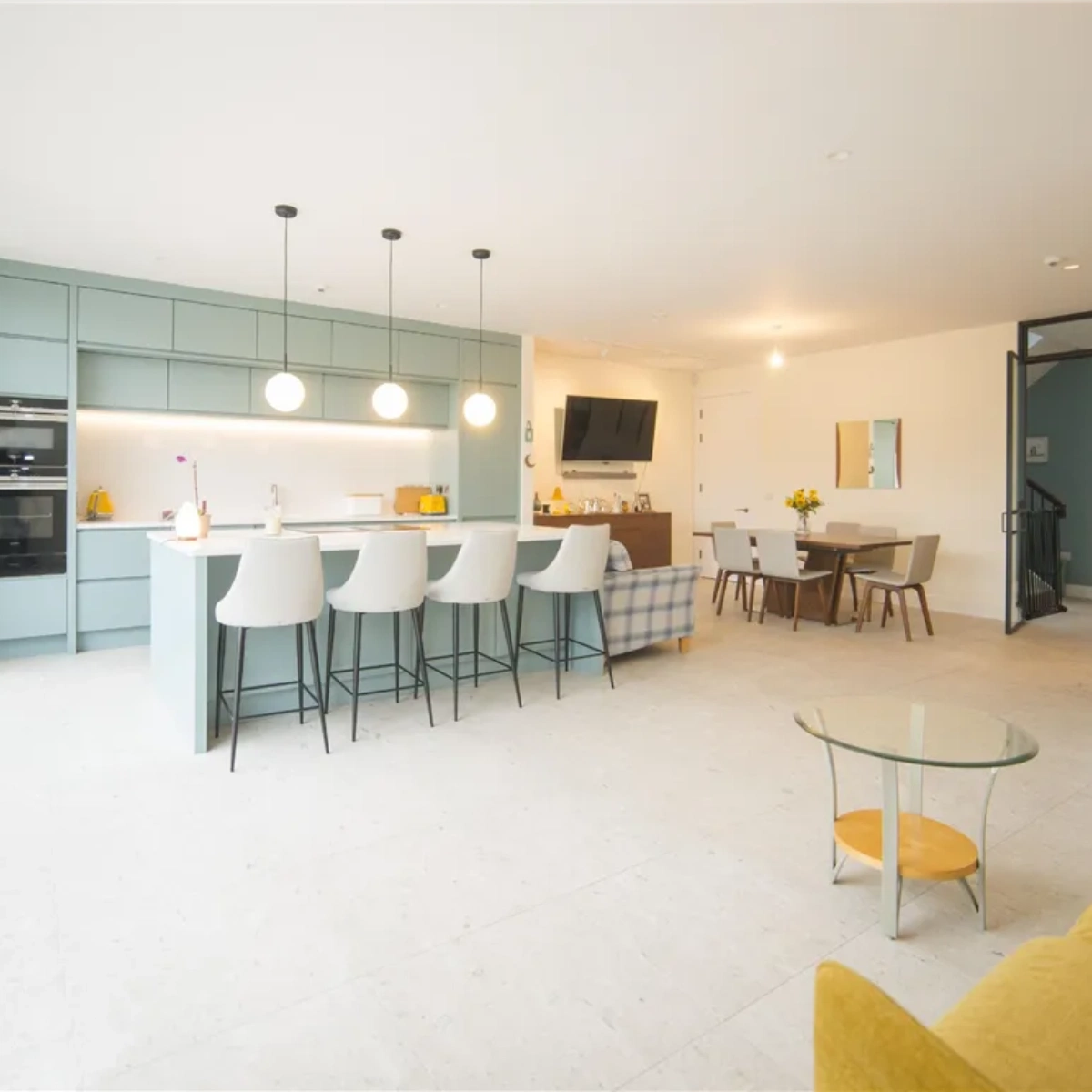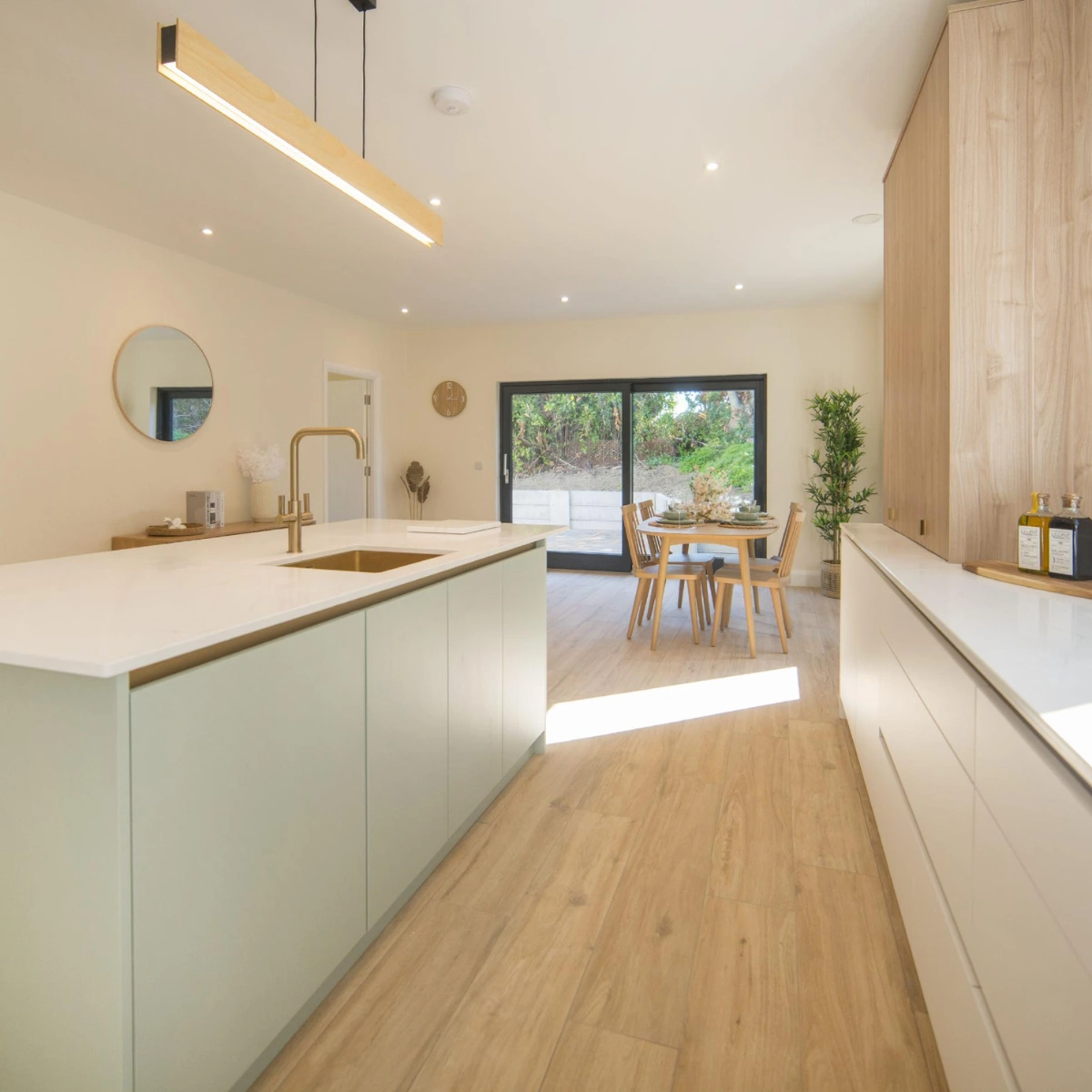 The kitchen is bespoke by Kerwood Design and features quartz counters and an island; all appliances are by the brand Neff. Natural light floods the space courtesy of large patio doors while the breakfast bar provides casual dining options.