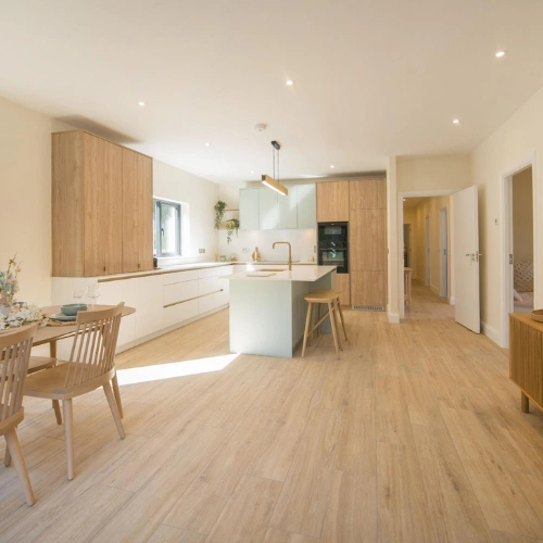 Inside, the accommodation comprises three double bedrooms – all with excellent built-in storage options. The master bedroom has an ensuite bathroom and a roomy walk-in wardrobe. The home office is located just off the entrance hall while the open-plan dining/kitchen area and a separate dual-aspect living room are located further inside.