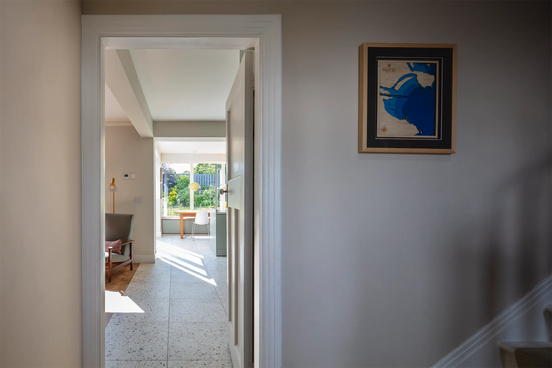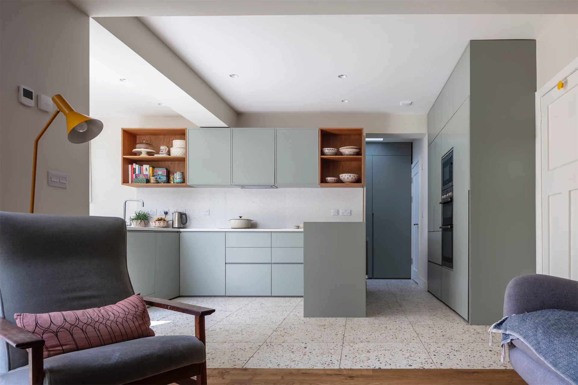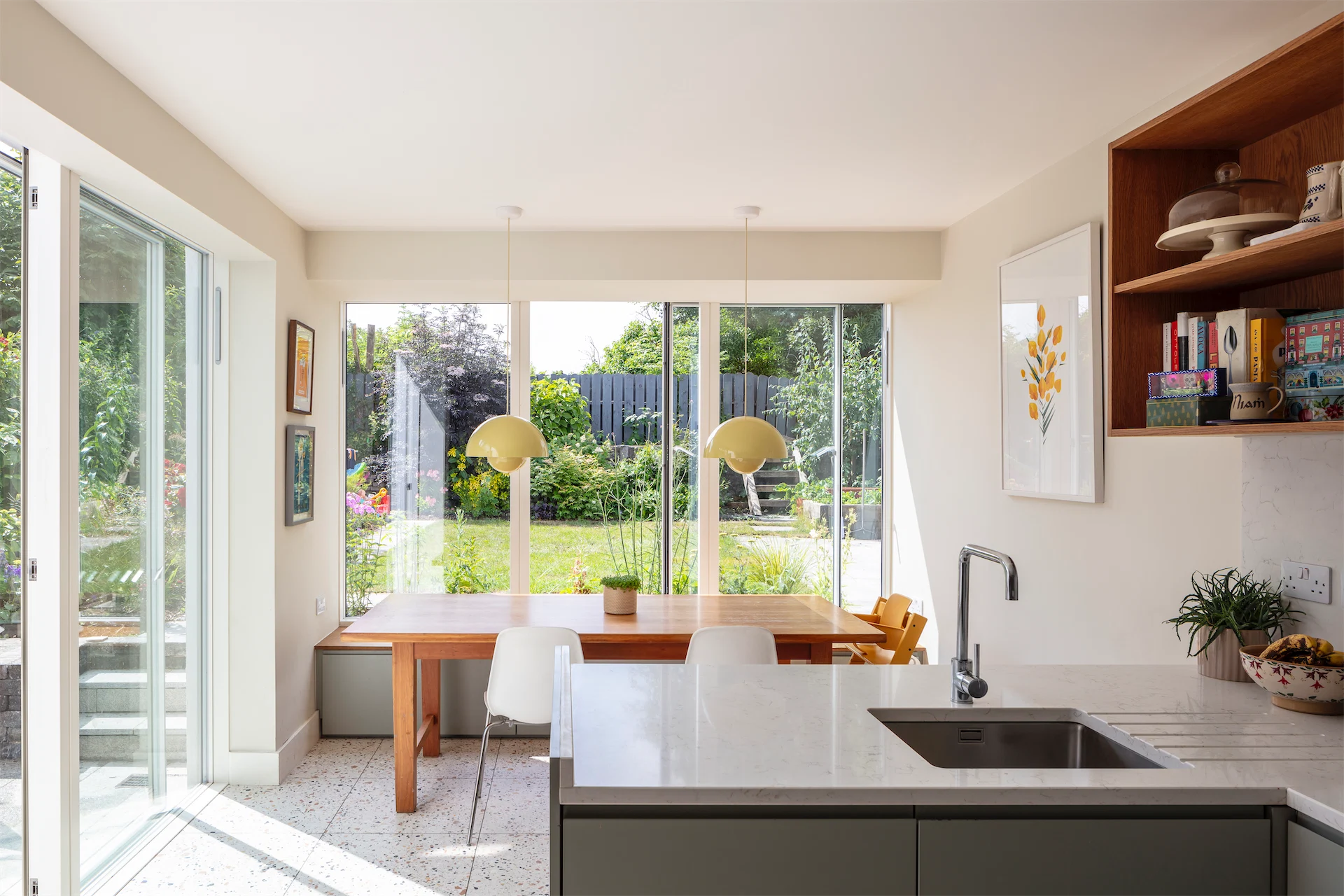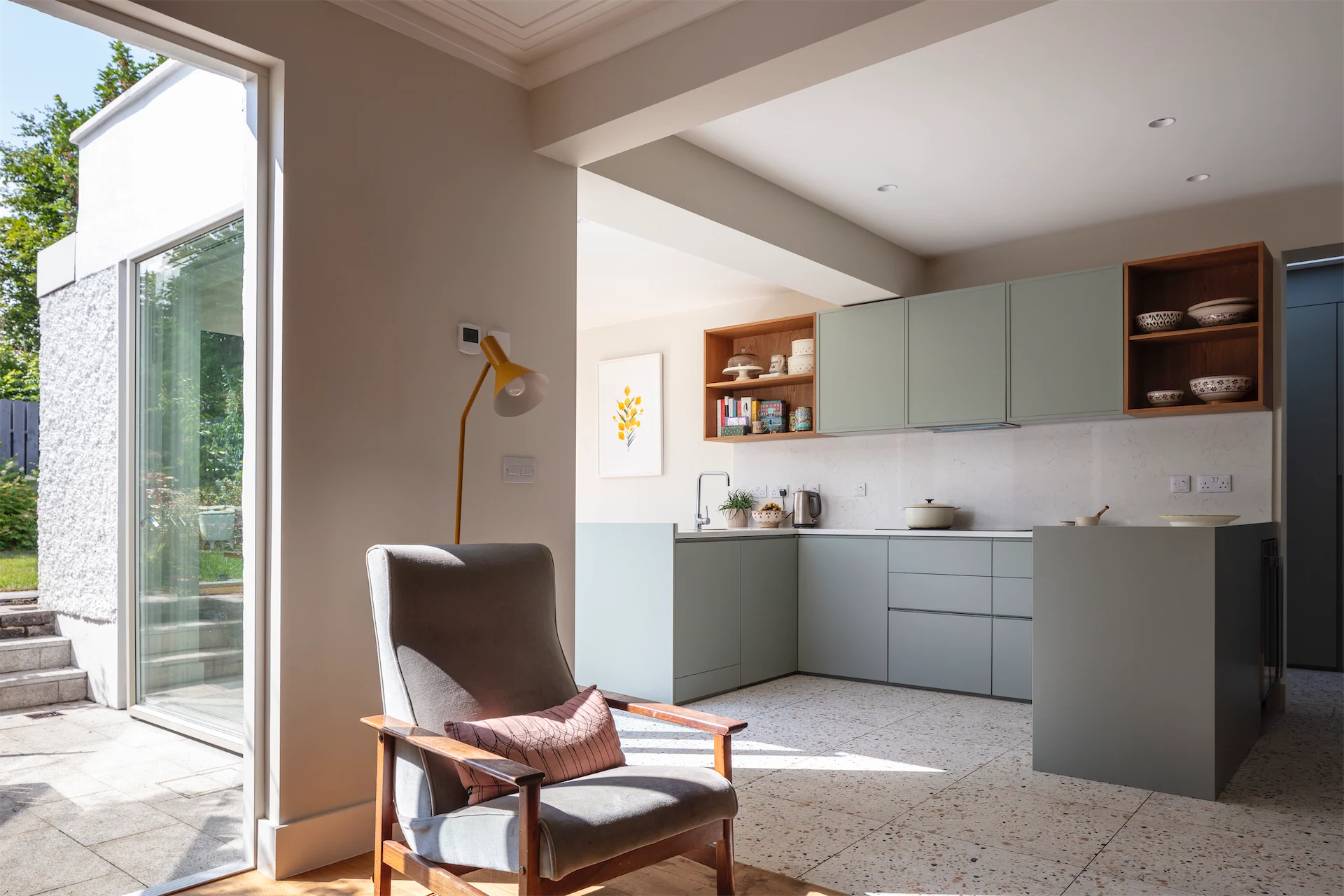 “The kitchen and dining areas, along with the other new rooms along the side of the house, have a more contemporary feel with Pigeon by Farrow and Ball chosen as a single unifying colour for new fitted furniture pieces, a more limited use of timber and large format terrazzo tiles underfoot,” Diarmaid says.