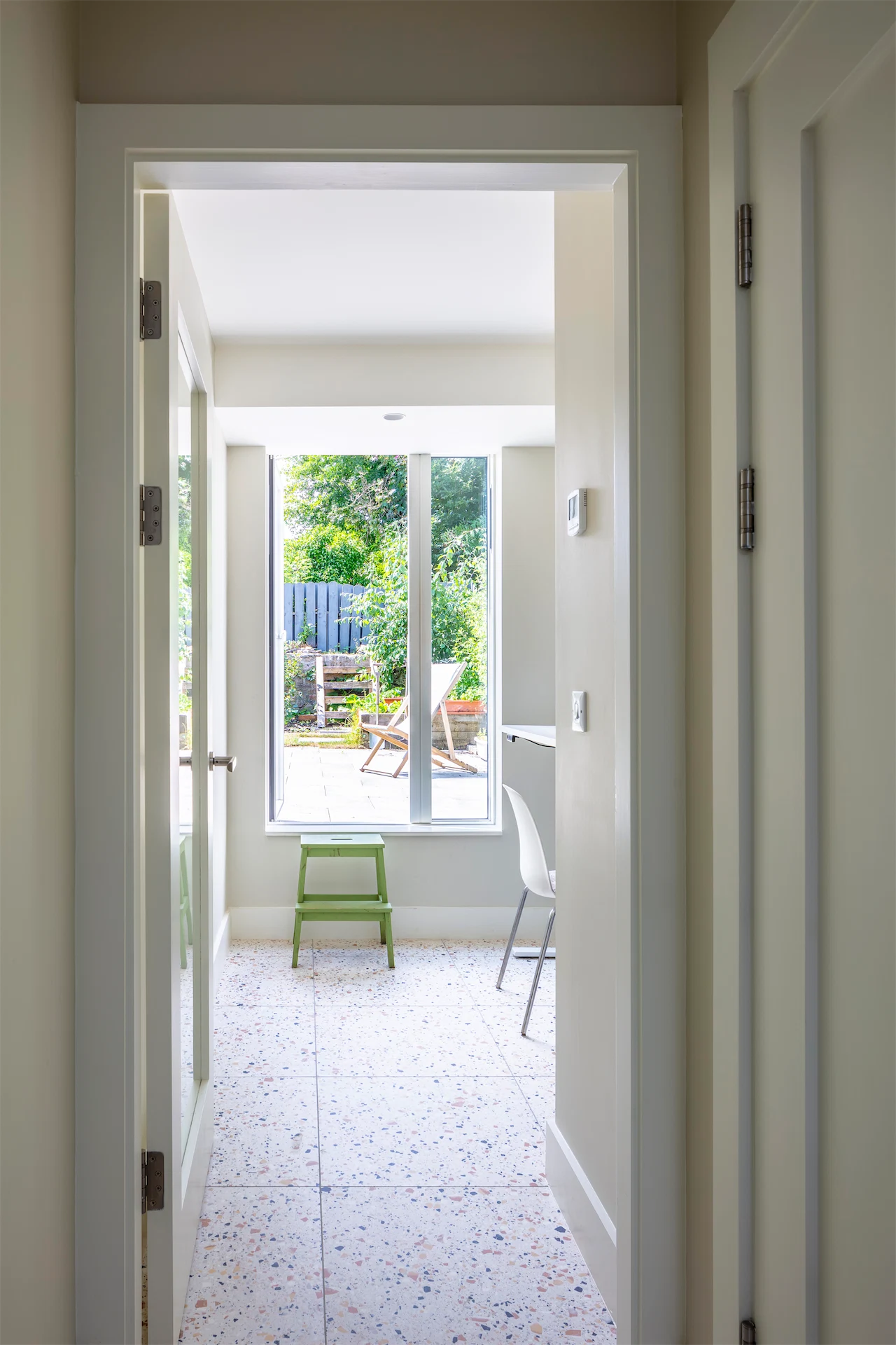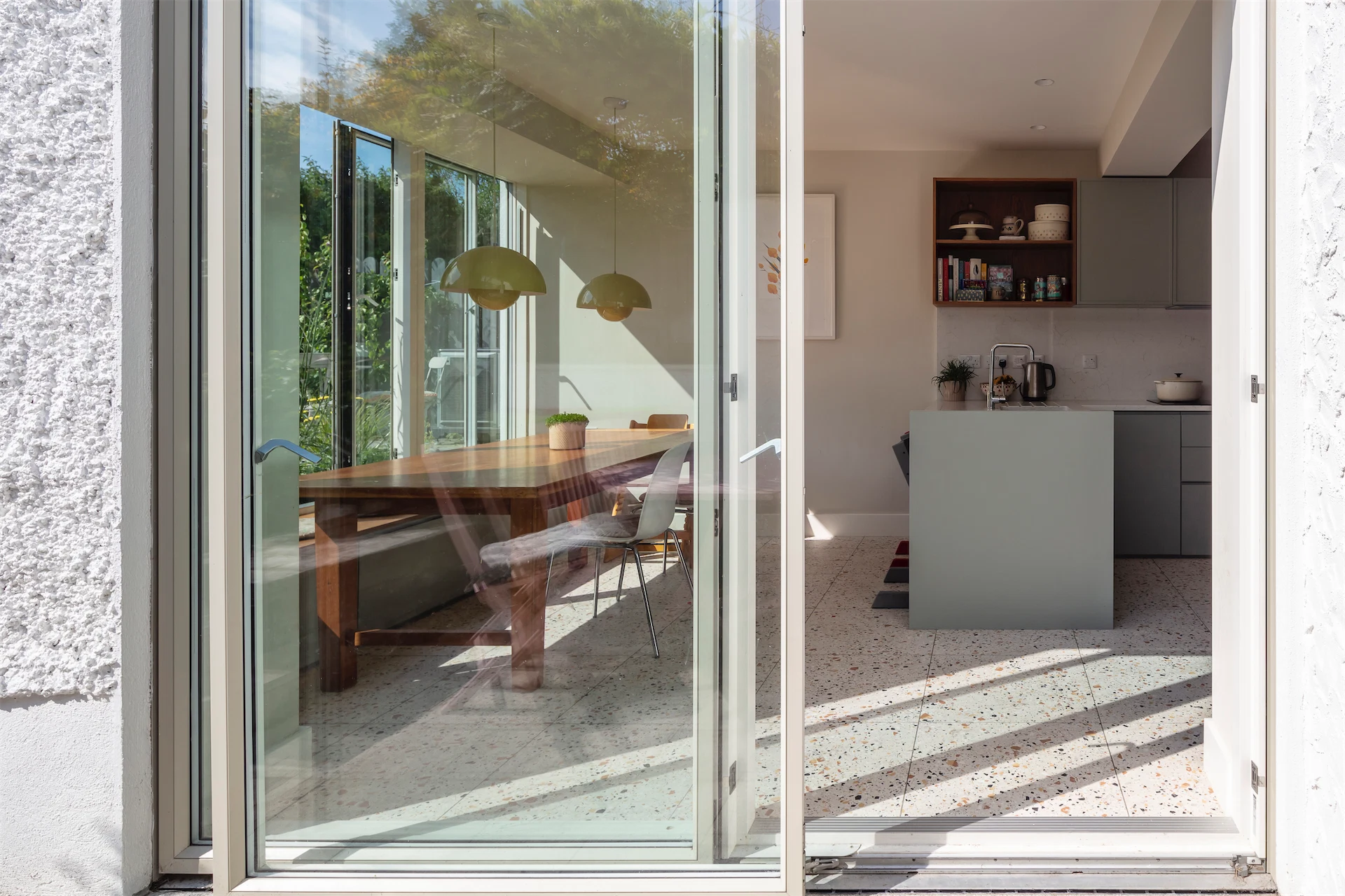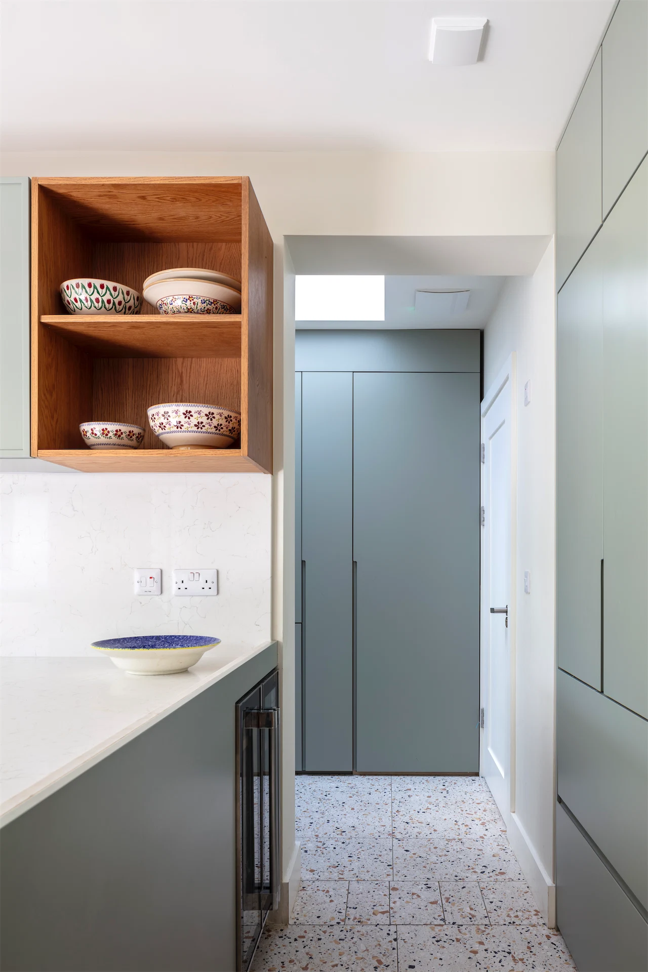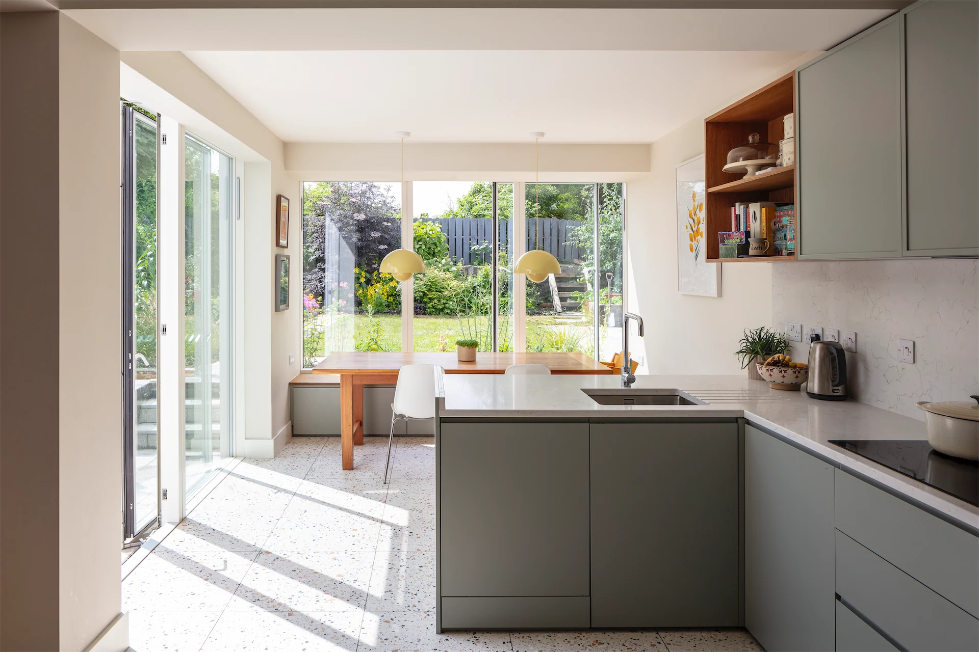 “The kitchen and dining areas, along with the other new rooms along the side of the house, have a more contemporary feel with Pigeon by Farrow and Ball chosen as a single unifying colour for new fitted furniture pieces, a more limited use of timber and large format terrazzo tiles underfoot,” Diarmaid says.