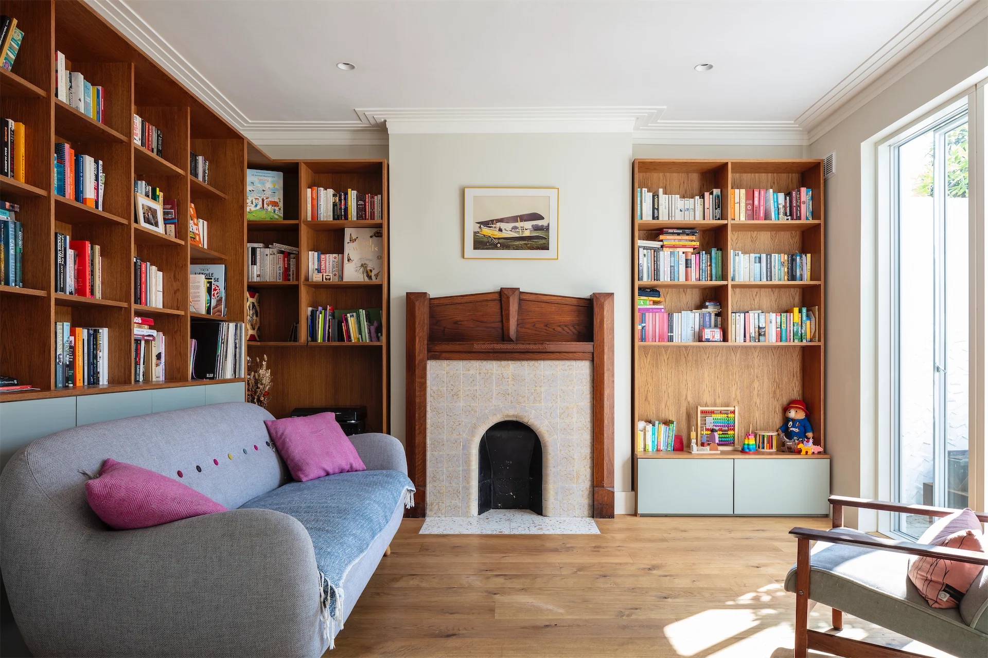 The fitted furniture, by Woodworks in Glasnevin was a key part of the design, Diarmaid says. “Fitted furniture helps to create calm and uncluttered spaces by providing much needed storage space. In particular, the new custom furniture lining 2 sides of the new living room is a stand out feature. Set against the original fireplace and art deco cornicing of the room, and designed to work with the furniture layout, it completes the room.”