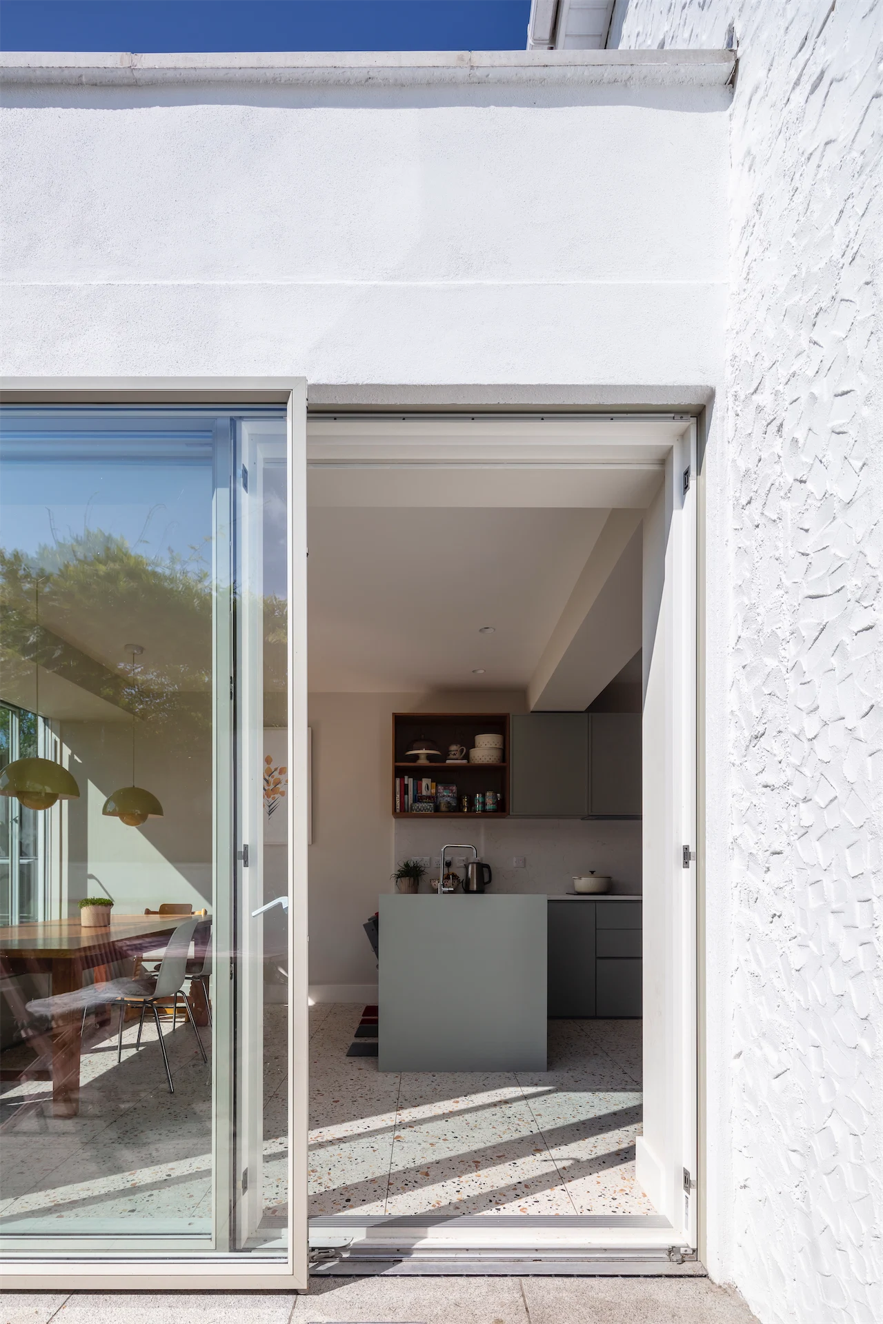 “Externally, the extension is painted white to match the house. A wet dash finish to the new walls provides a subtle difference from the rough render finish of the house. New pebble grey coloured alu-clad windows and sliding doors come to the ground for light and airy rooms across the back of the house. A matching aluminium capping across the back of the extension adds further colour and draws the eye to its lower perimeter roofline.”