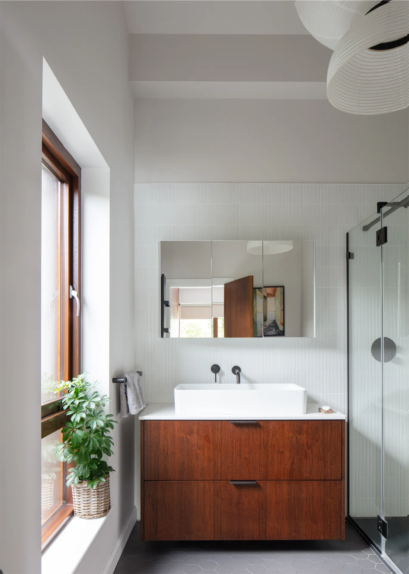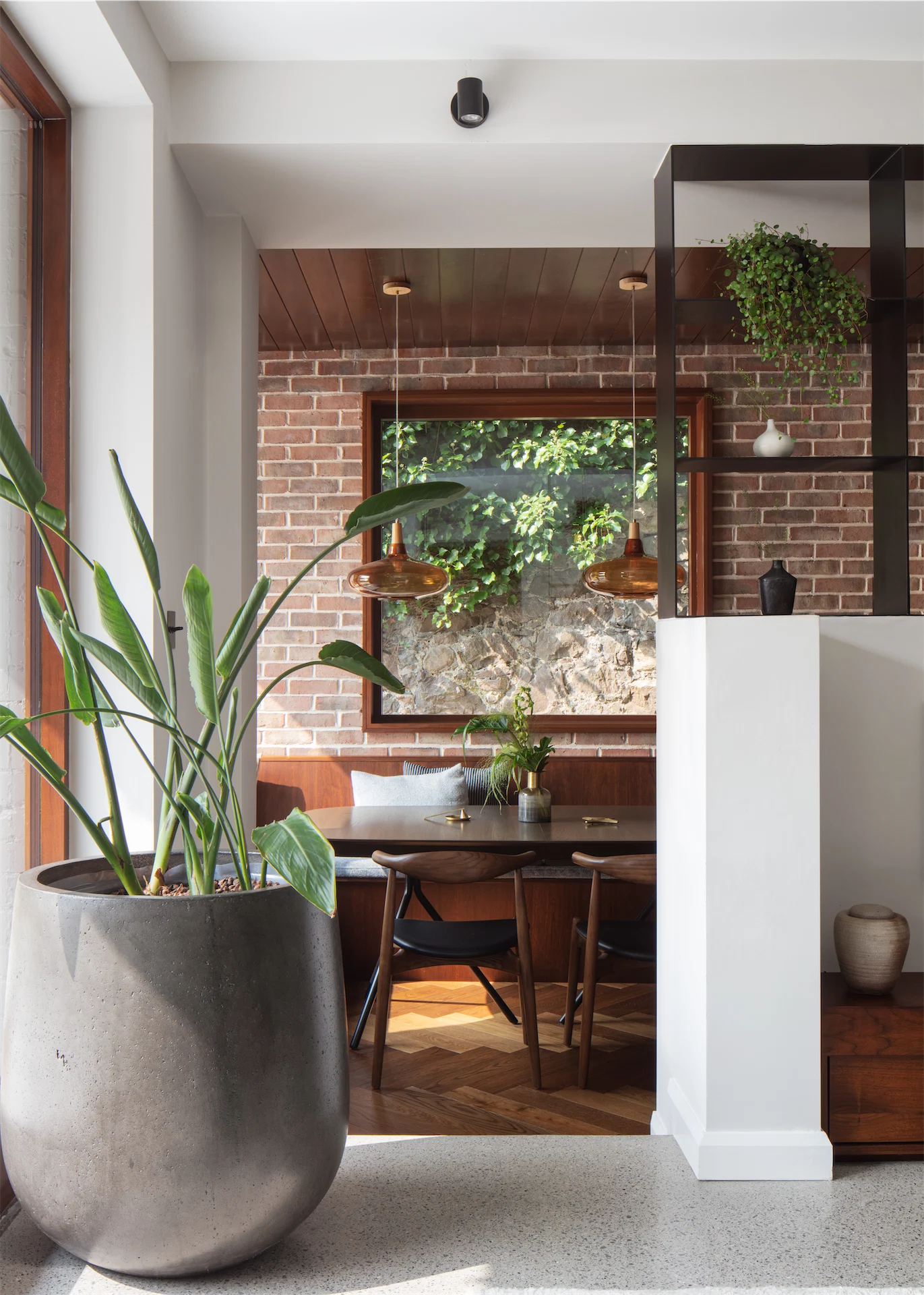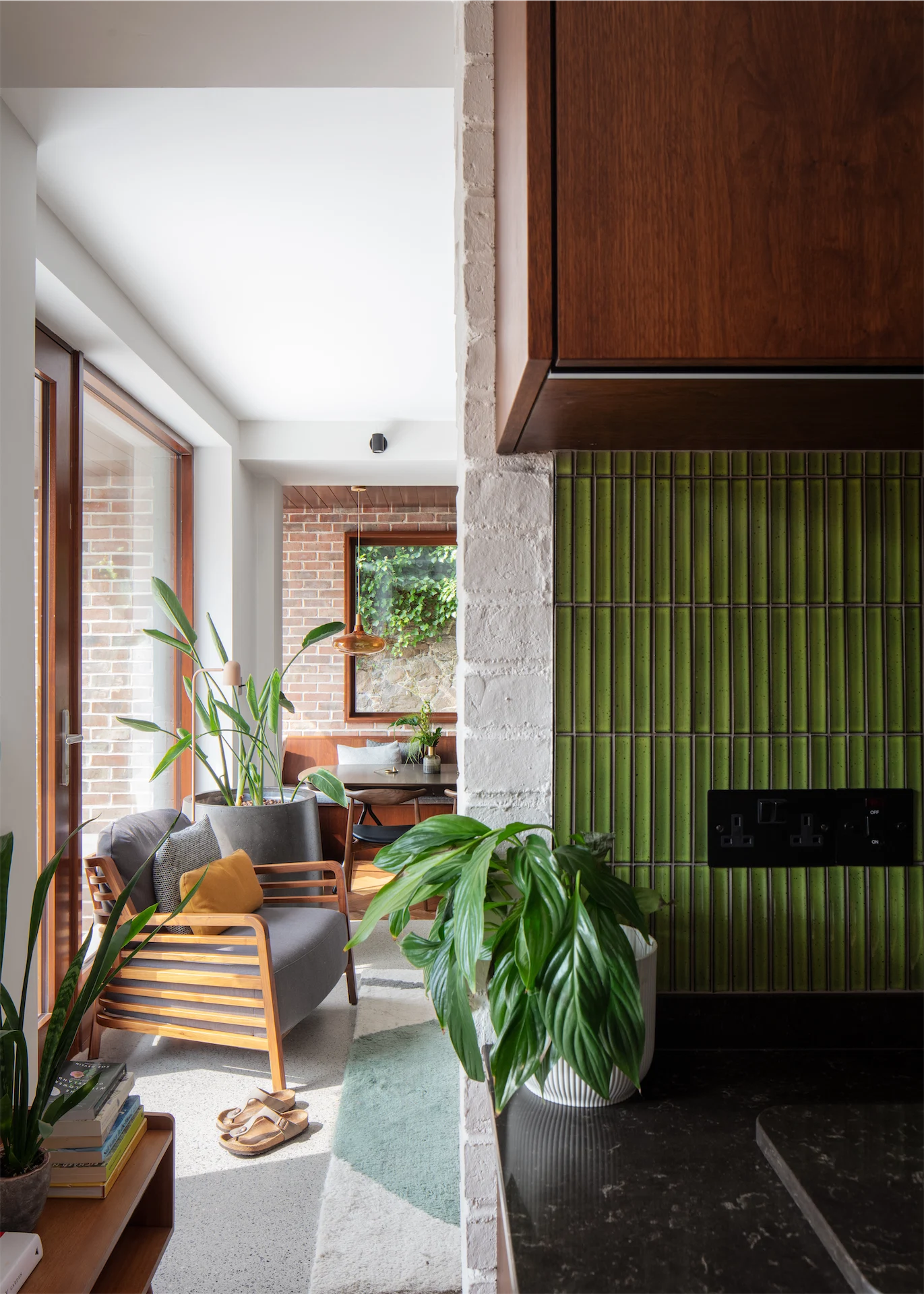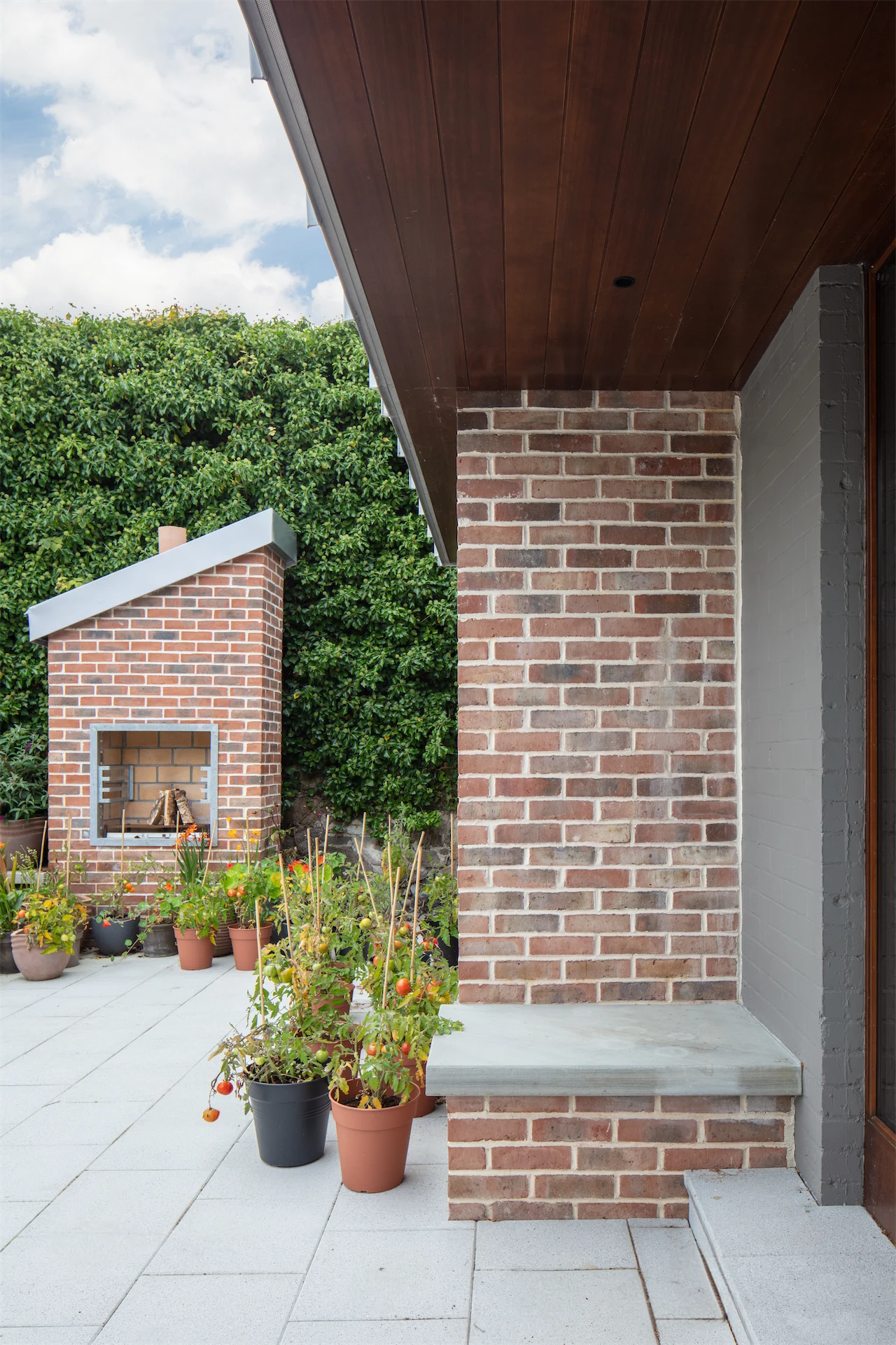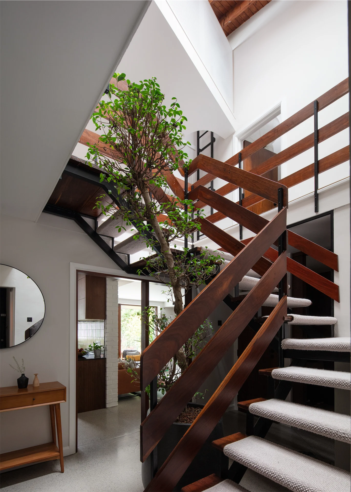 The result is that the old exterior wall is in conversation with the interior space throughout the whole home, creating a biophilic, cocoon-like feel that’s unexpected given its decidedly suburban location. “We’ve got windows that just look straight at the wall, so no matter where you are, it almost feels like you’re in the trees,” says Stephen. “As you go through the house, you have these glimpses of it. It also means we don’t have to have any kind of window coverings and it’s still completely private.”
