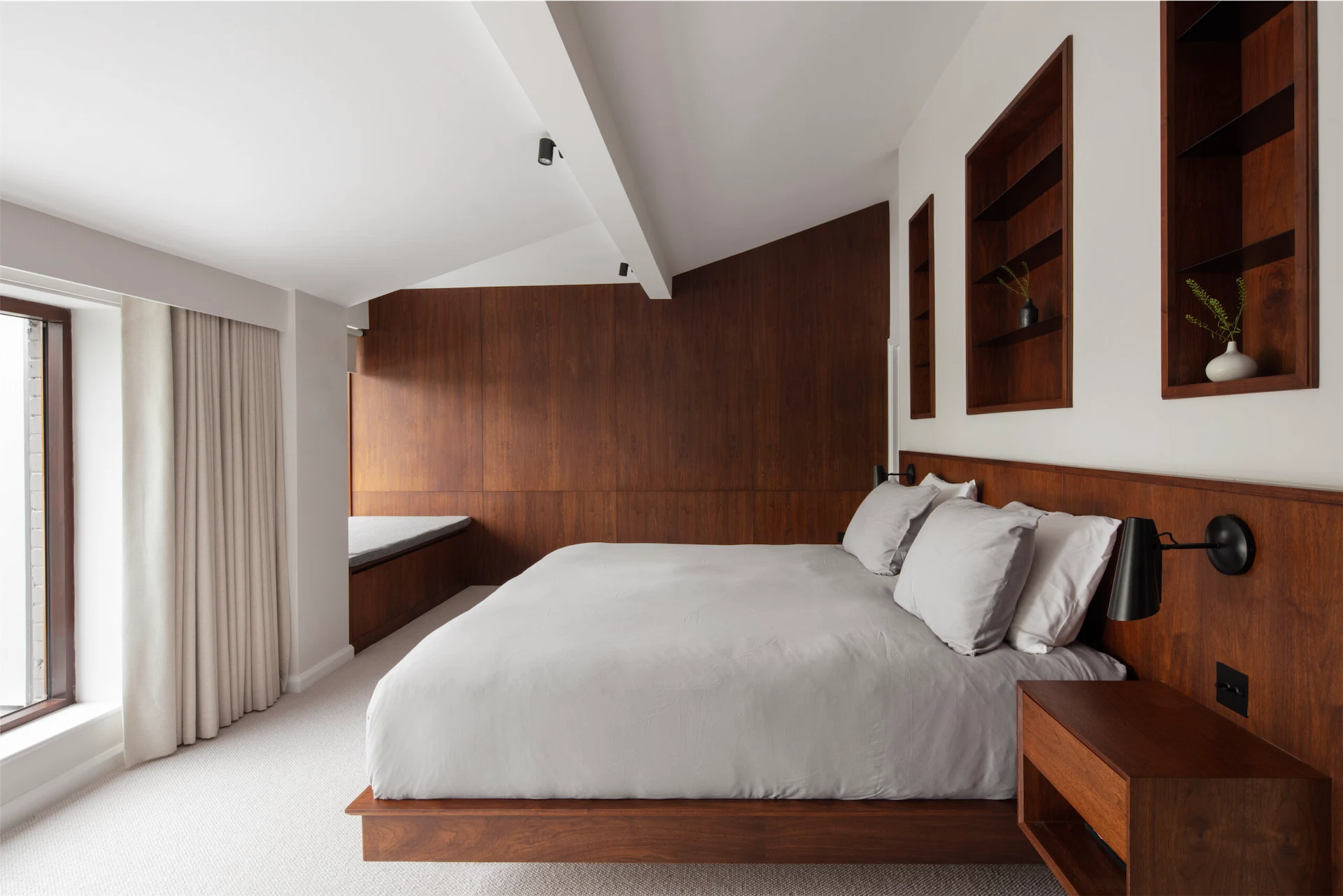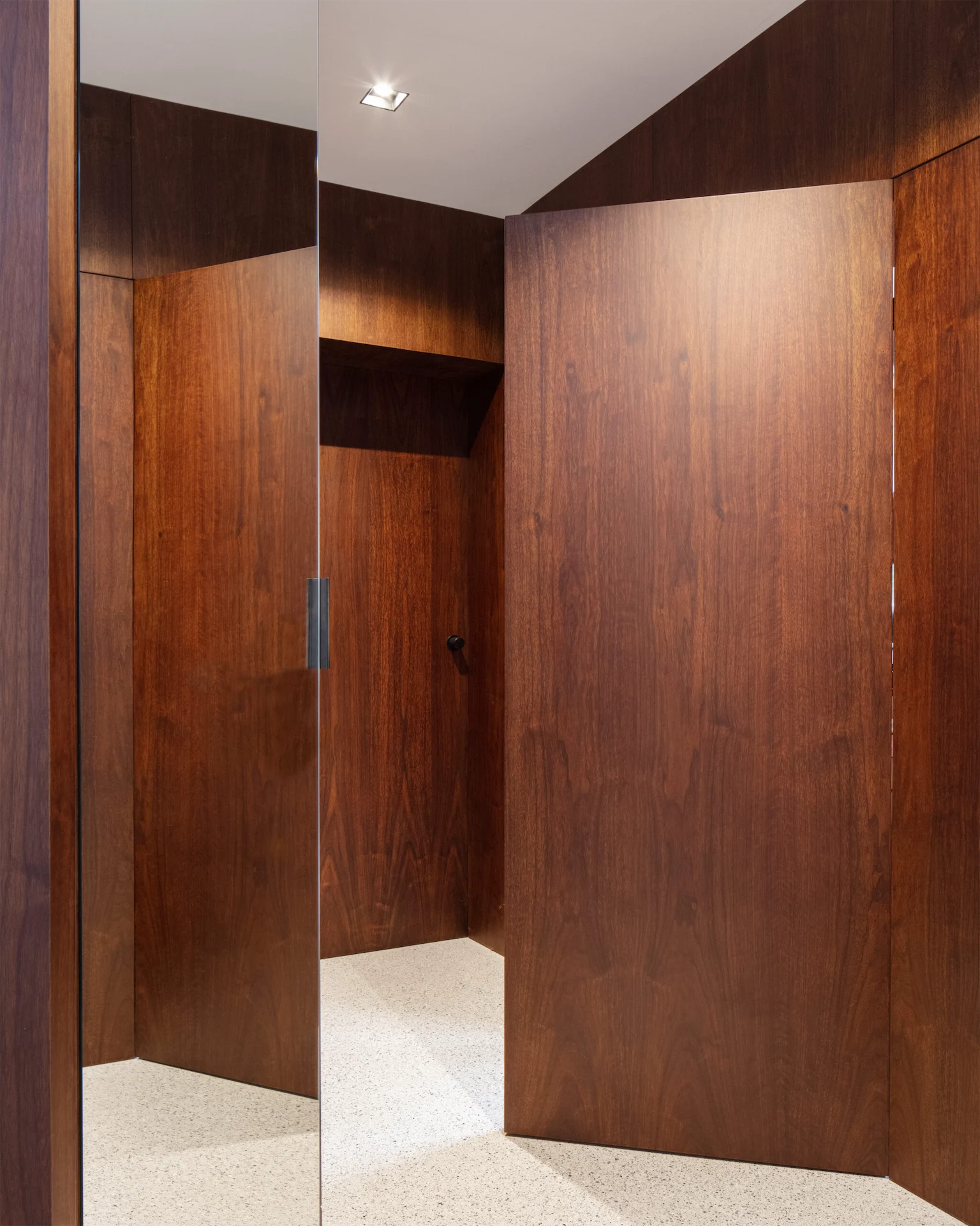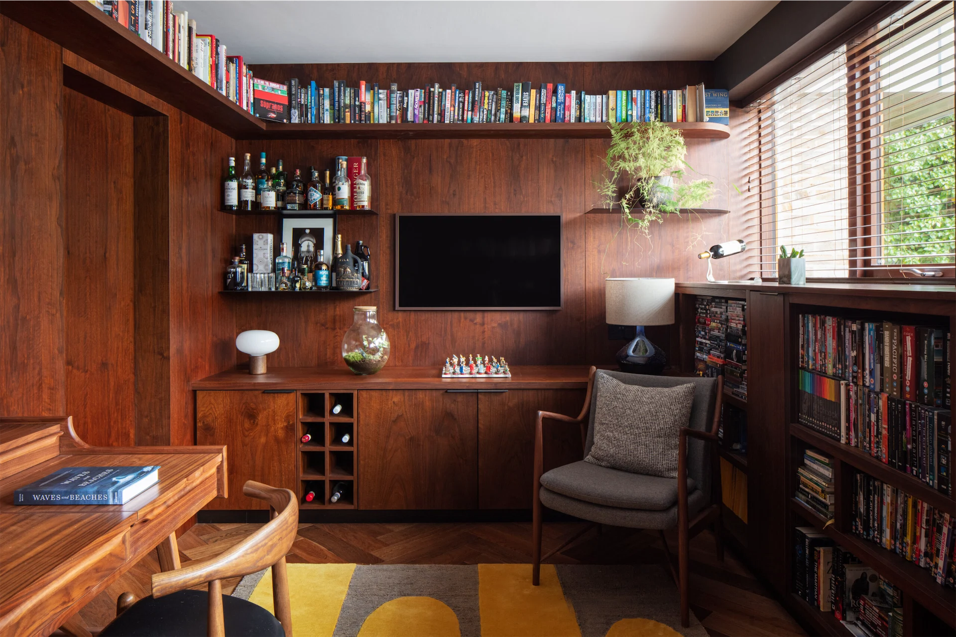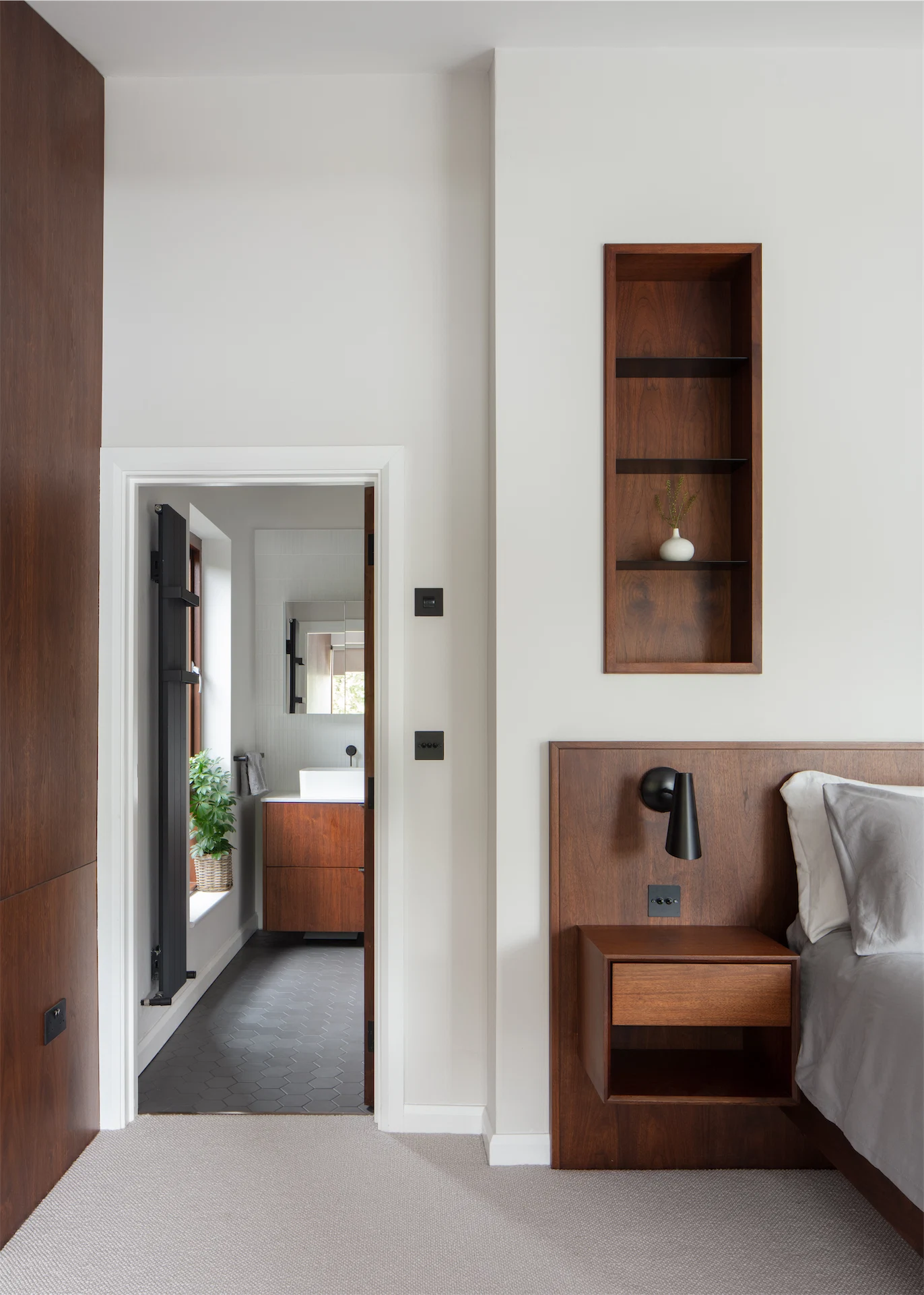 For all these new touches, the team were mindful of doing as little internal demolition as possible and kept many of the house’s original proportions. “There was a single wall taken out,” says Stephen. Bedrooms were updated with minimal structural changes, with joinery by Handcraft Furnishings creating a luxe, bespoke feel. What was once the kitchen, at the front of the house, is now a wood-panelled library, accessible via a “secret” door.