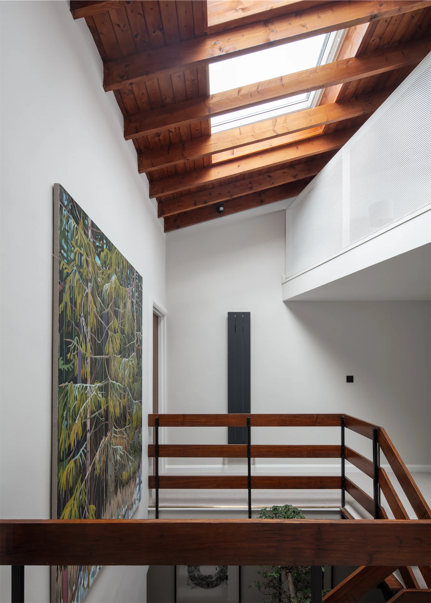 Adding to the treehouse feel is a cool and contemporary mezzanine. The homeowners didn’t want to lose the original exposed beam ceilings, so Stephen and his team came up with a clever solution – insulating from the outside (this helped bring the BER rating from an E2 to an A3) and installing two north-facing skylights above the beams to flood the core of the house with light. Alongside this, they added the all-white mezzanine, which is accessed via a ladder.