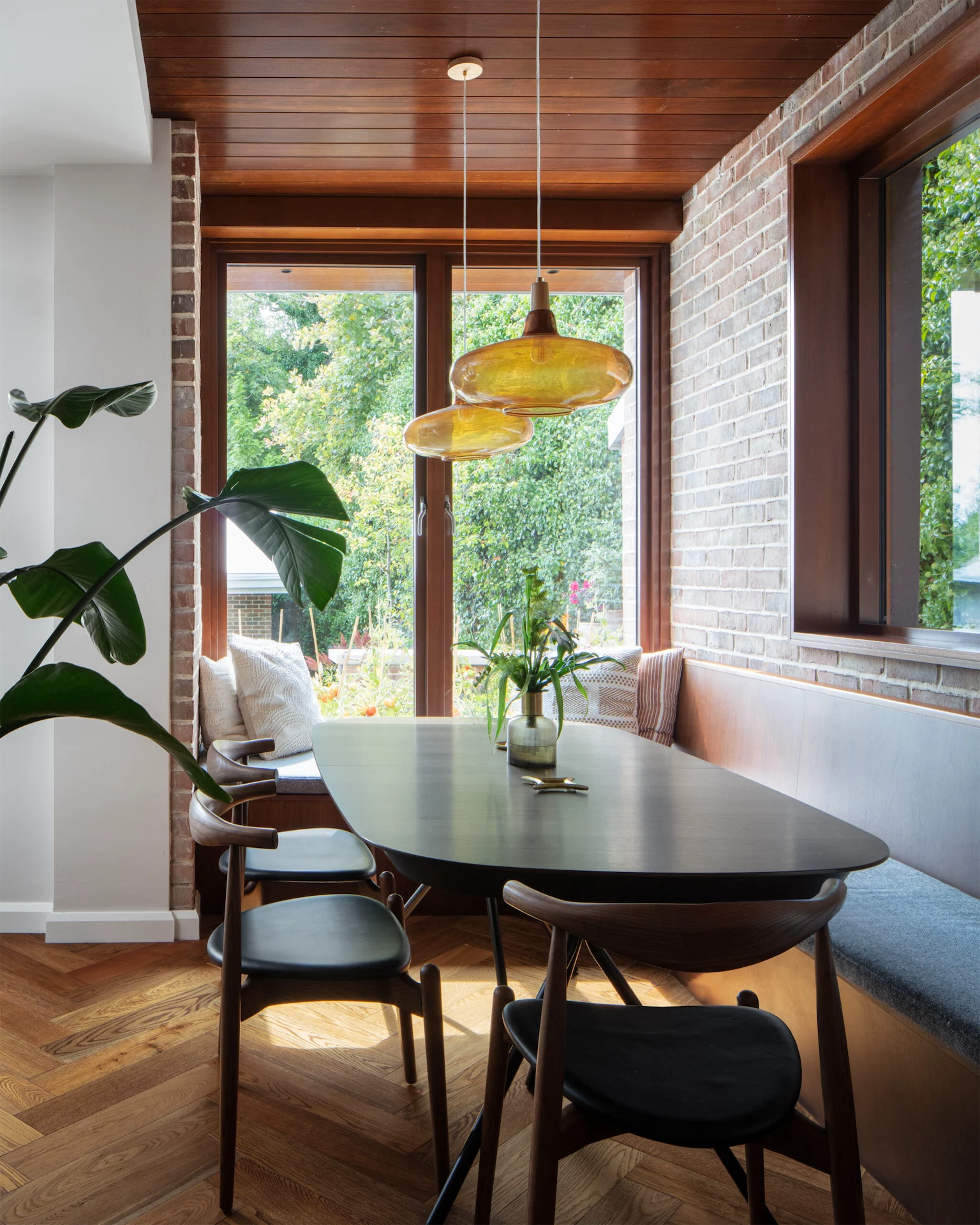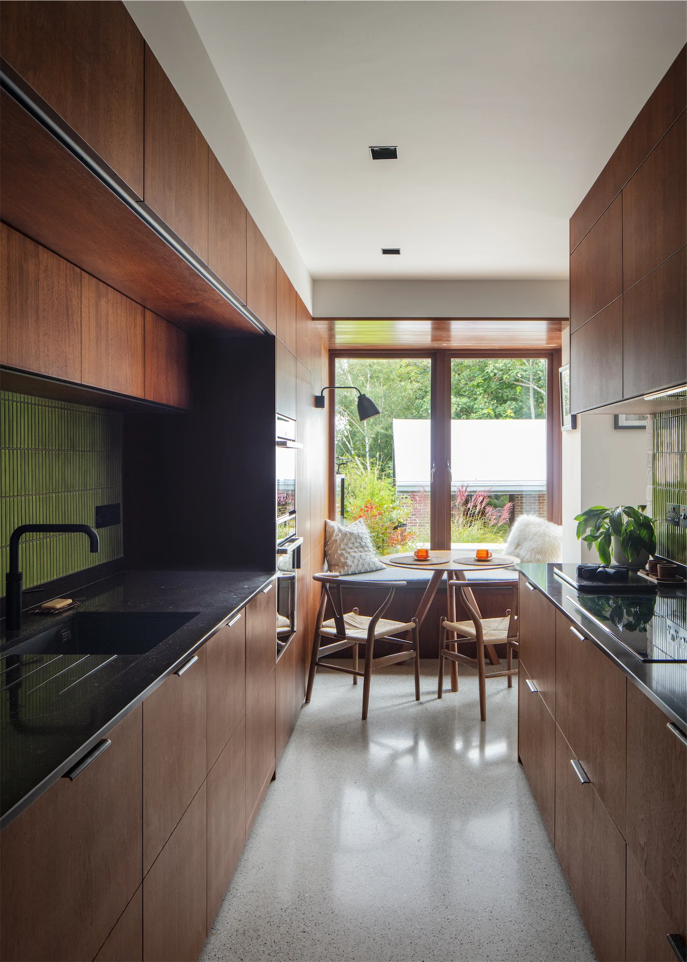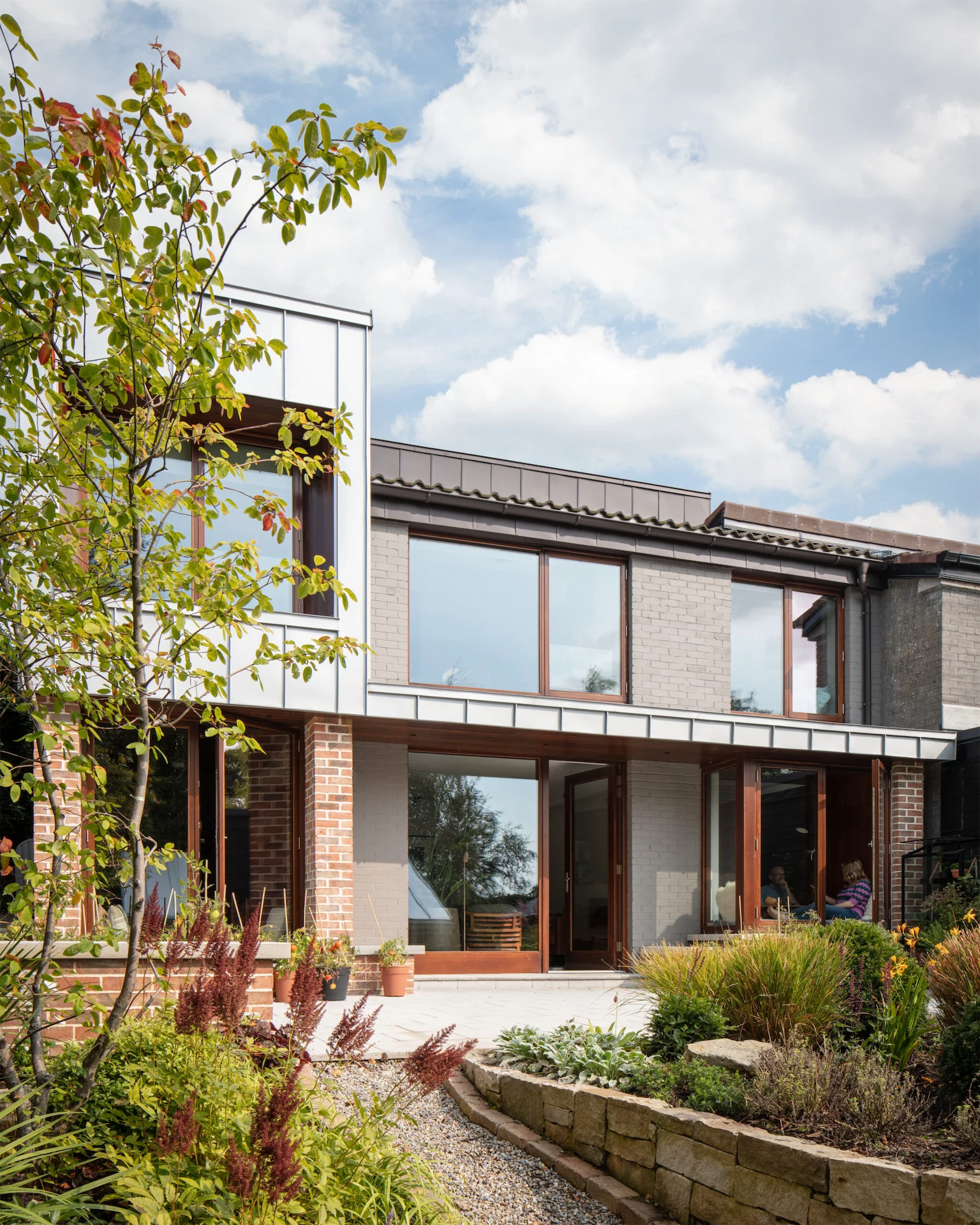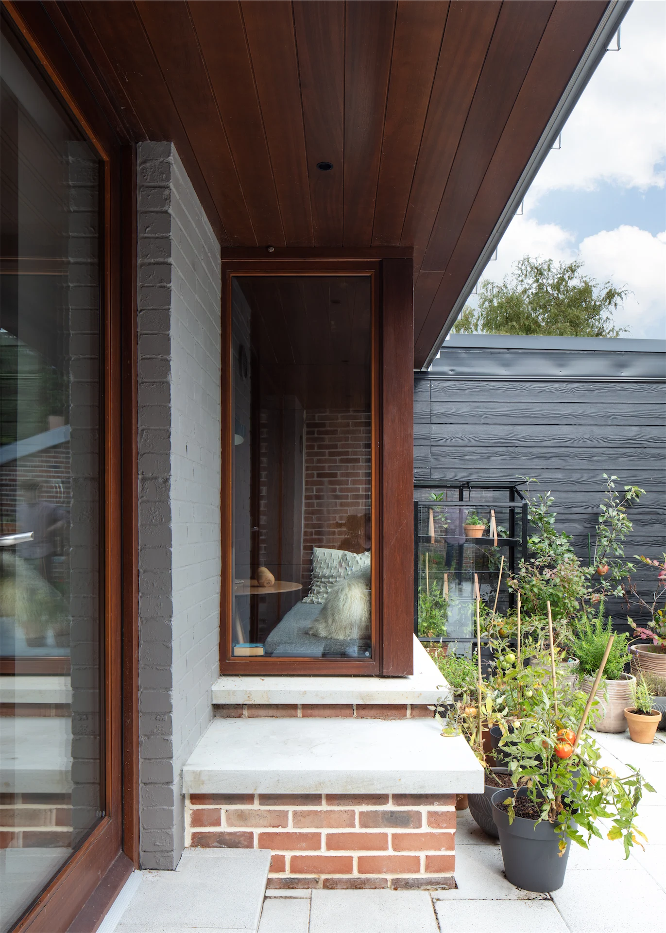 When it came to creating more space, the homeowners didn’t want to lose any of the garden, so they chose to extend via a two-storey brick and metal-clad section inserted between the house and an existing 16-foot ivy-covered wall. The kitchen was relocated from the front of the house to the rear, complete with a sunken dining room.