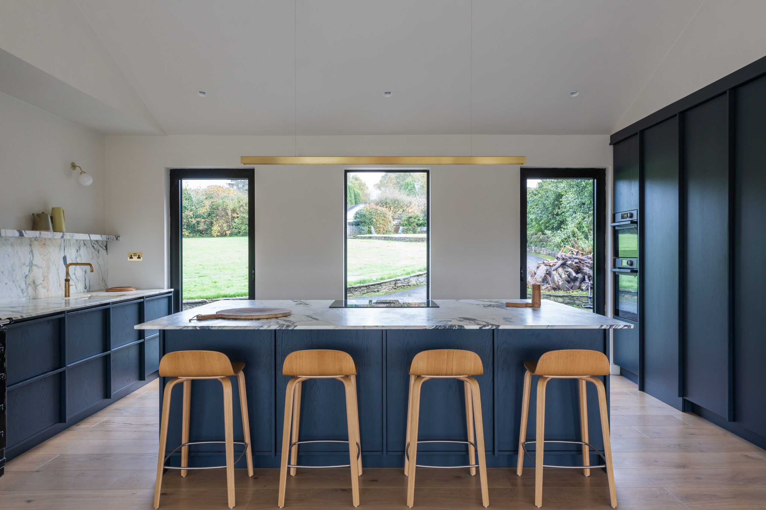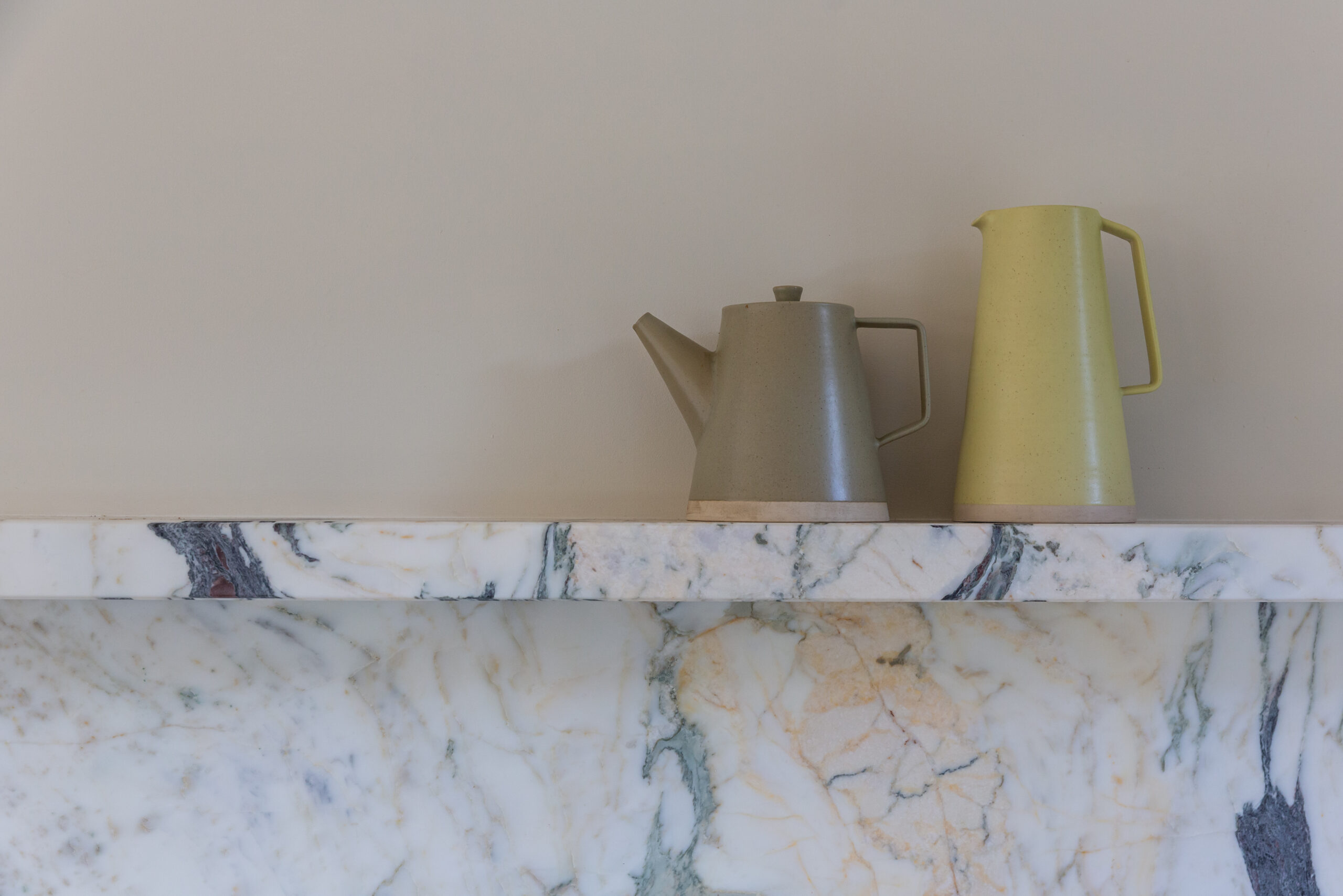 Materials and details were chosen with care. “The client has a love for natural stone,” she adds. “And Calacatta marble is used sparingly but purposefully: in the kitchen, as a custom floor-mounted basin in the guest en suite, and as marble plinths beside the bed in the master bedroom. These details bring warmth and tactility to the home.”