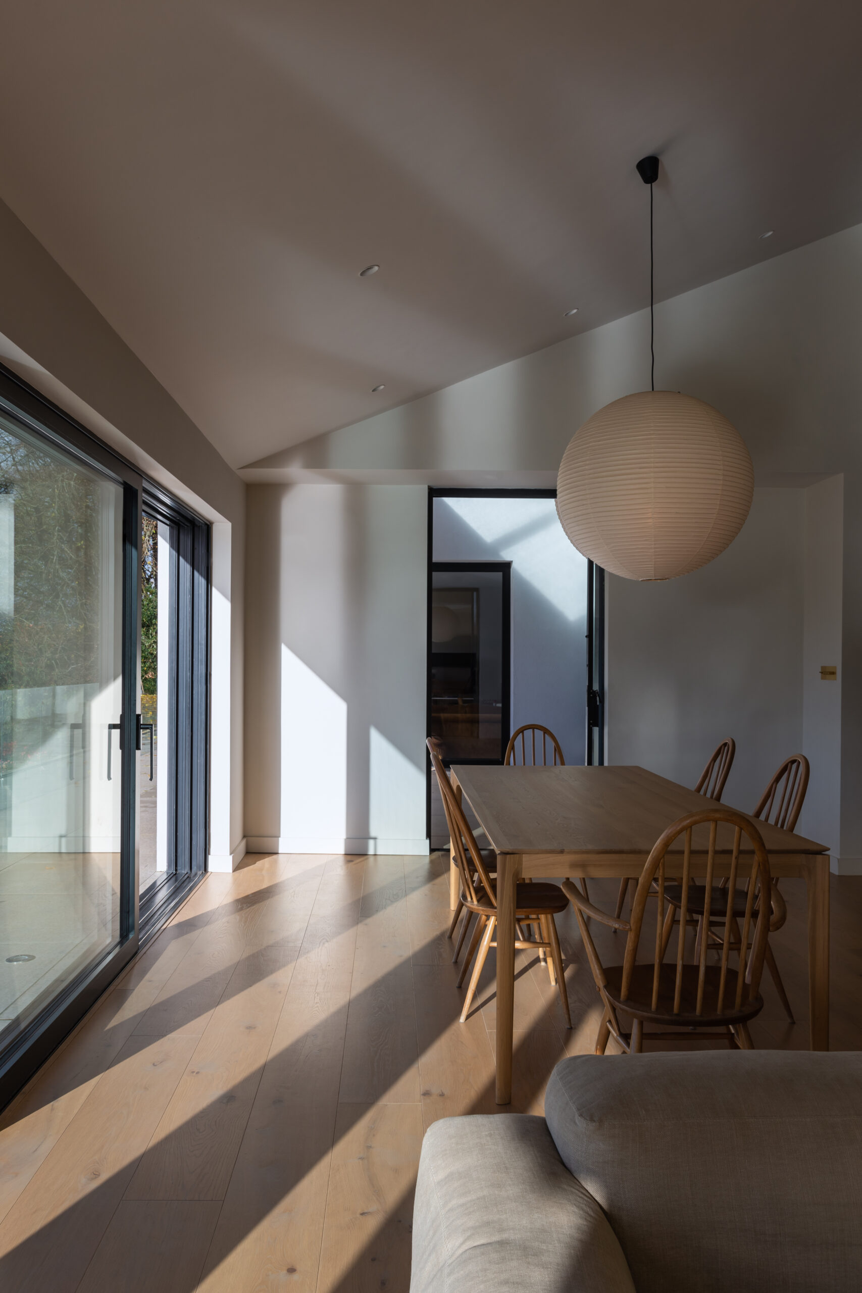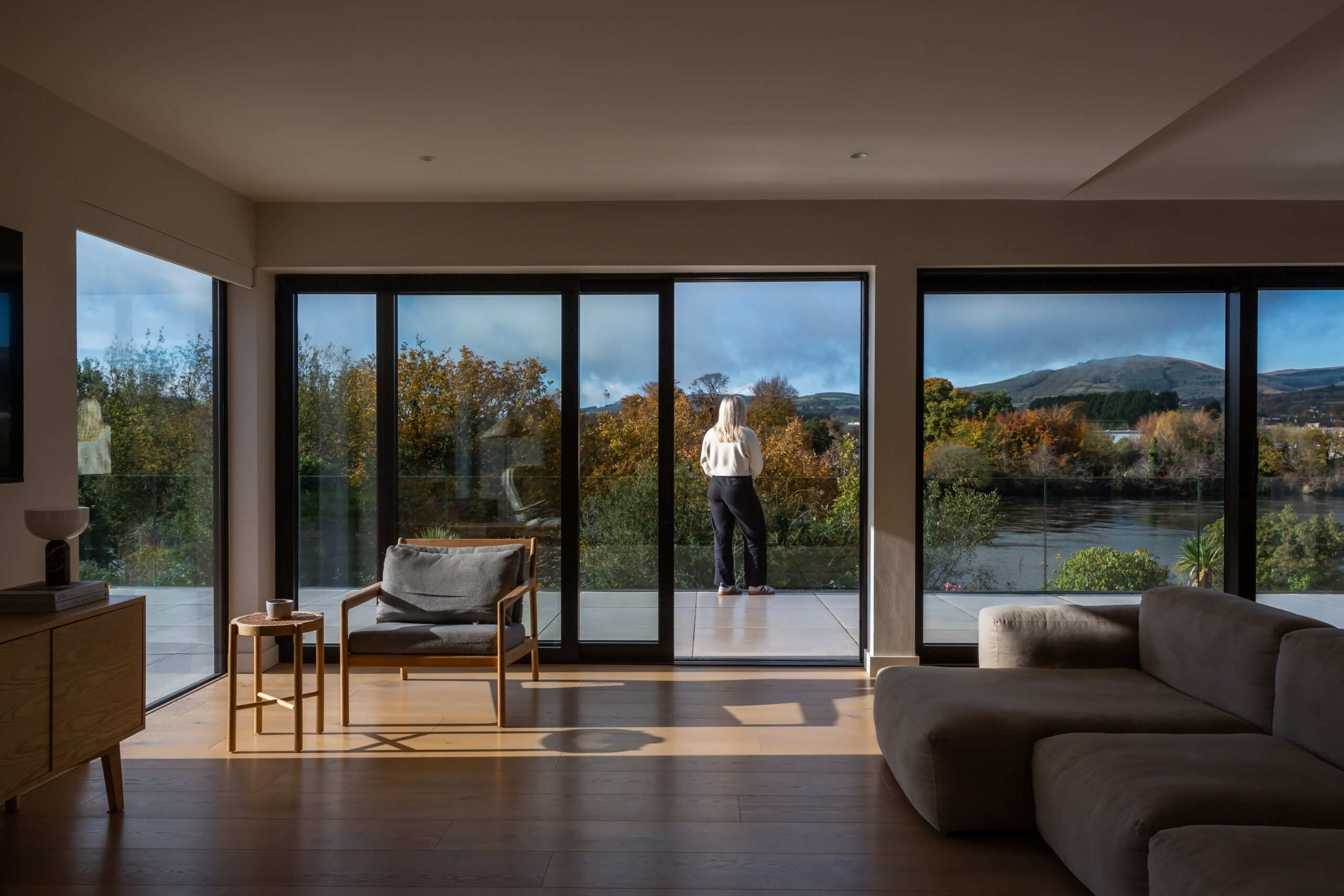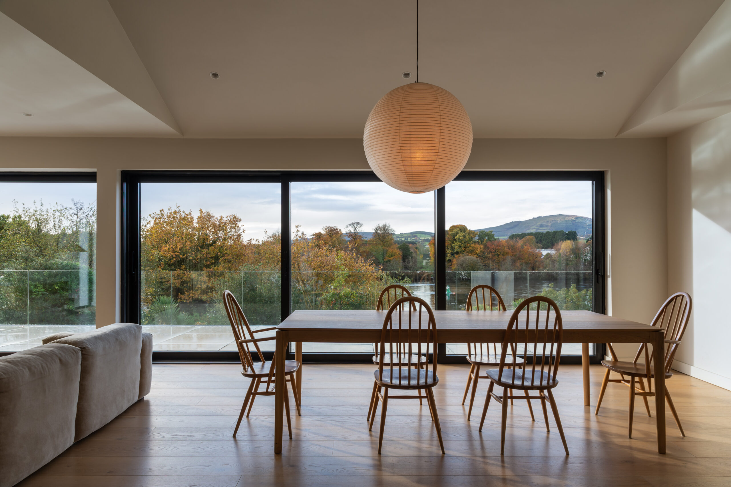 “This project was the refurbishment and extension of a 1970s bungalow along the River Shannon,” explains Rachel Carmody of Rachel Carmody Design. “The original house had a protruding gable, which we removed to simplify the form and emphasise its linear character. A modest 3m extension at the southern end gently lengthens the line while keeping the overall shape intact.”