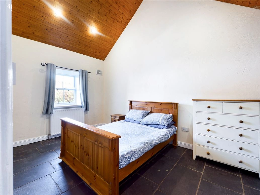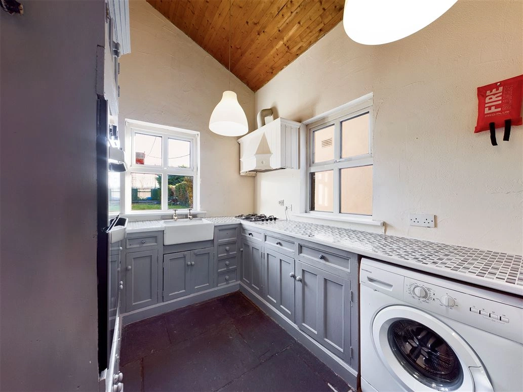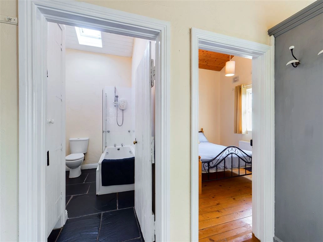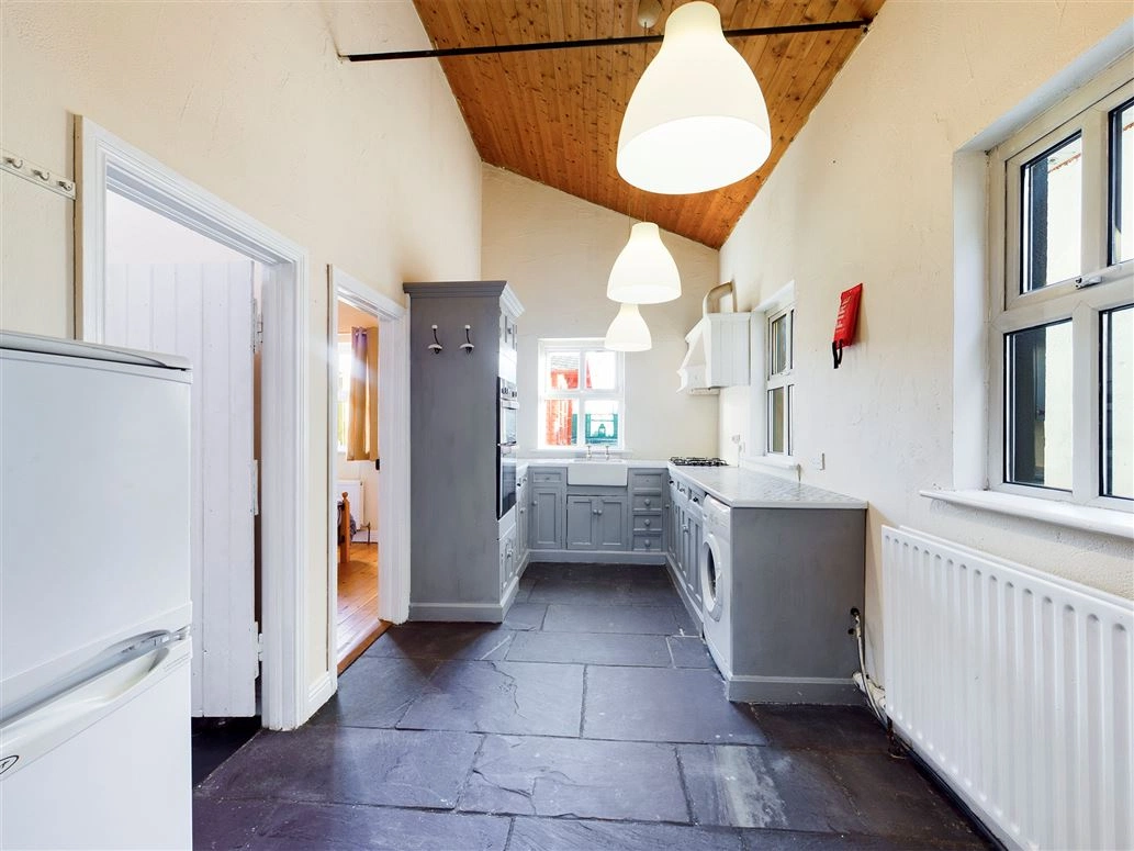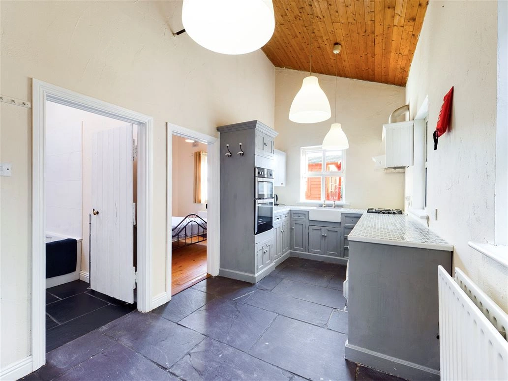 The kitchen can be found off this room. This room has a wooden ceiling with dark-coloured slate on the floor. Though quite cosy and compact, there is plenty of storage space with presses lining two sides of the wall. Other highlights include a Belfast sink, a built-in oven/microwave and distinctive ceramic tiling on the countertop.