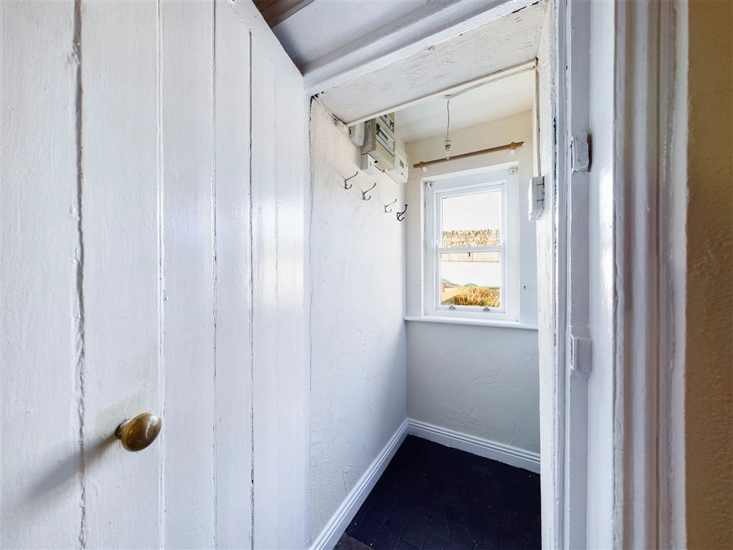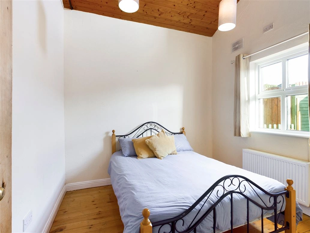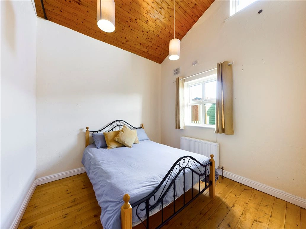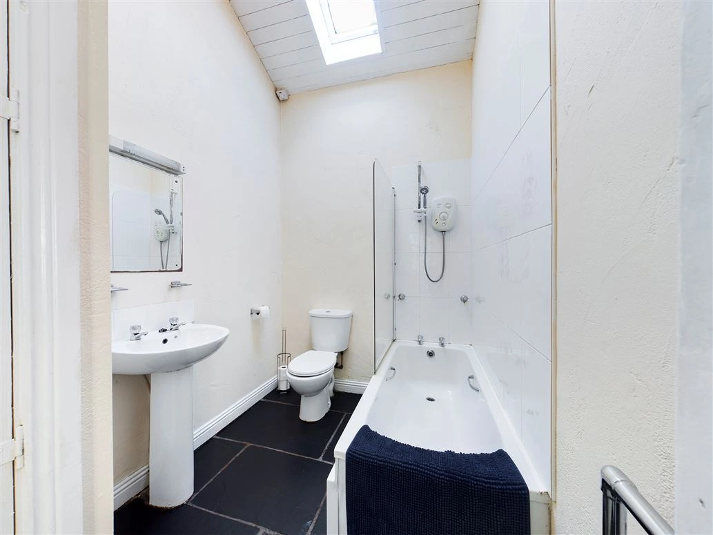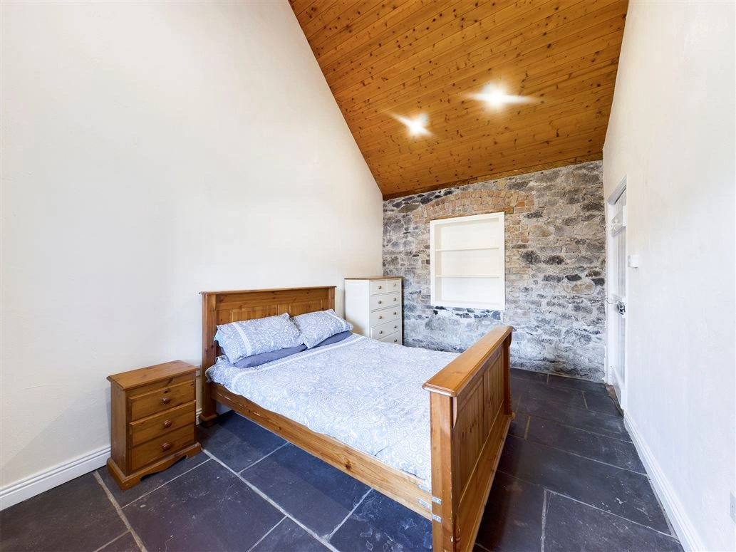 The kitchen can be found off this room. This room has a wooden ceiling with dark-coloured slate on the floor. Though quite cosy and compact, there is plenty of storage space with presses lining two sides of the wall. Other highlights include a Belfast sink, a built-in oven/microwave and distinctive ceramic tiling on the countertop.