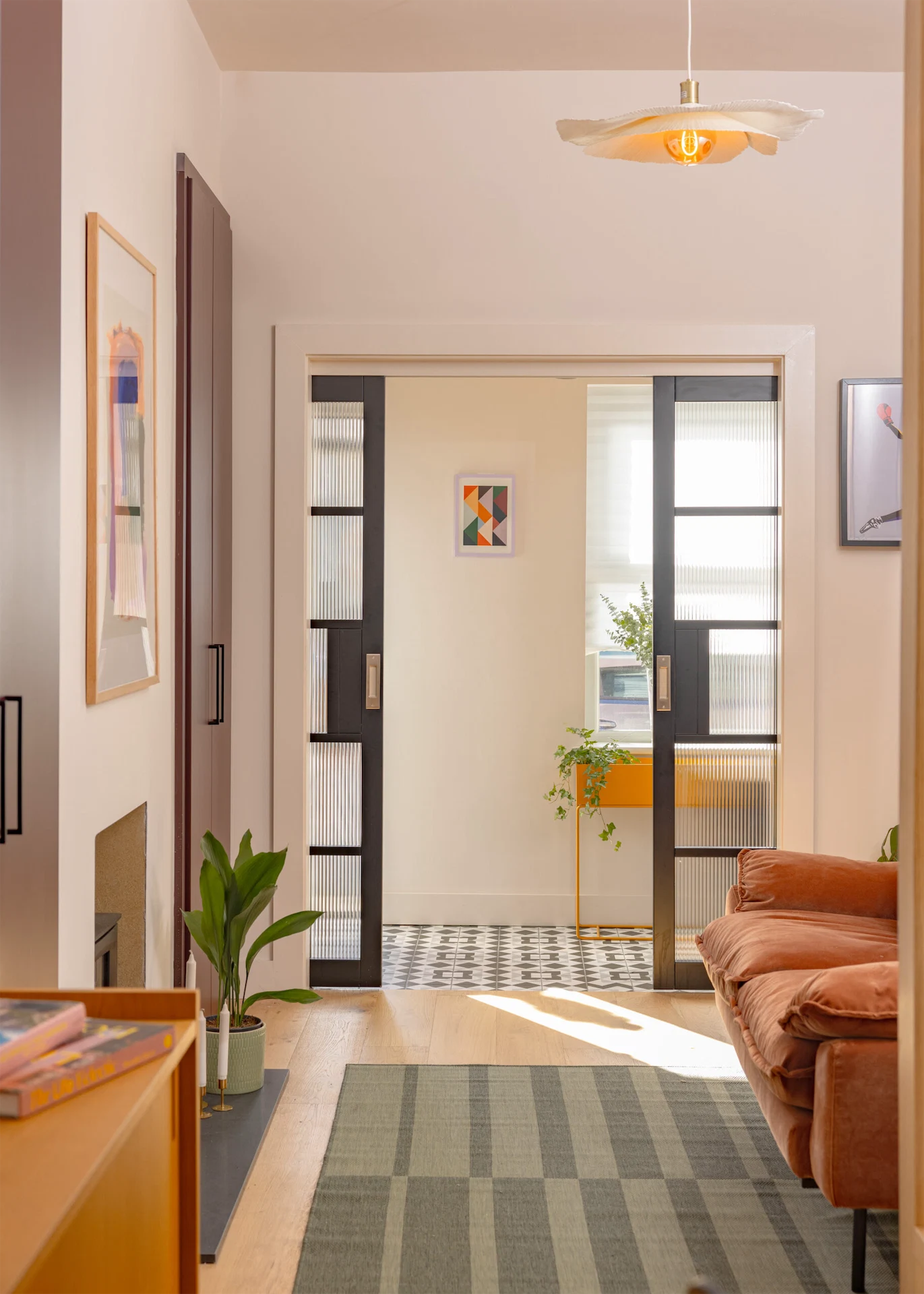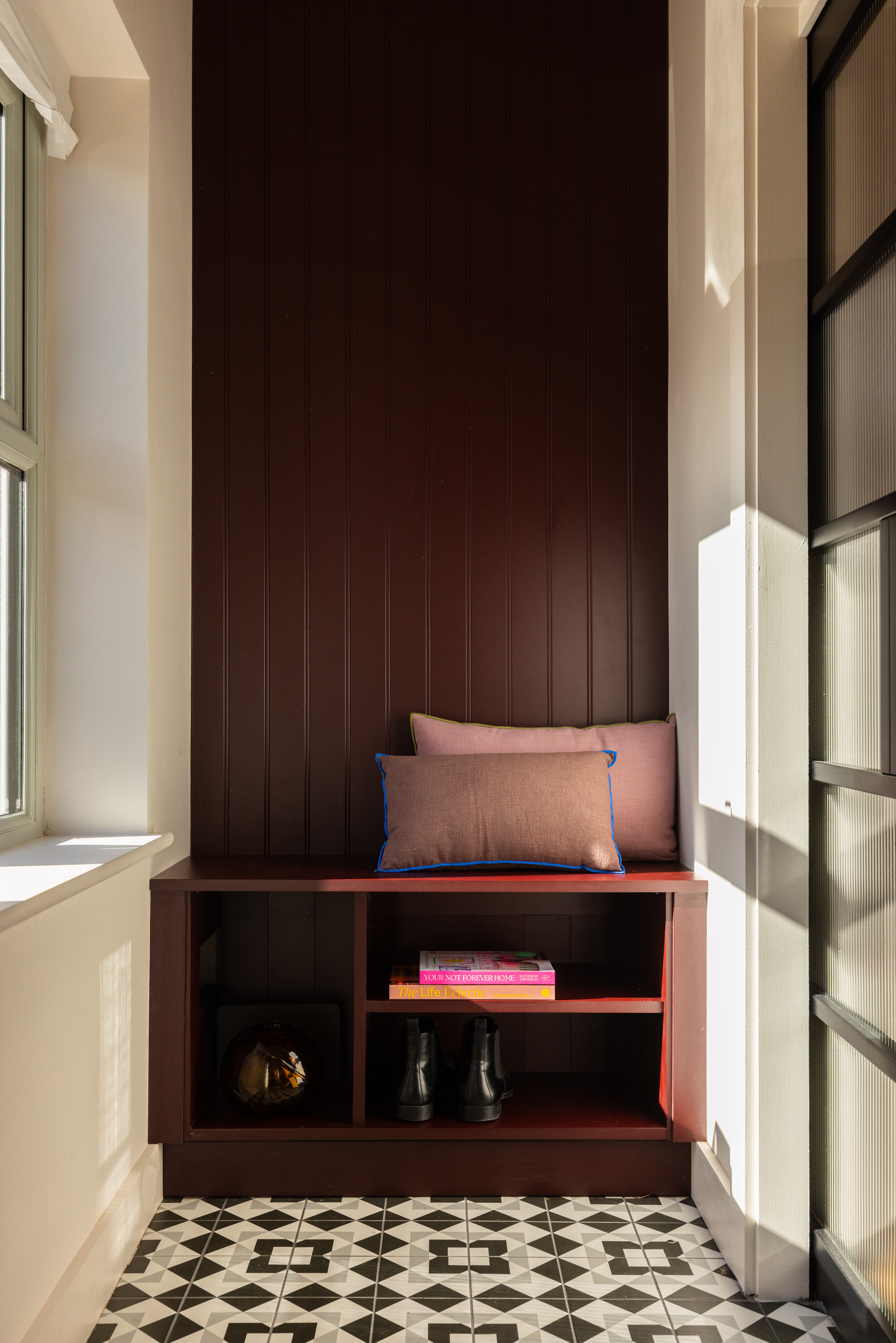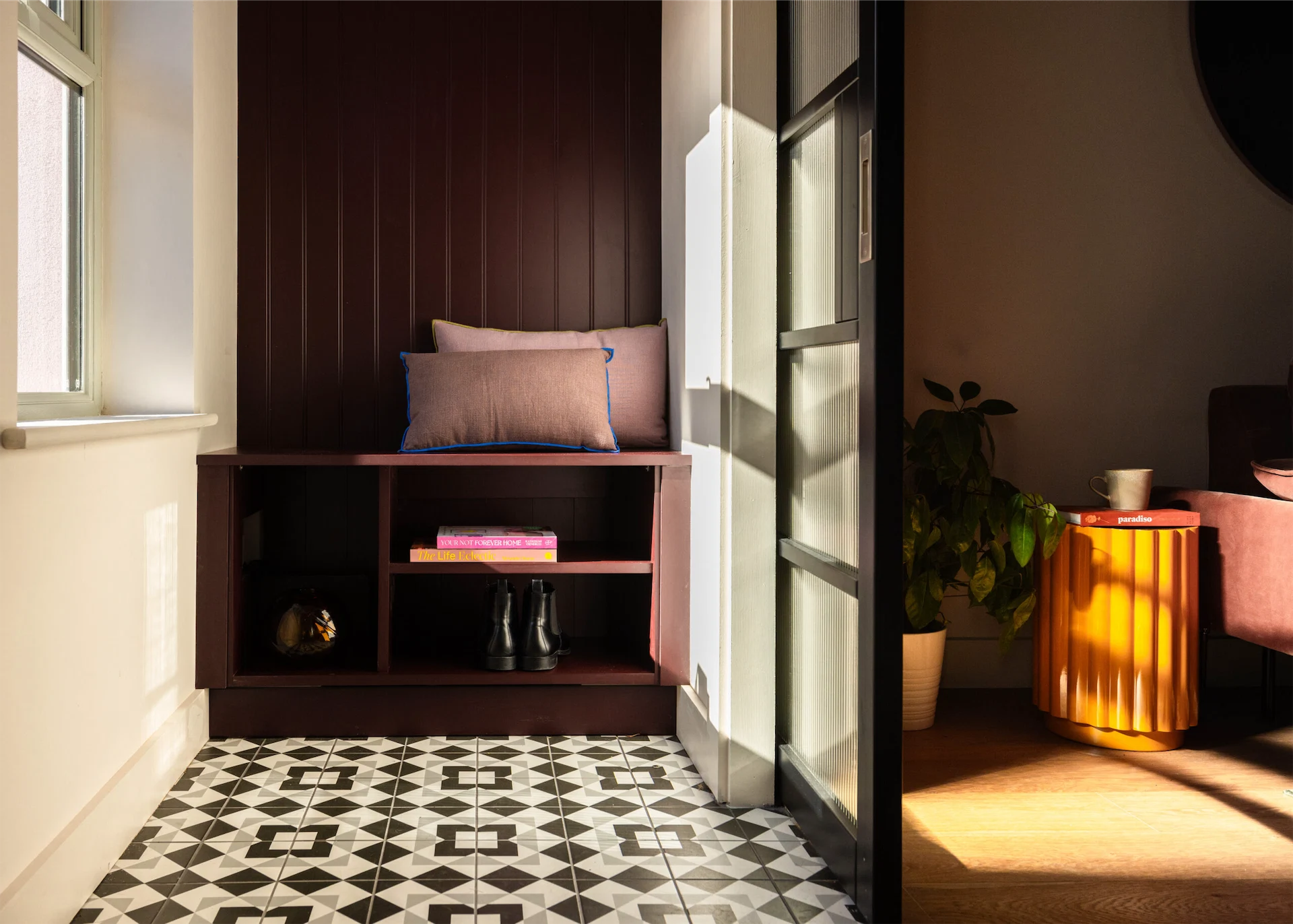 “The tall bespoke wall panelling we designed draws your eye up, emphasising the beautiful, original high ceilings,” Emma explains. “This unit also features a bespoke bench and open shelving beneath for stowing away their shoes. Space saving pocket doors recess into the walls – the reeded glass panels creates the perfect balance of privacy while ensuring light travels through.”