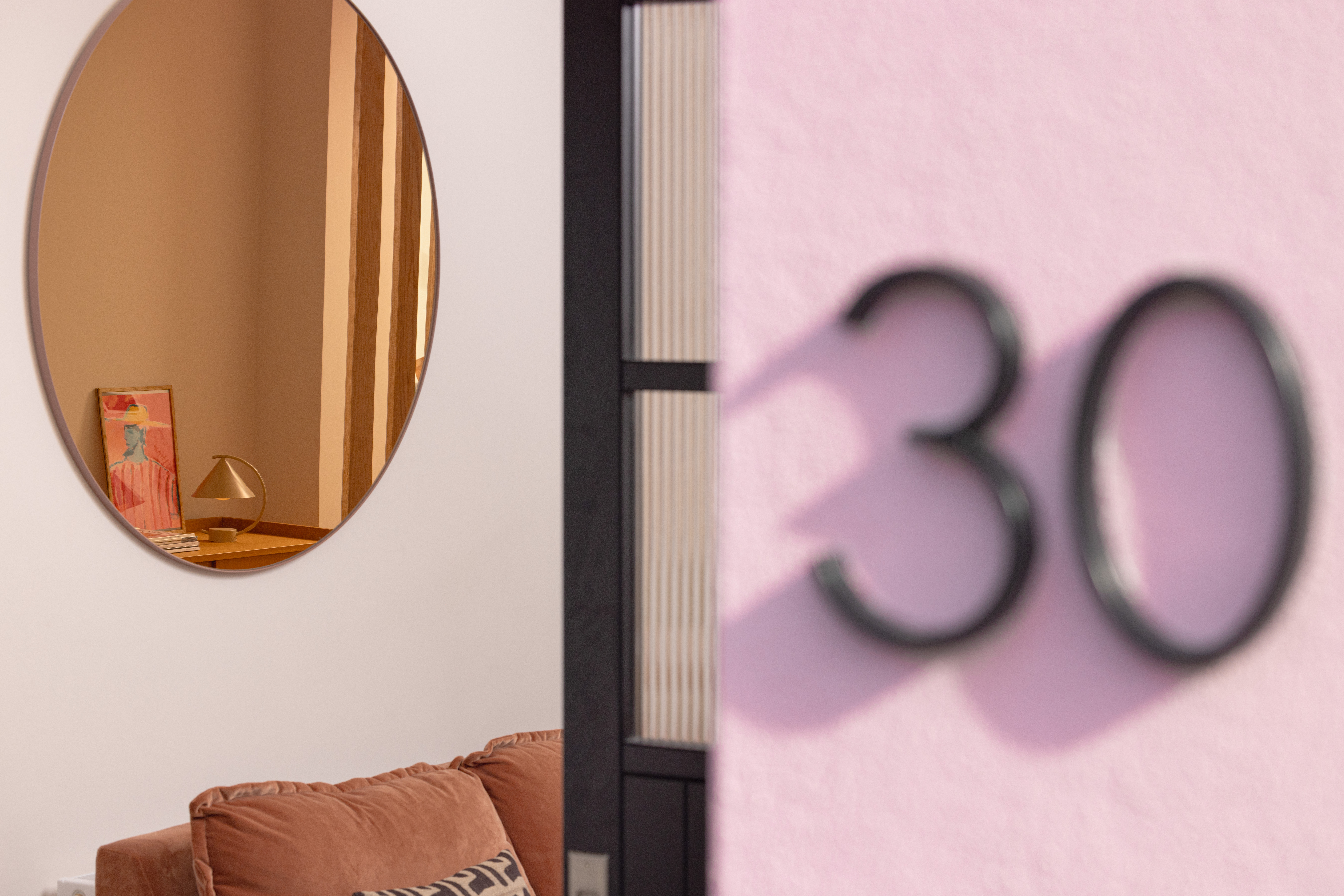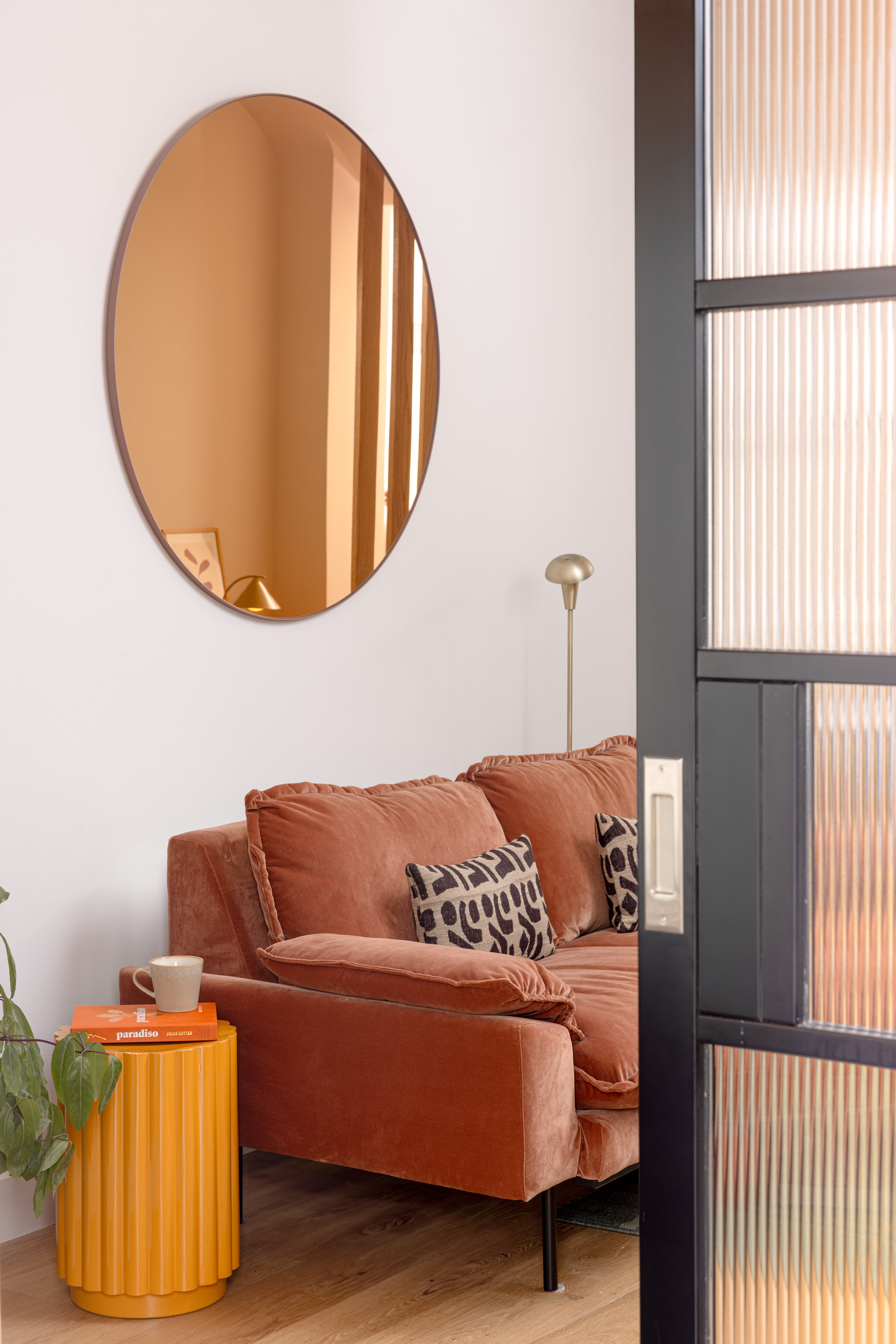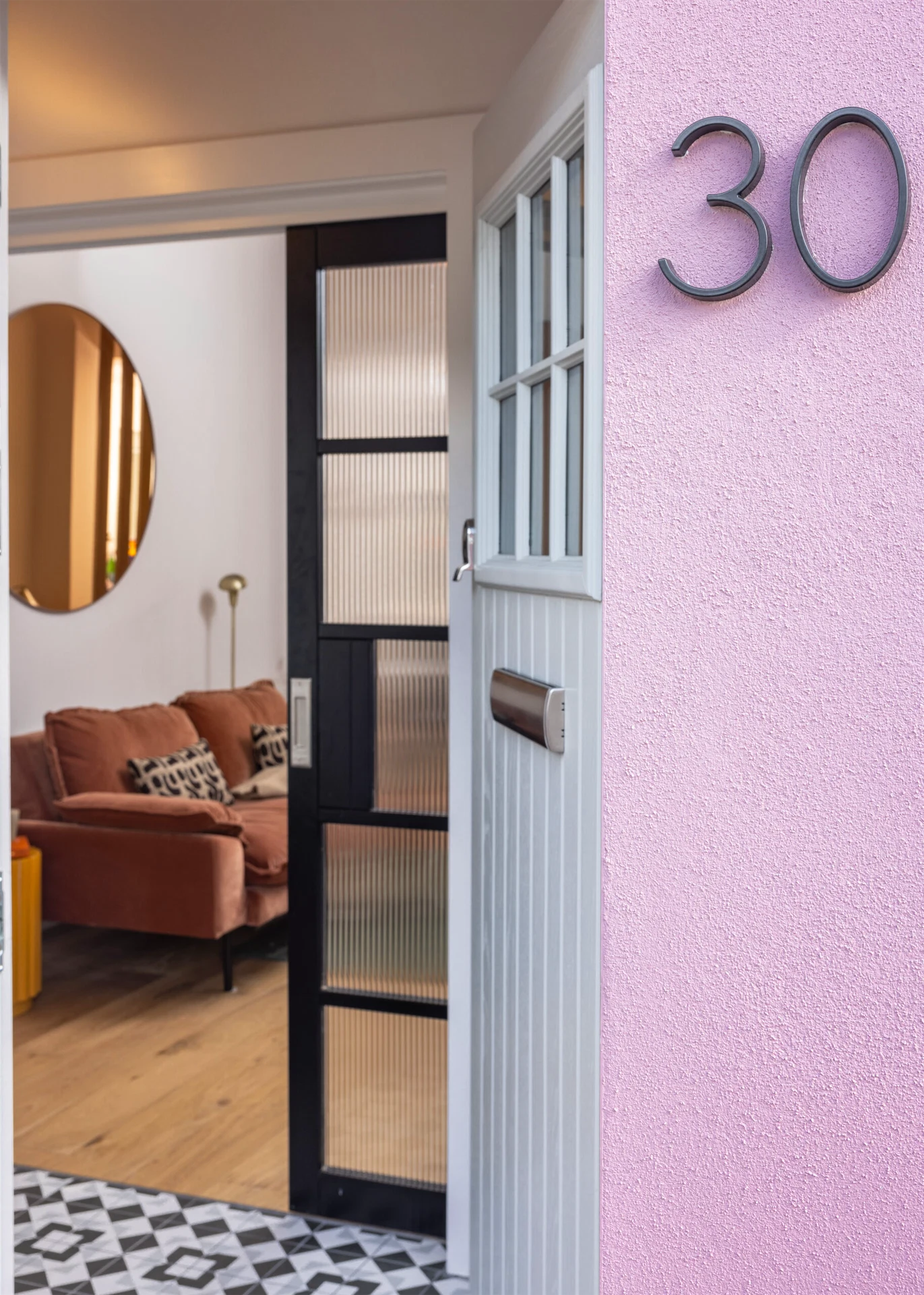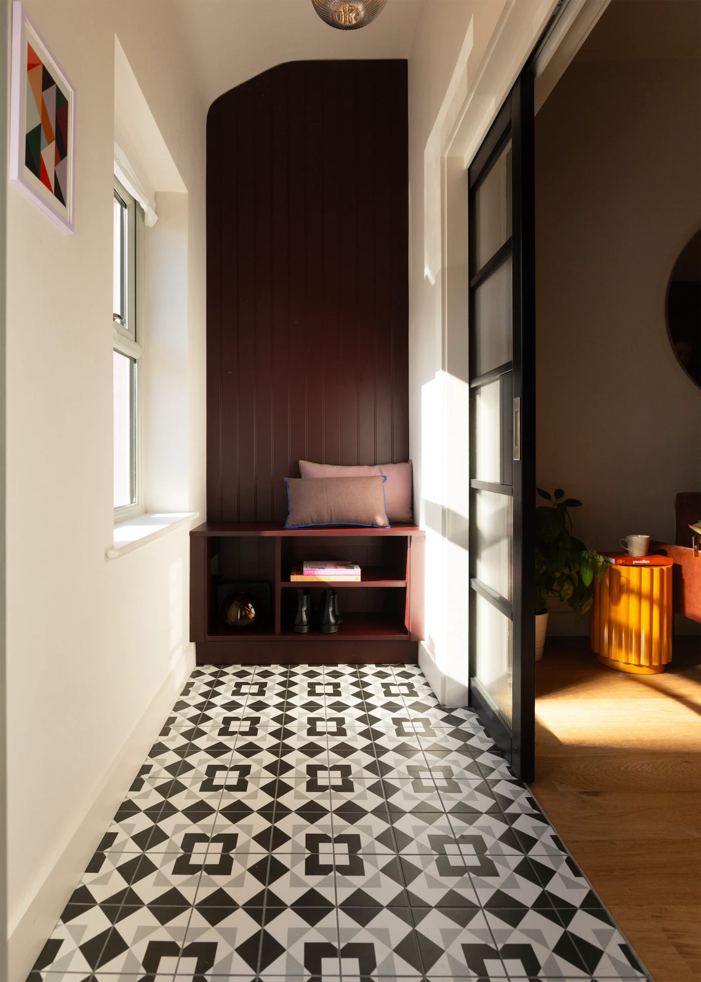 “The tall bespoke wall panelling we designed draws your eye up, emphasising the beautiful, original high ceilings,” Emma explains. “This unit also features a bespoke bench and open shelving beneath for stowing away their shoes. Space saving pocket doors recess into the walls – the reeded glass panels creates the perfect balance of privacy while ensuring light travels through.”