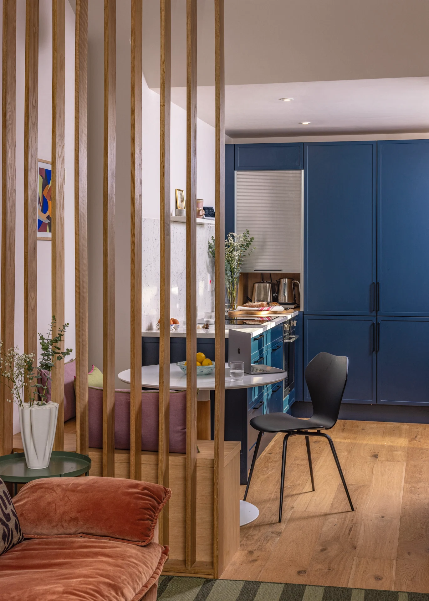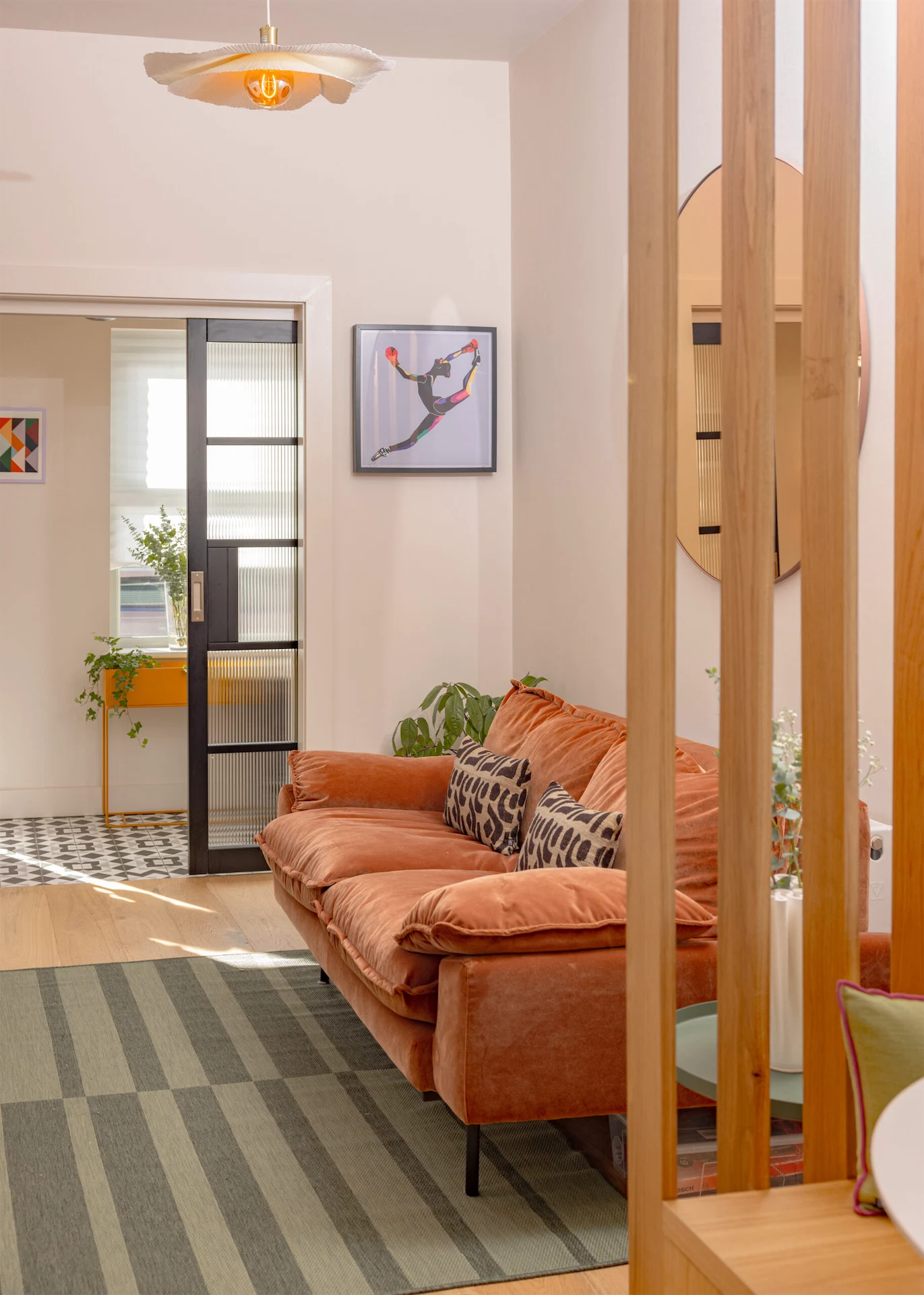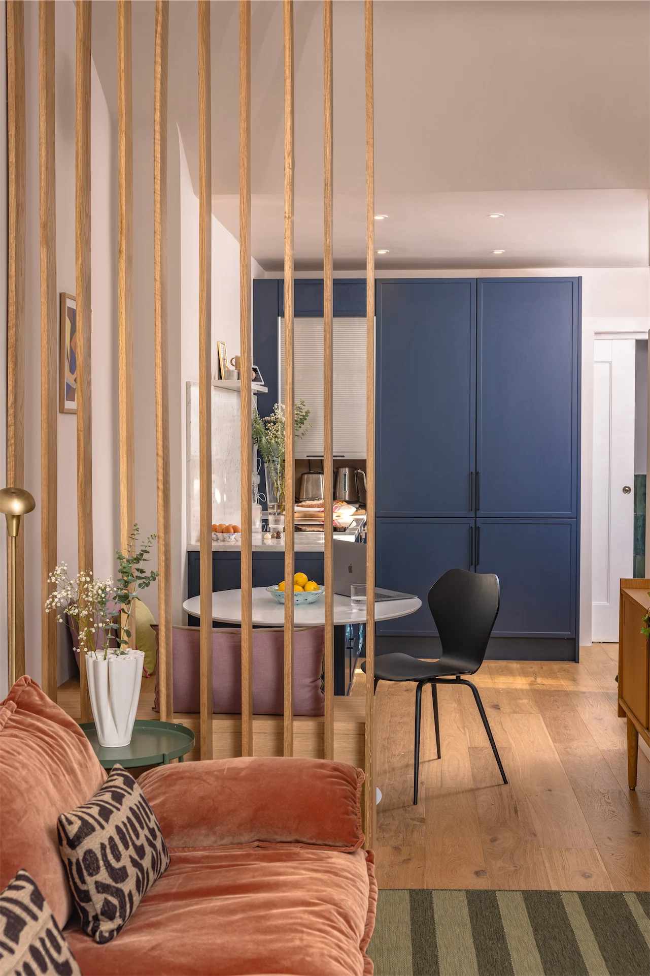 Olwyn and Luke love cooking, and wanted a space where they could cook while chatting to guests. “Once two separate rooms, we suggested connecting the kitchen and living area, creating an open plan layout,” Emma says. “We proposed and designed the addition of a bespoke slatted, oak room divider which frames the dining area nicely and acts as a subtle separation between the dining area and the living area.”