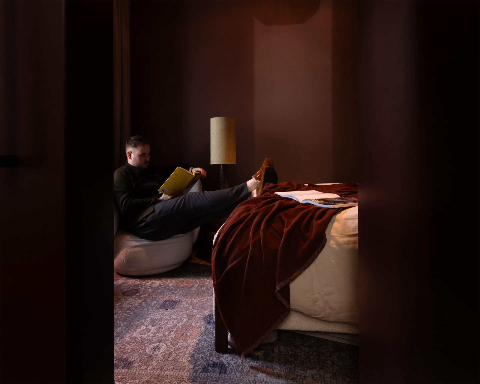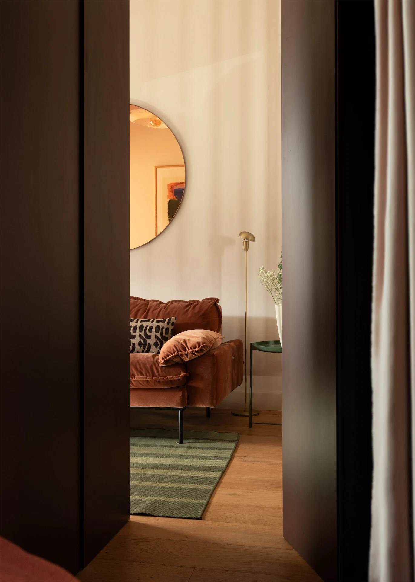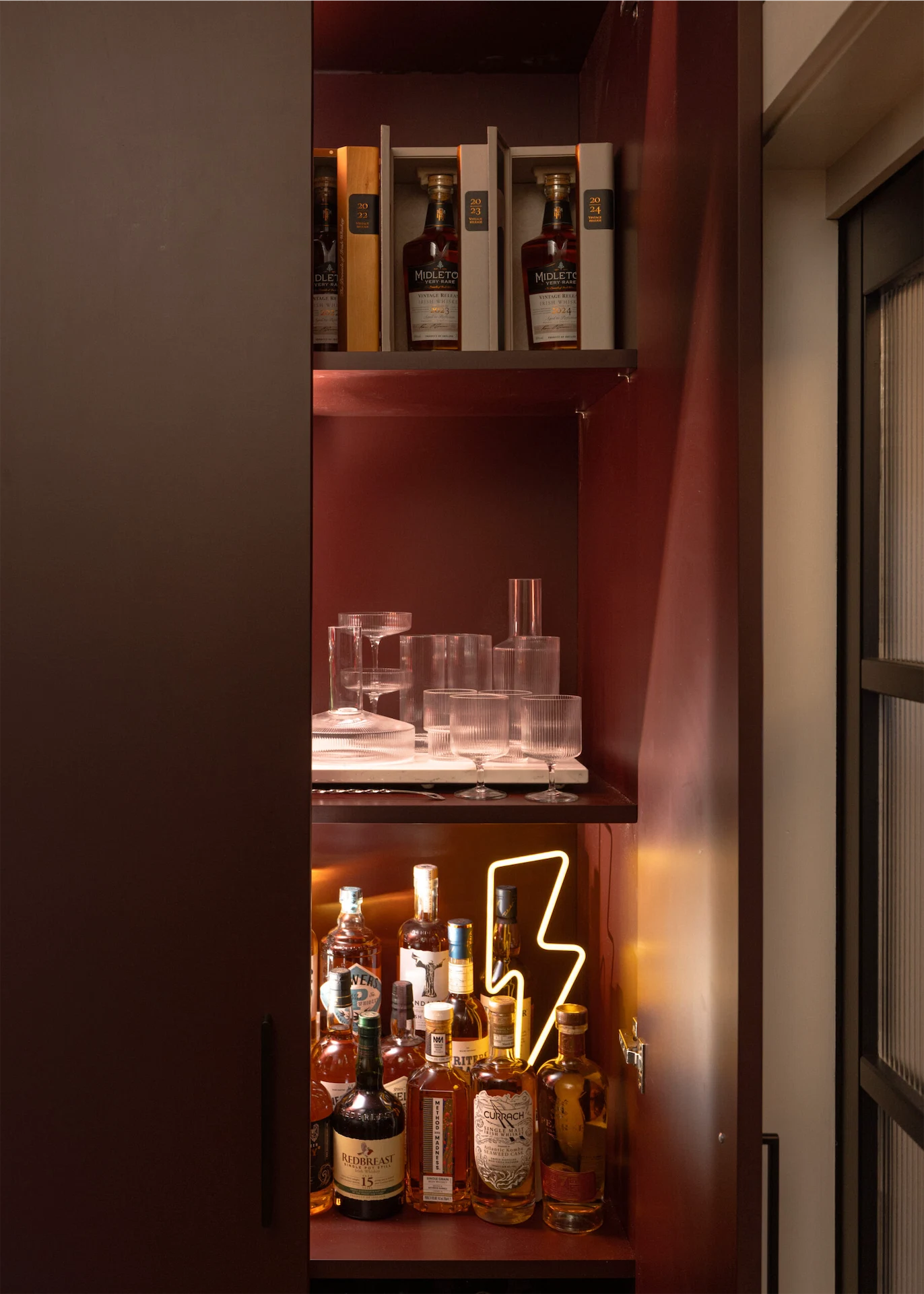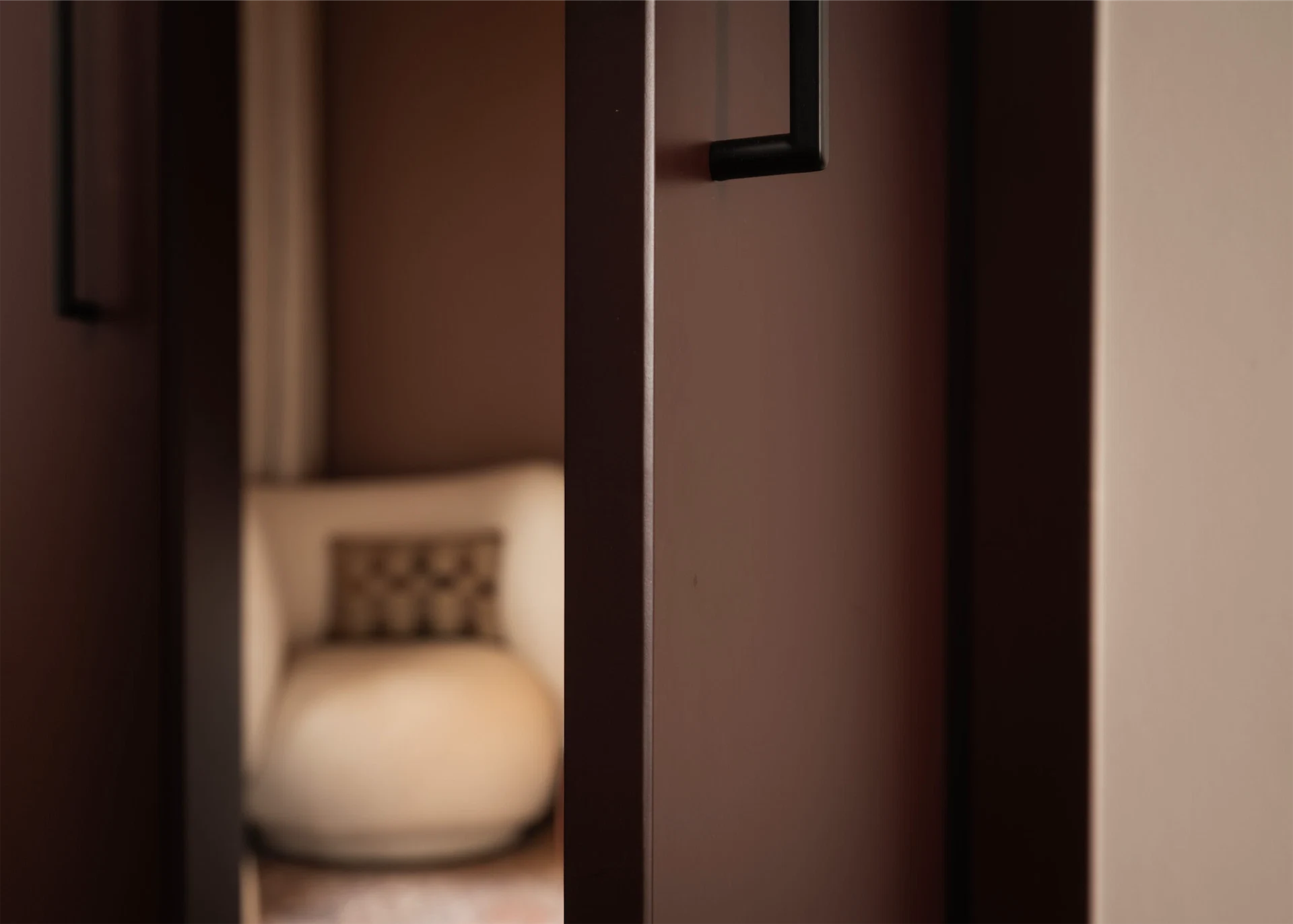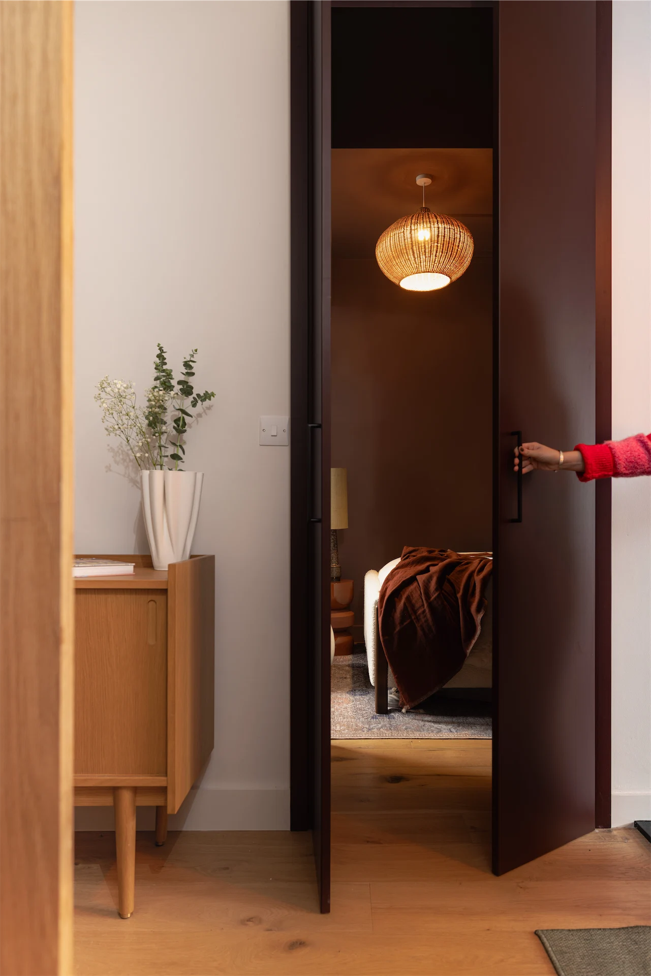 One of Emma’s favourite aspects of this design is the secret door to the main bedroom. “We changed locations of door swings of the original floorplan and incorporated the concept of a secret door to which leads to their main bedroom. The idea of this was to create more novelty to the space, while also giving our client the opportunity of having a more sizable wardrobe space where the original door was to the main bedroom. It offers all visitors a pleasant surprise when they open it to find the doors lead to another room!”