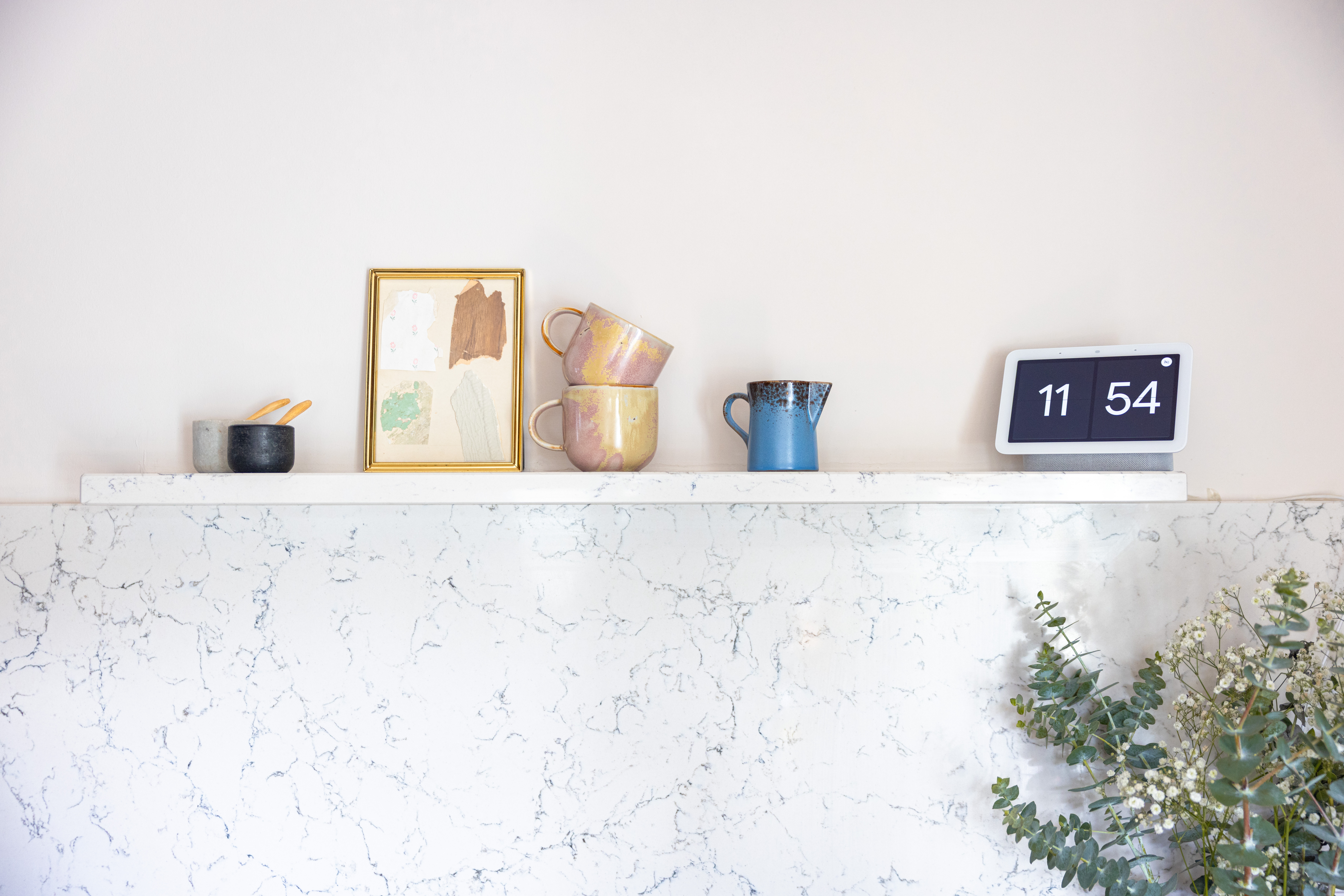Units in the kitchen were kept to the lower level, with an open shelf above helping it to feel more open.