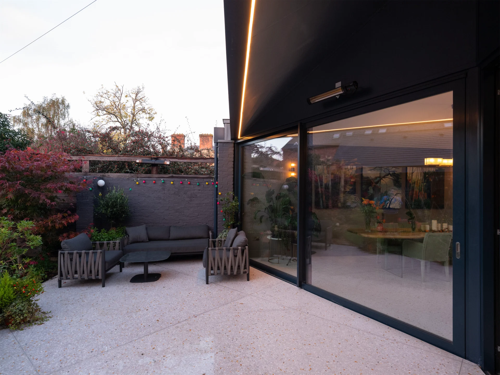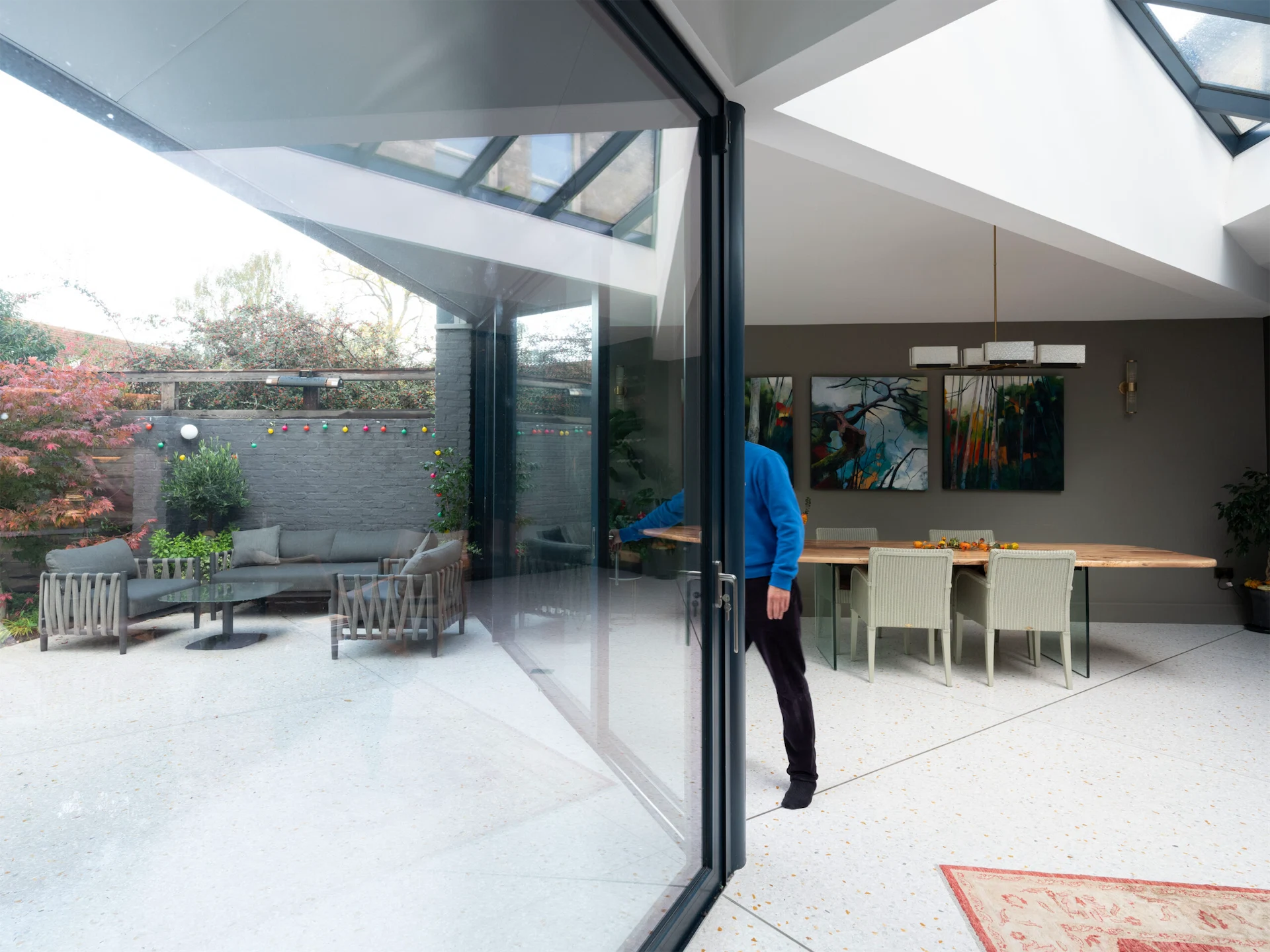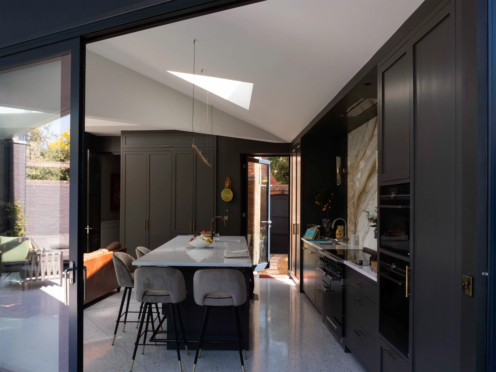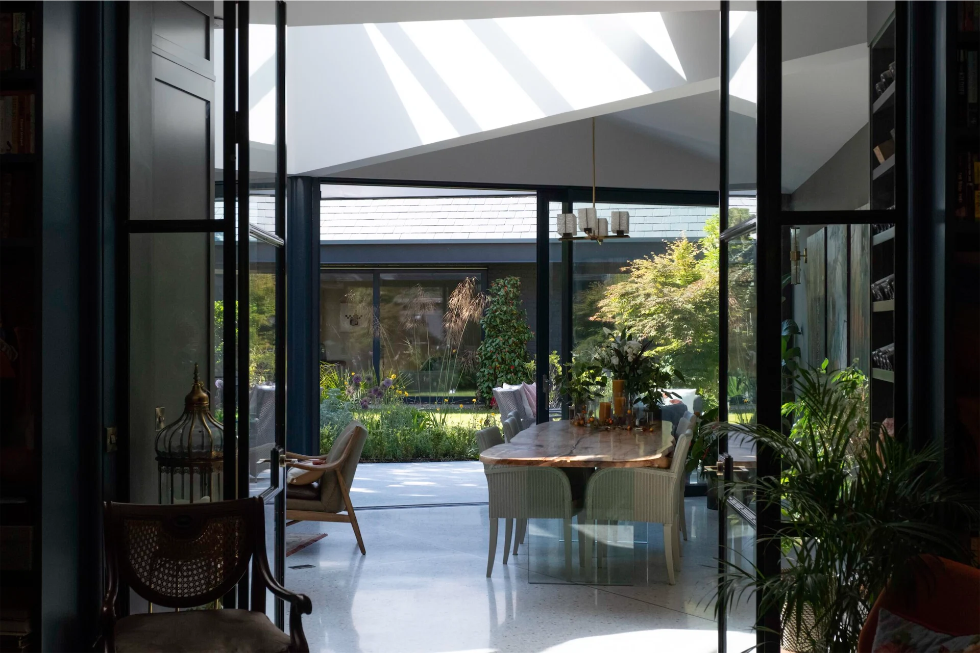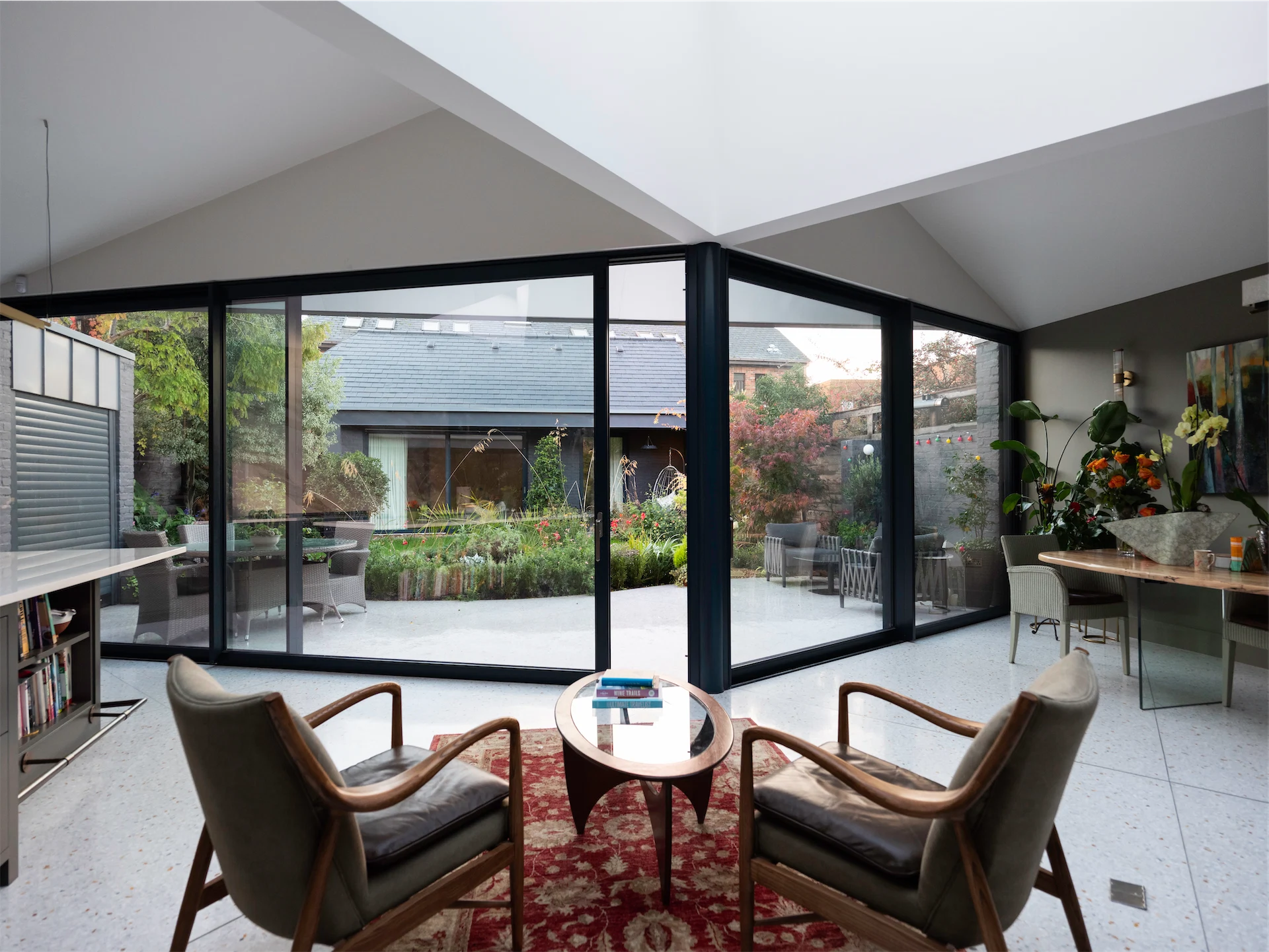 “It is sheltered by a vaulted roof supported by four deep triangular beams meeting on a circular steel column. This column pulls the glass façade and garden inside, while the reflective terrazzo floor continues outside, seemingly pooling at the edge of the planting to create a sheltered external dining area. This spatial and material blurring is deliberate, and further emphasised by large sliding glass screens and rooflights flooding the space with light.”