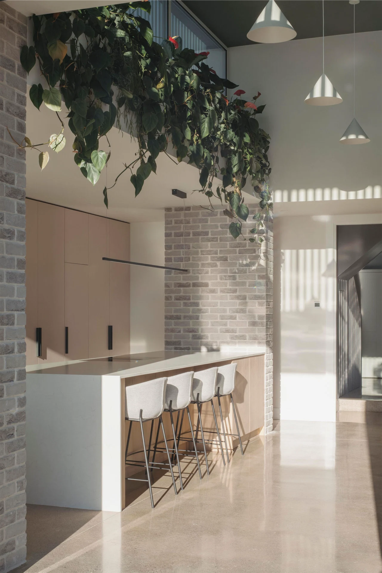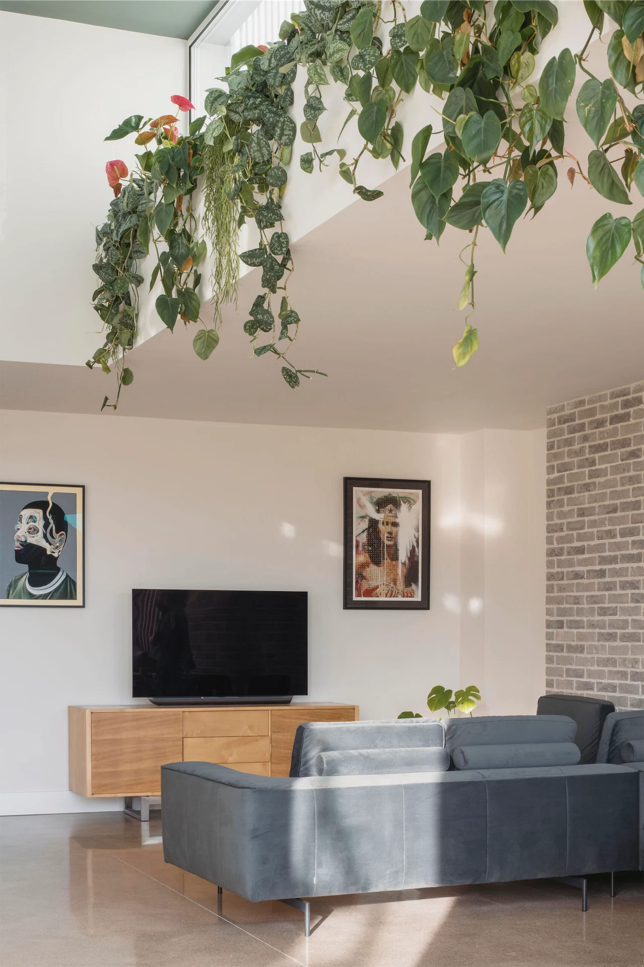 And Cotter’s favourite aspect of the house? The hanging gardens. “We loved the drama of entering the rear room with the diffused light that enters through,” he explains. “But the real star of the show is the planting. Our clients worked with Hopeless Botanics to select plants that were low maintenance and they made maximum impact in the space. They nailed it.