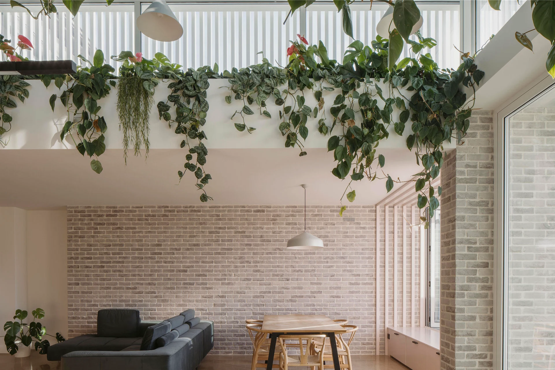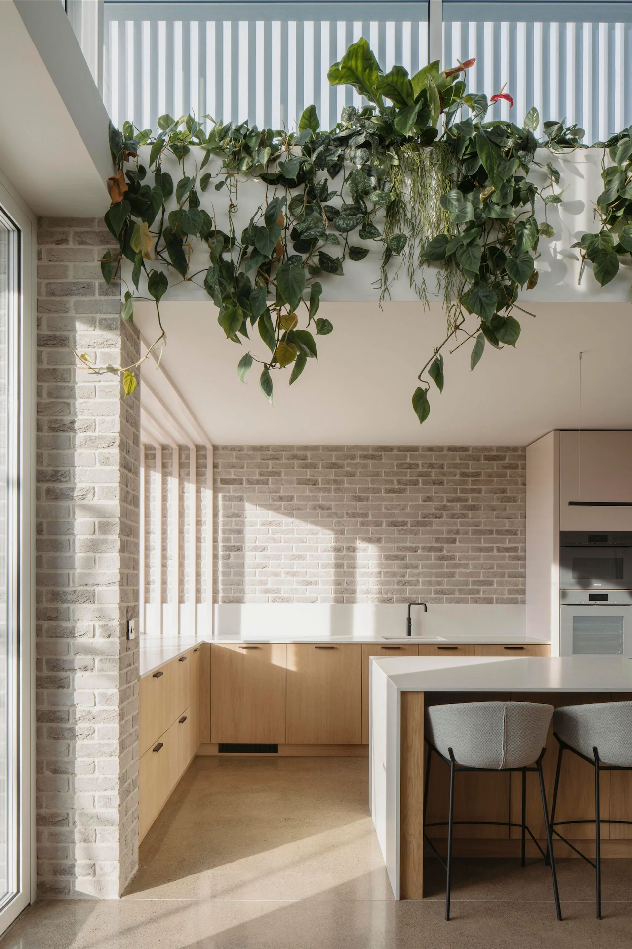 The impressive design focuses on creating a home that is both materially rich and intimately connected to the garden. “The new open plan kitchen/dining/family area to the rear is conceived as a pavilion addressing the south-facing garden and is defined by four deep brick piers with a concrete cornice to provide solar shading,” Cotter says. “This, in turn, supports a central glazed lantern wrapped in an external timber screen. External landscaping details respond to the linear nature of the brick piers. The double height lantern space provides volume, diffused light and incorporates high-level planting, creating a hanging garden.”