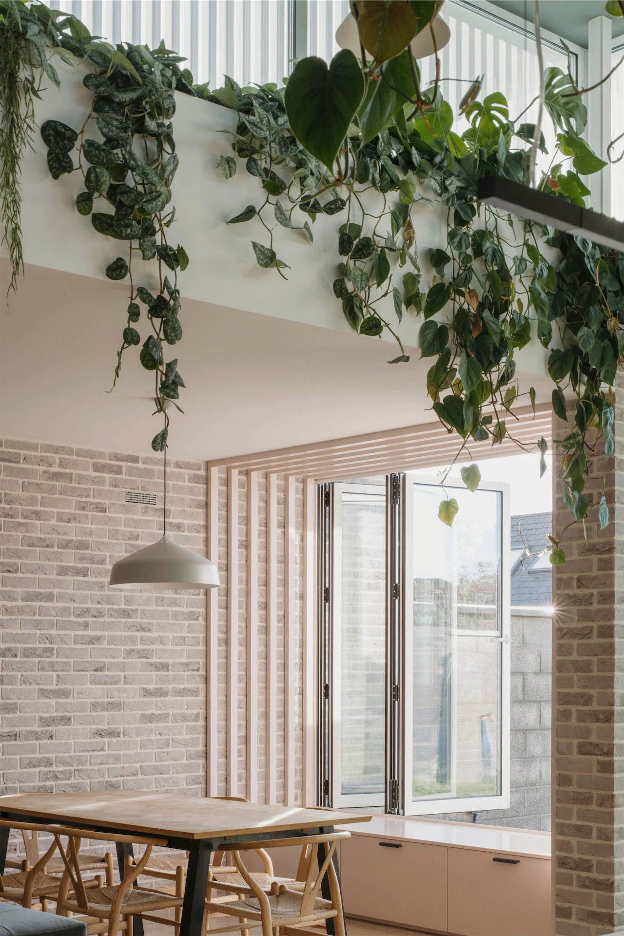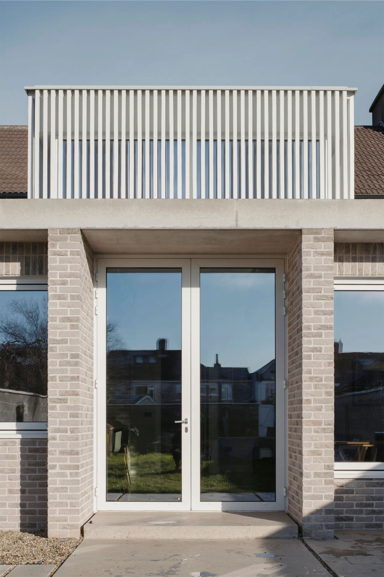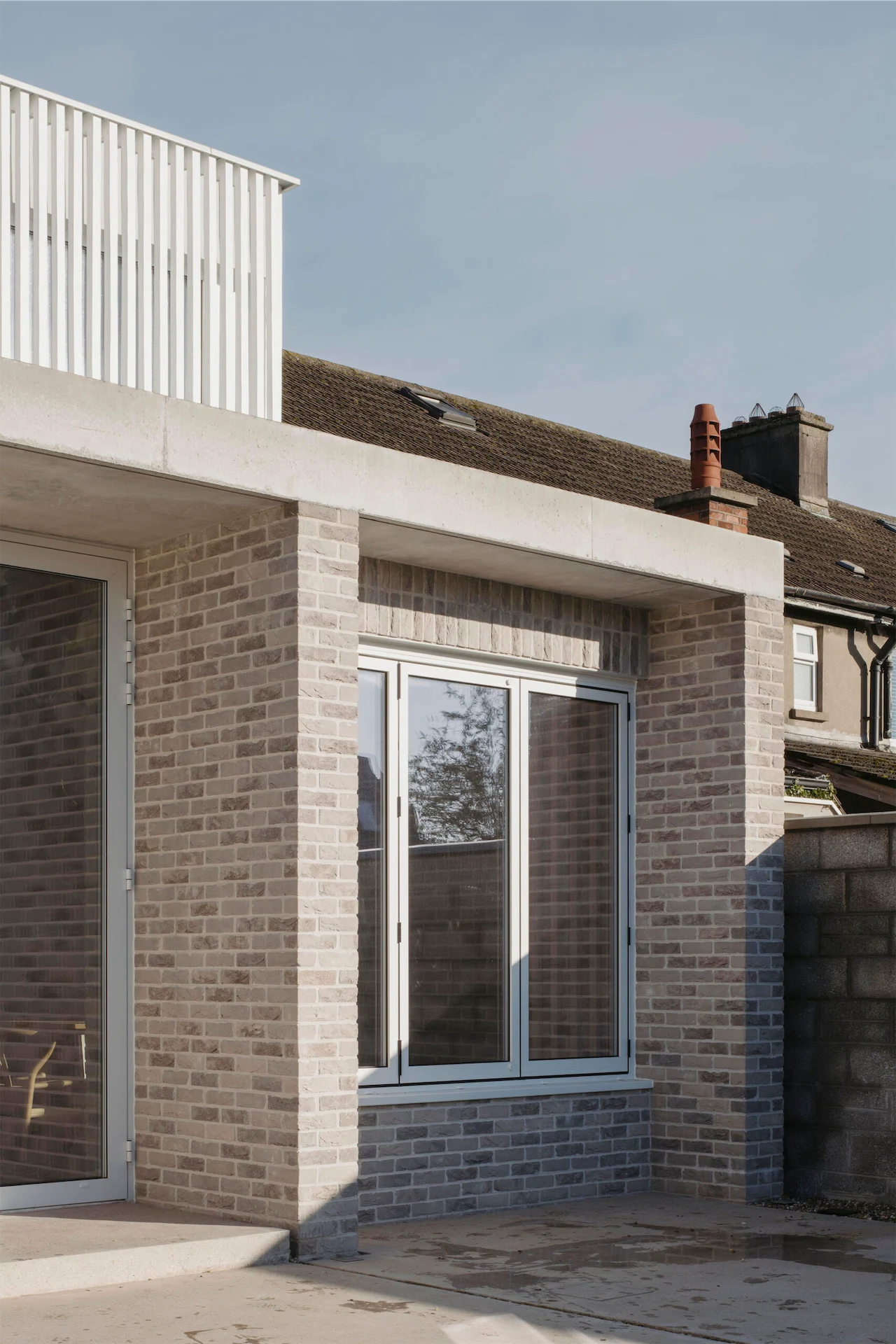 Environmental performance and comfort were also key drivers. “The GGBS concrete cornice supported on the brick piers and timber fins at high level acts as a passive solar shading device,” Cotter explains. “This improves the comfort of the occupants in the summer and removes the need for artificial cooling, while maximising daylight. A new openable roof light has been installed in the existing roof to provide daylight to the hall and stairs while also ensuring cross ventilation for the new spaces.”