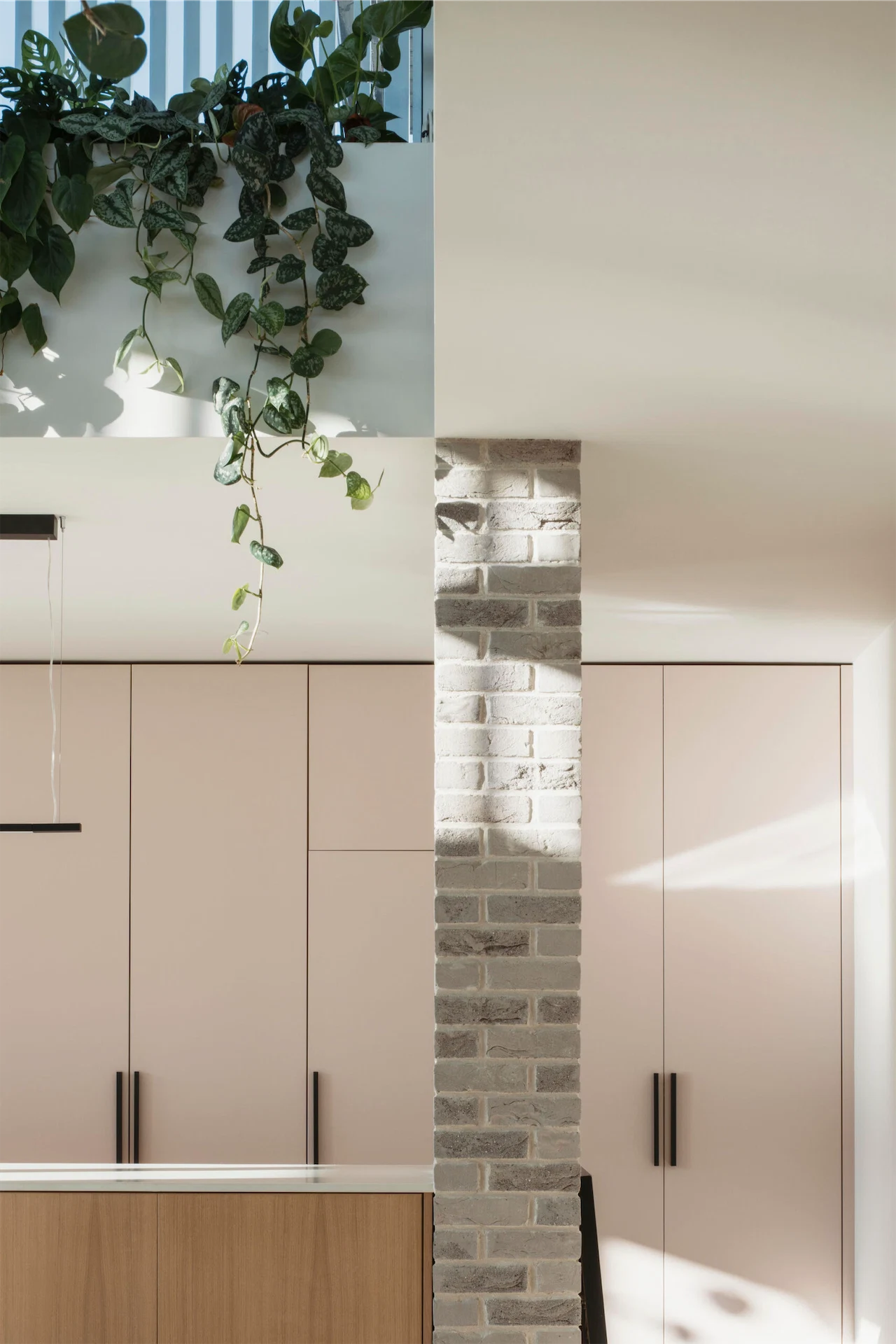 To soften the industrial edge and ensure the home felt warm and inviting, a combination of oak and pale pink was introduced in the kitchen. “With these two elements, there was a danger that the whole space could feel too cold,” Cotter says. “The introduction of a mixture of oak and pale pink into the kitchen ensured this was not the case.”