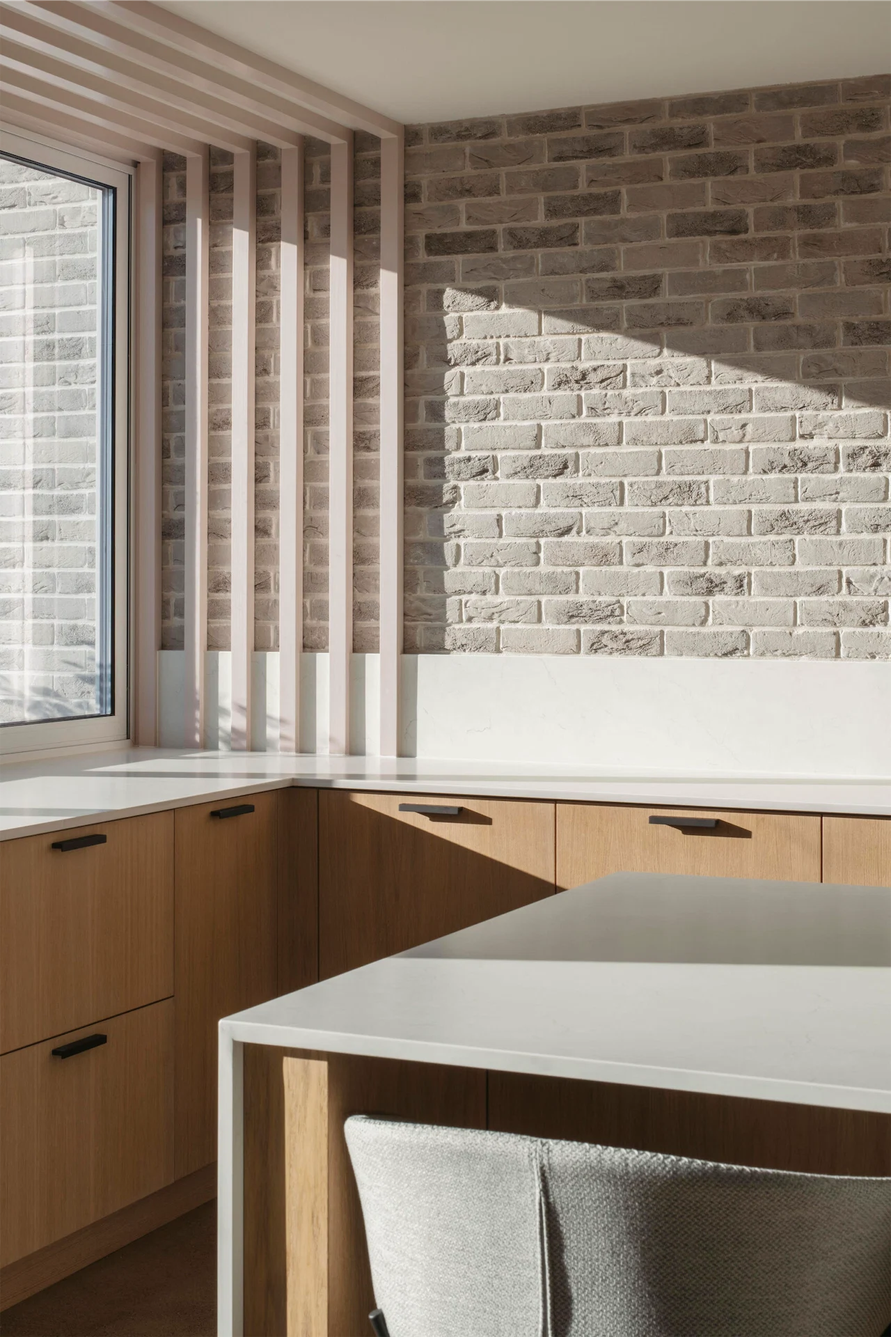 The result is a balanced palette where raw, structural materials meet warmer, softer tones, bringing both character and comfort to the heart of the home.