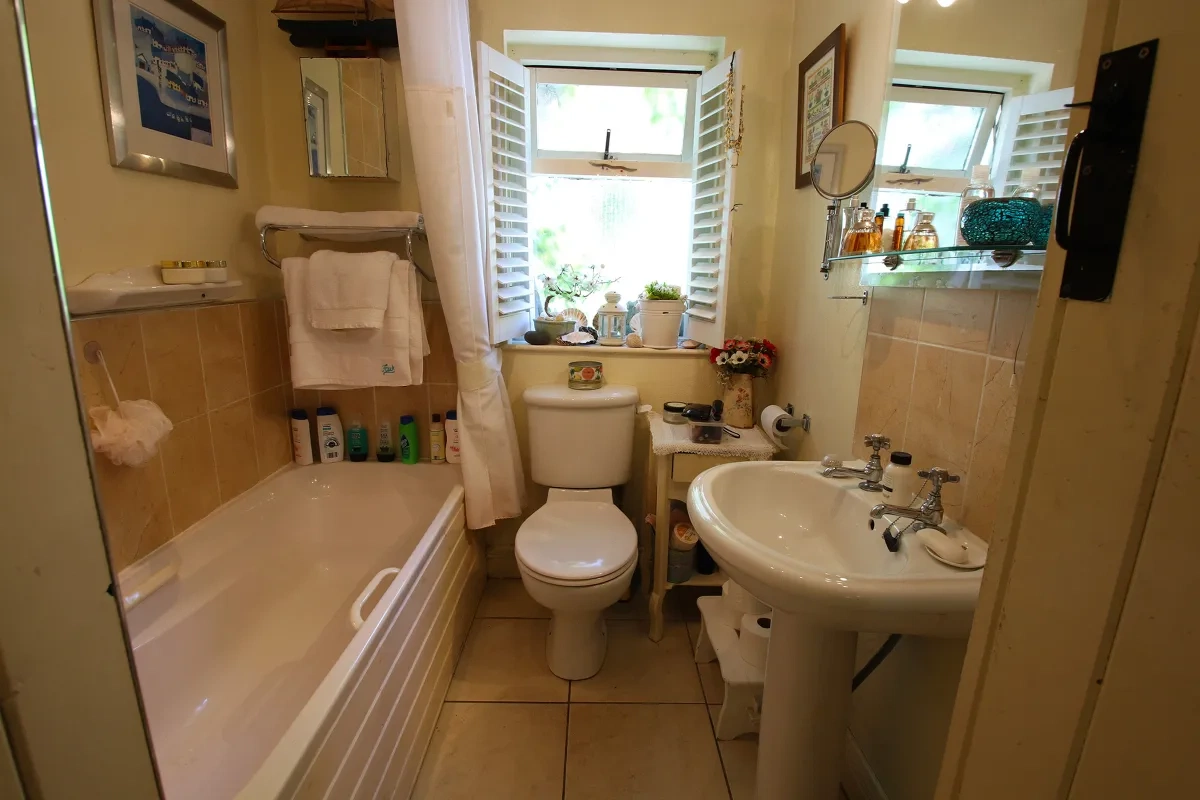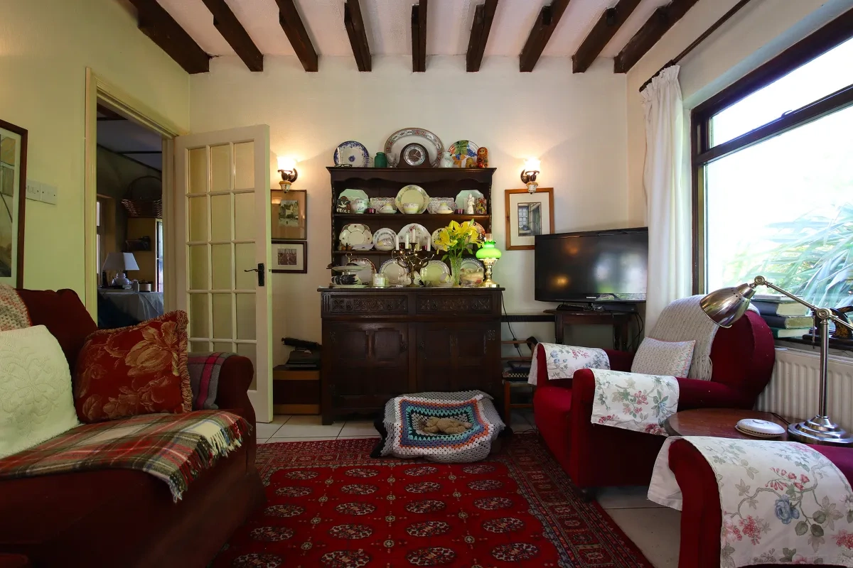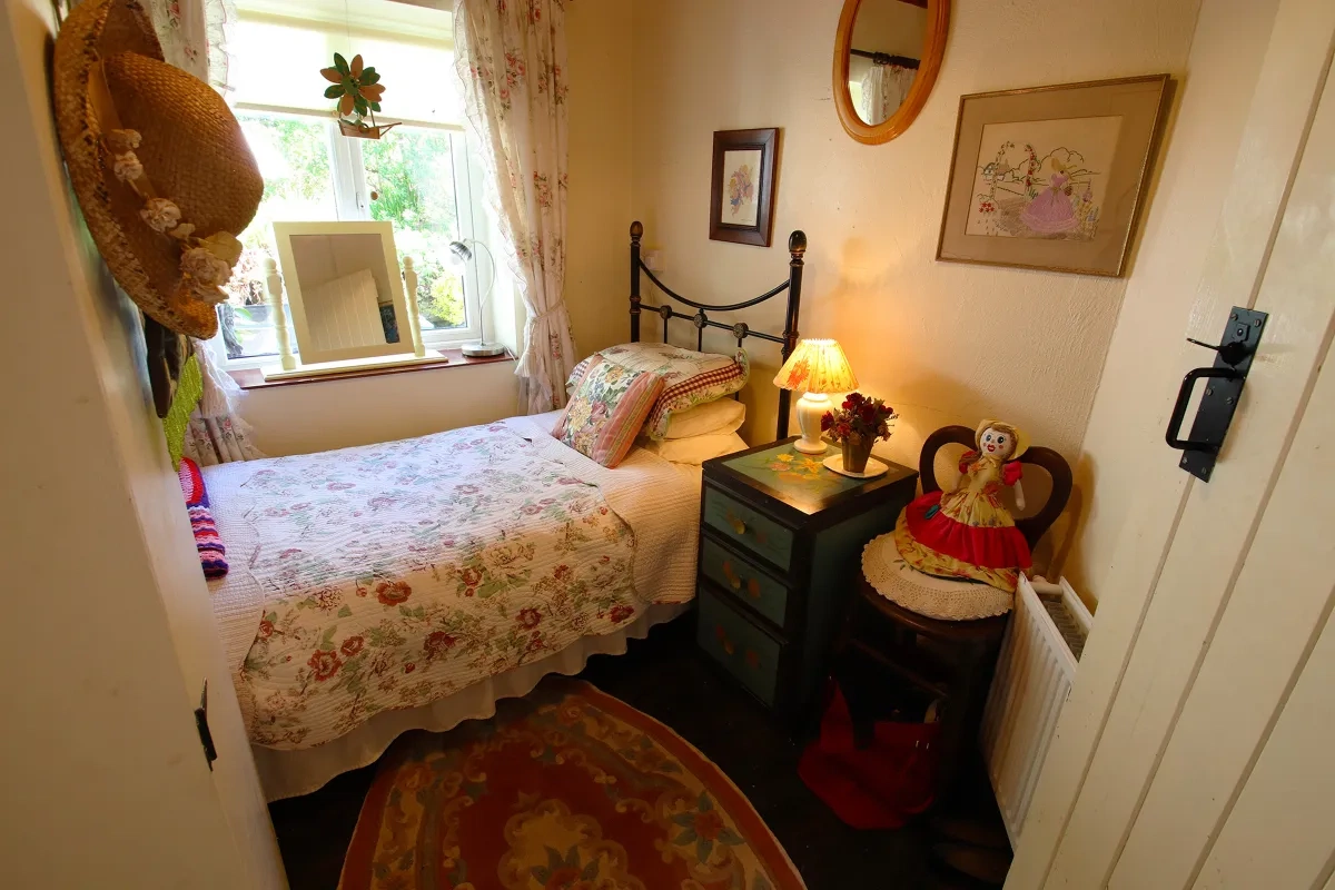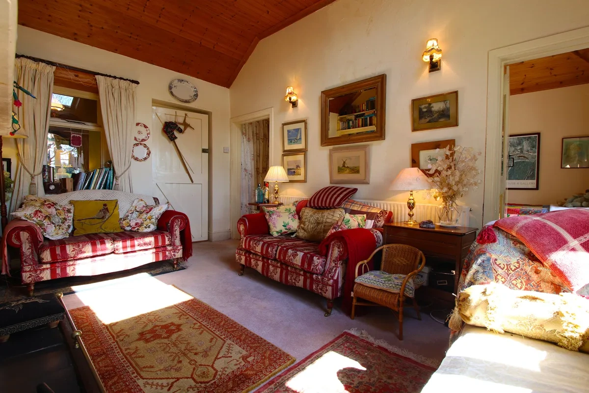 The welcoming and cosy accommodation extends to a sizable 970 sq.ft and consists of two reception rooms, a kitchen-cum-dining room together with four bedrooms. A neat stone wall marks the entrance to the property, with a short gravel drive leading up to the red front door.