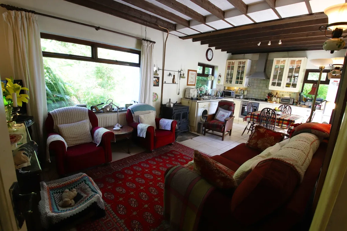 A cosy, tiled entranceway lies at the heart of the property, connecting all of the different rooms. The open plan kitchen/dining room is a large room with plenty of seating. A cosy range sits against one wall, while various appliances can be found dotted along the countertops.