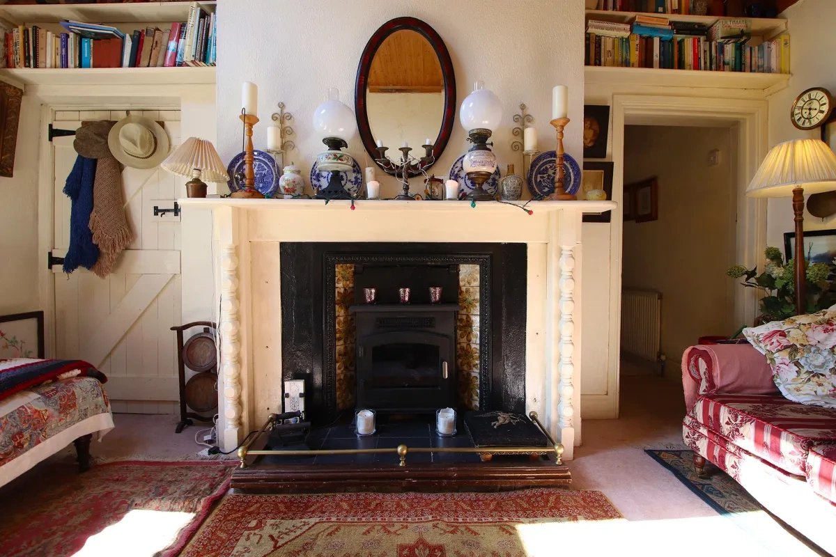 Carpet lines the floor in one of the reception rooms, which also features a range and fireplace amongst other things. Warm lighting, patterned rugs and deep red couches bring colour to the room. Shelving has been fitted either side of the fireplace for extra storage space.