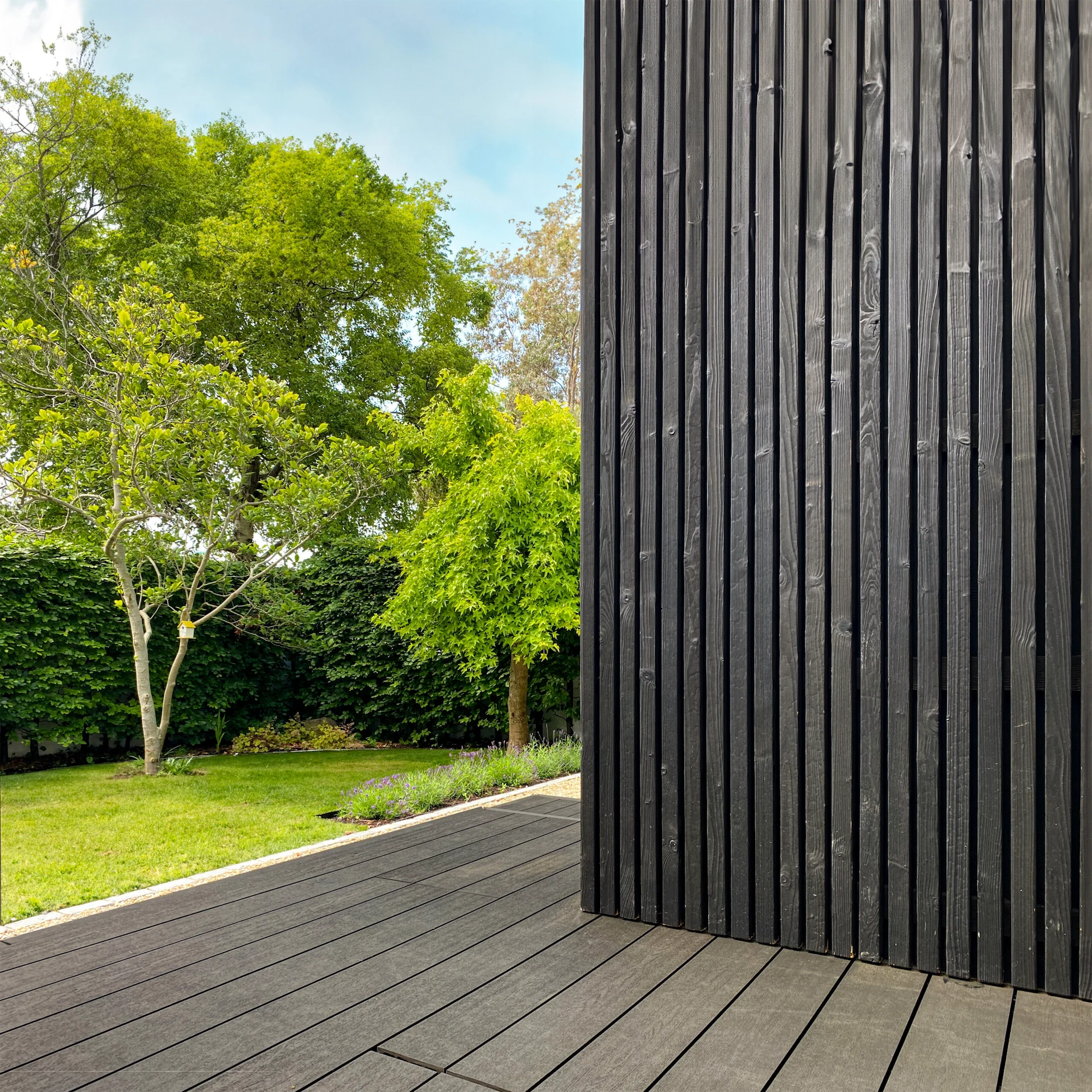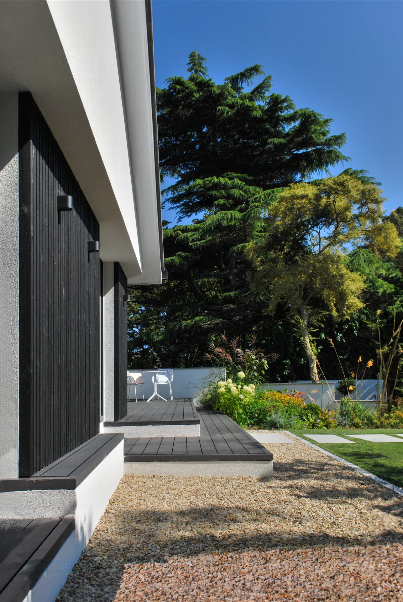 To address the home’s poor BER rating, external insulation was added, which also gave the opportunity to modernise the home’s appearance from the outside. “A contemporary combination of white render and black charred timber cladding was selected,” David explains. “The concept was to design a monochrome structure nestled amidst lush greenery, evoking a serene, Japanese-inspired aesthetic. By recessing and projecting sections of the front façade, we created small seating areas and covered porches that play with light and shadow, adding visual interest.”