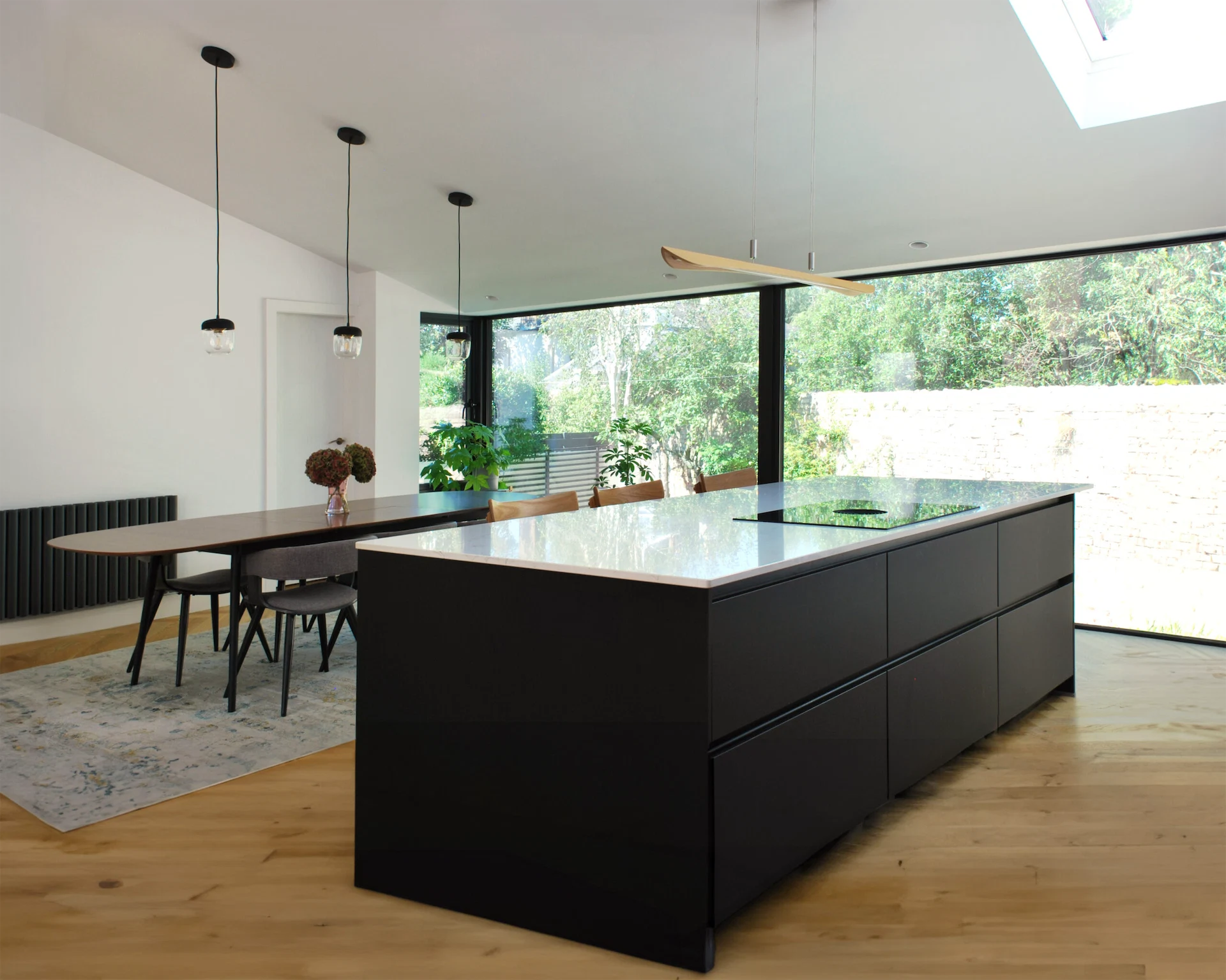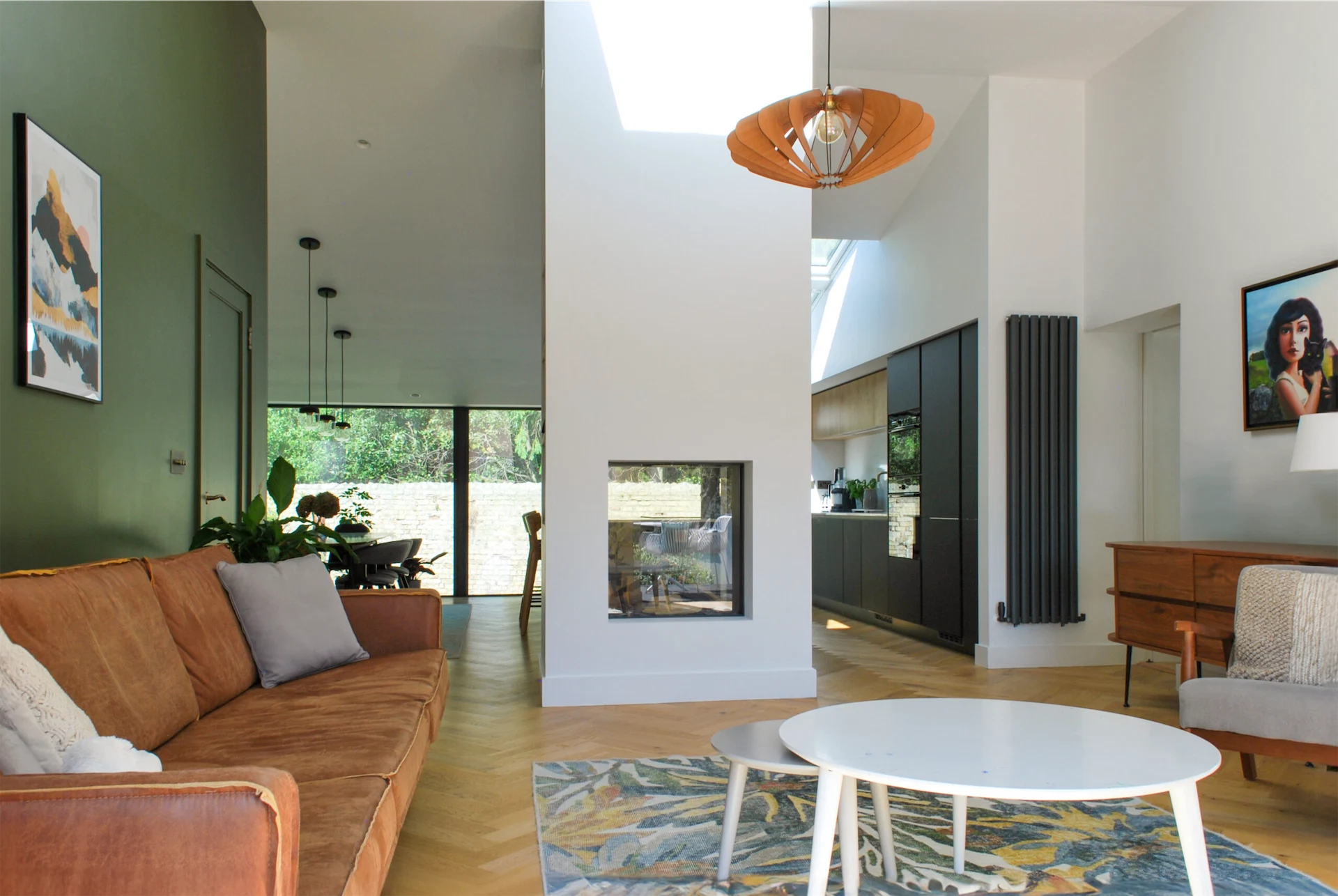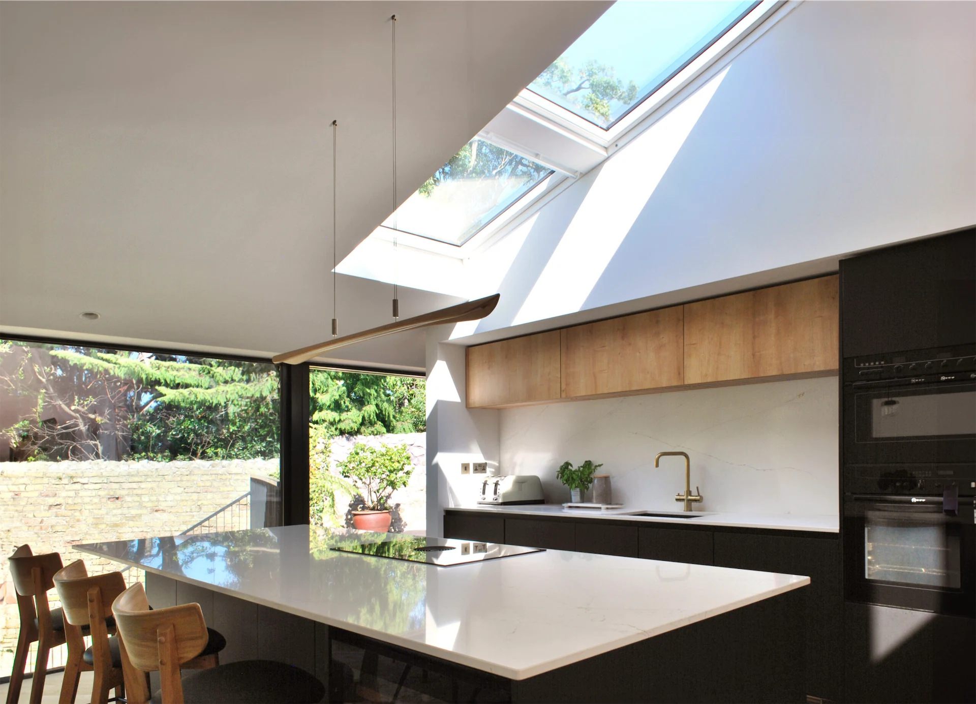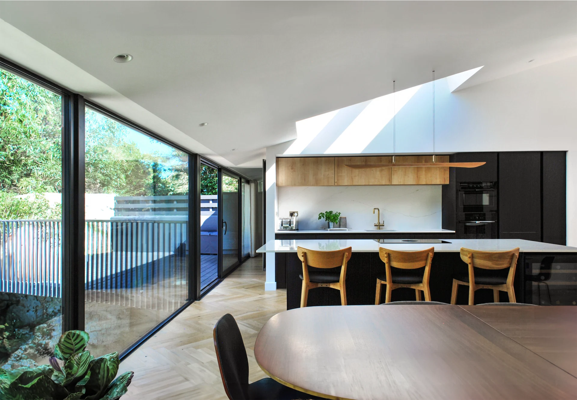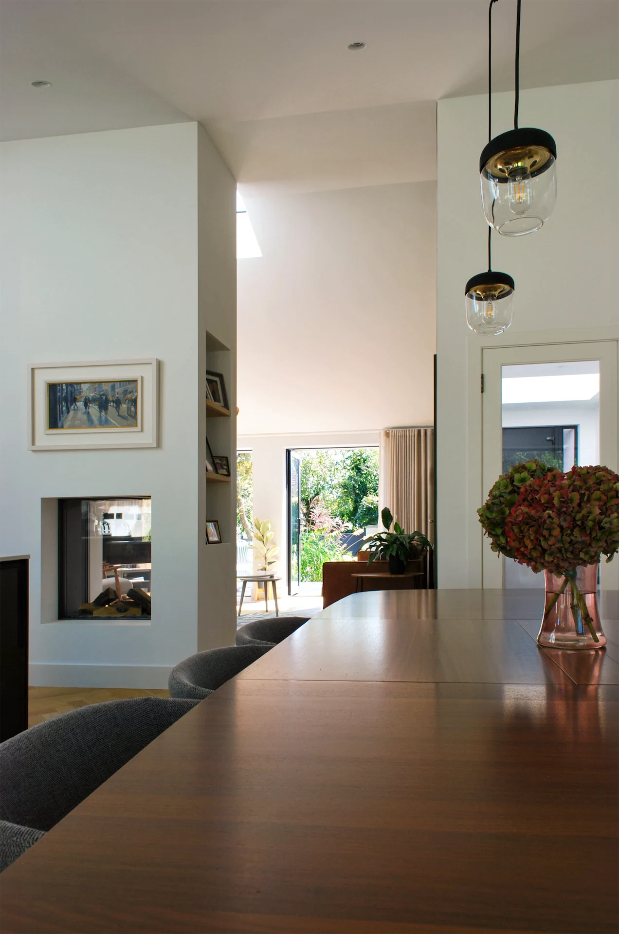 This involved reconfiguring the layout to create an open-plan design. Walls were removed, roof lights and glazed doors allow light to flow in, and sliding doors were installed between rooms to create flexible spaces.