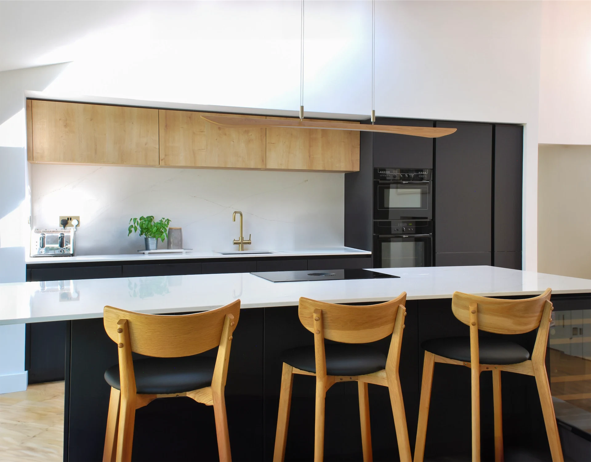 Internally, warm tones and neutral colours were chosen creating a calm, welcoming feeling, while dark kitchen units add a touch of contrast. The original flat ceilings were also raised to follow the profile of the roof, providing the chance to create a tall feature fireplace and chimney.