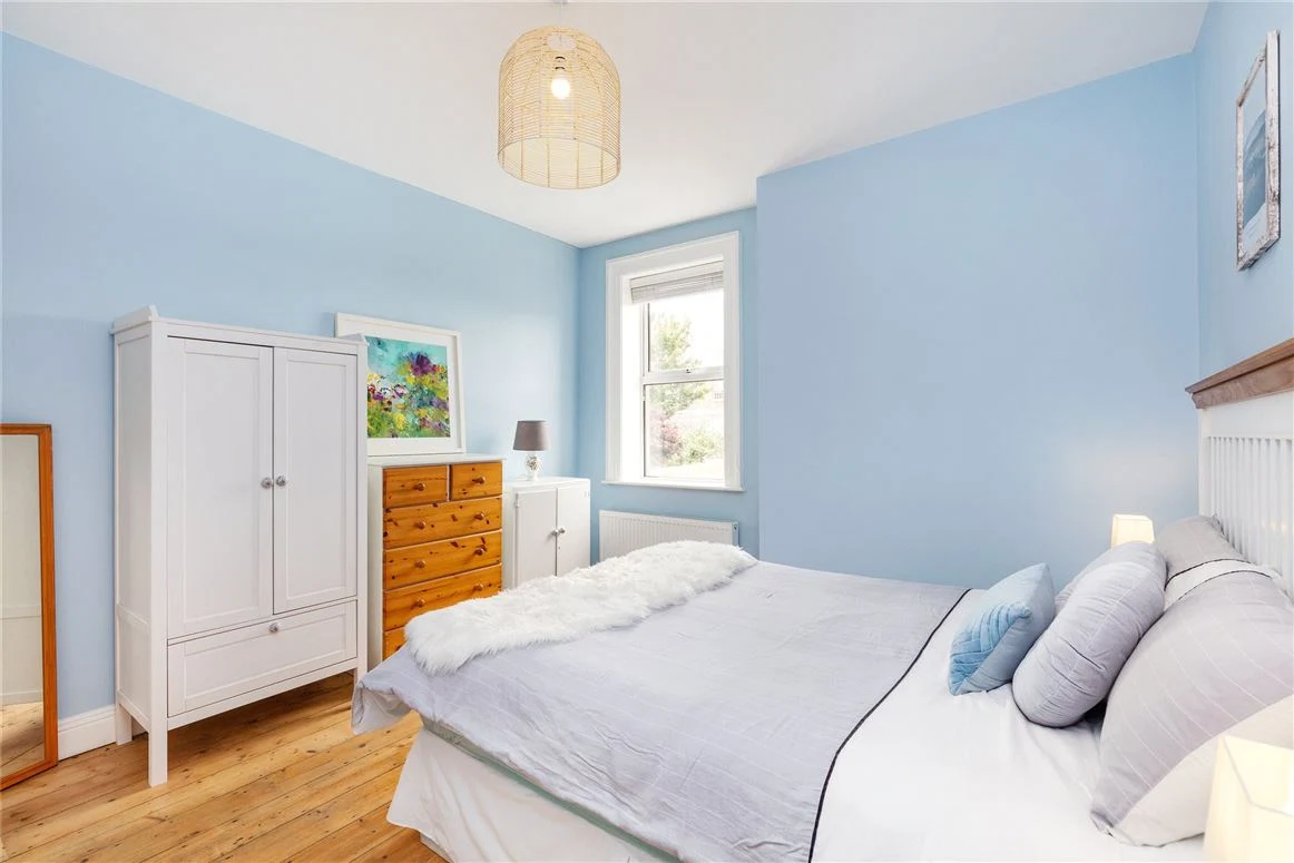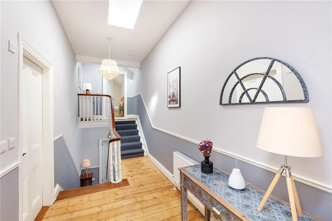 The house is impressive even from the outside, with ornate brickwork that was repointed this year. You enter the home into a hallway with particularly high ceilings and original ceiling coving. A tile-effect floor is a nice nod to the home’s history, and complements the cool-toned colour palette.