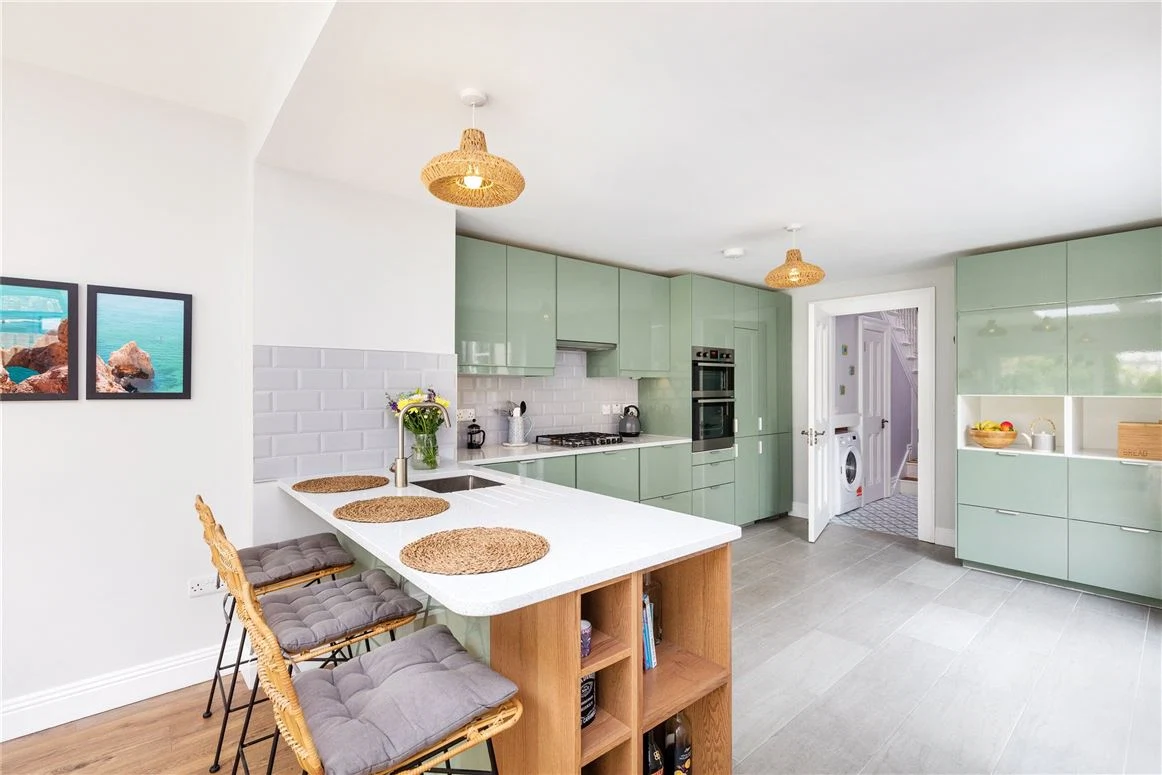 It’s a large space that can easily fit a long table, while a sash window looks out to the back garden. To the back of the house is an open-plan kitchen and living space. The kitchen has sage green units and quartz worktops, and there is a breakfast bar.