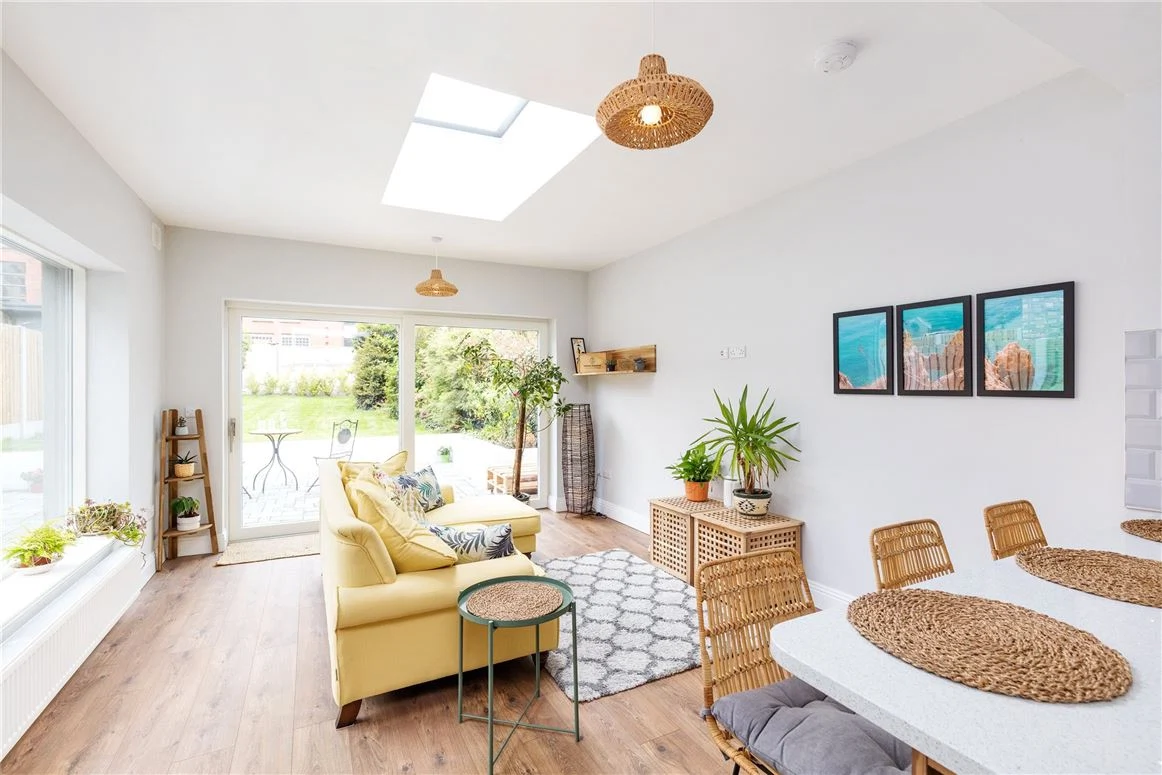 The living space has a skylight as well as large sliding doors to rear garden and a window to the side, creating a very bright space.