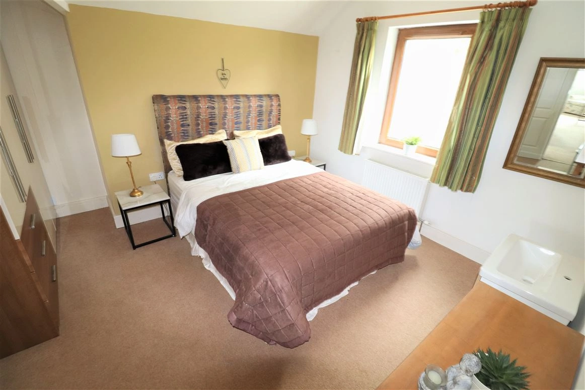 The kitchen has ample counter and storage space with wooden cabinets lining the walls and an island added in for convenient breakfast-time seating. A window above the sink allows natural light to flood in by day. This space has also been fitted with a gas hob, electric oven, extractor and dishwasher.