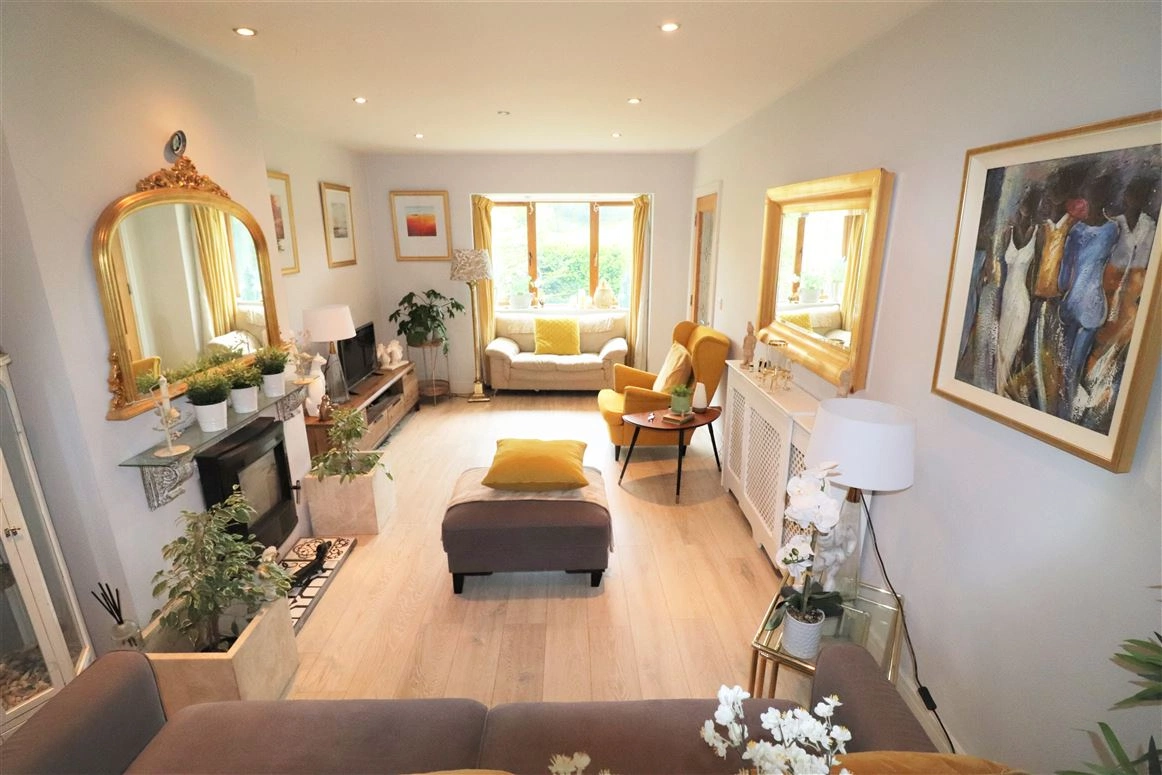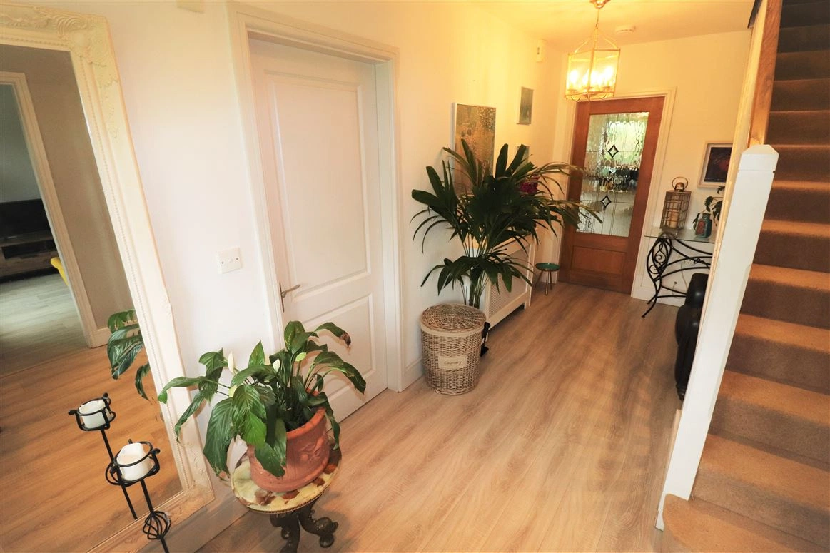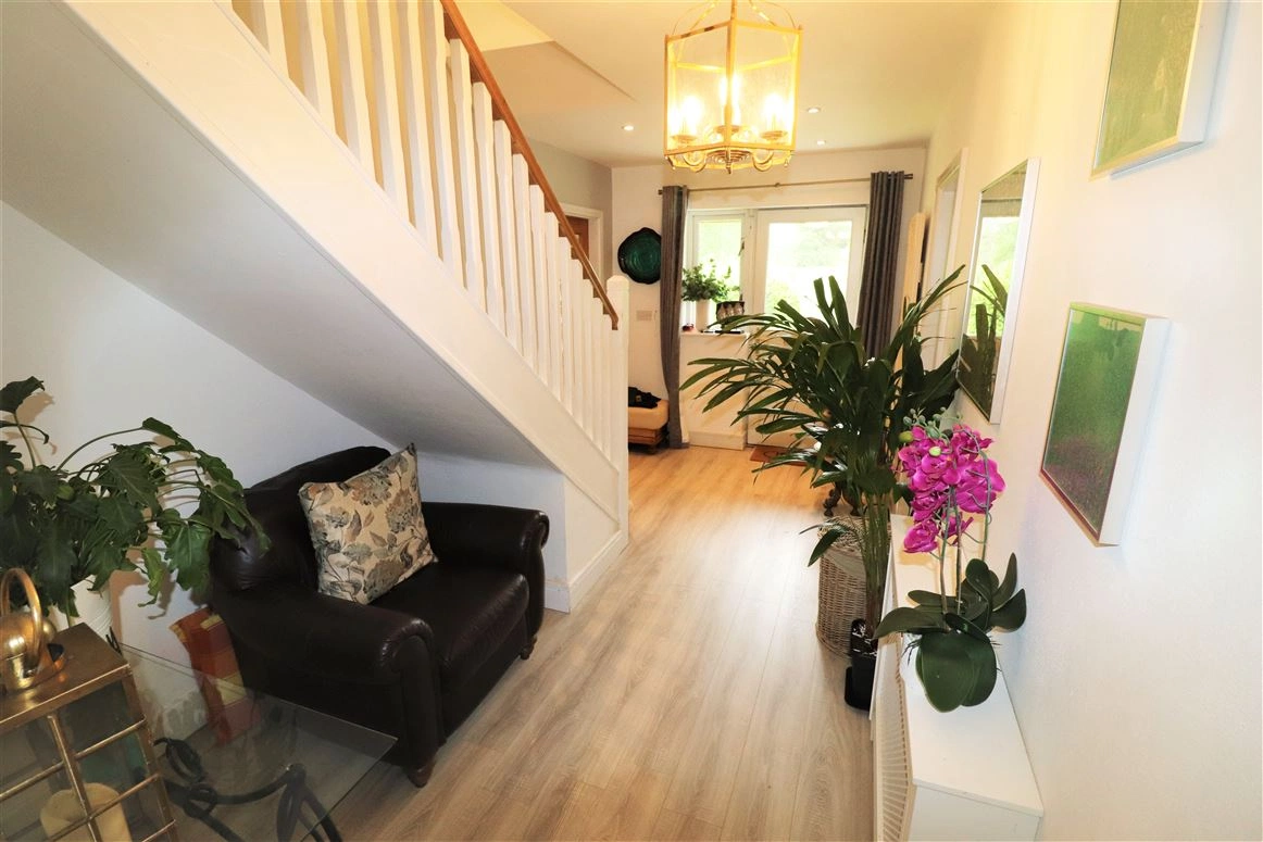 The entrance hall is a bright and spacious area with wooden flooring leading the way into adjoining rooms. A small armchair can be found perched underneath the stairs, though this area could be converted into additional storage should the need arise.