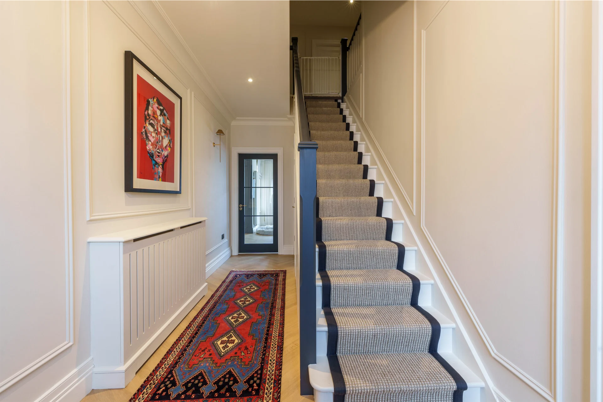 Some spaces were given added interest, such as the hallway. “The addition of contemporary wall panels added depth, while distinctive open steel lanterns by Visual Comfort and rechargeable wall lights from Pooky gave an aesthetically pleasing soft glow to nighttime,” Deirdre says. “New internal doors were installed, in a dark painted finish with antique brass fixtures and hardware. A bold antique Yalameh Persian rug is the focus, complementing the artwork by Audrey Hamilton.”
