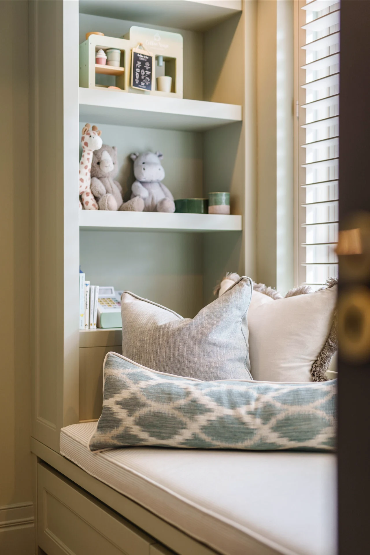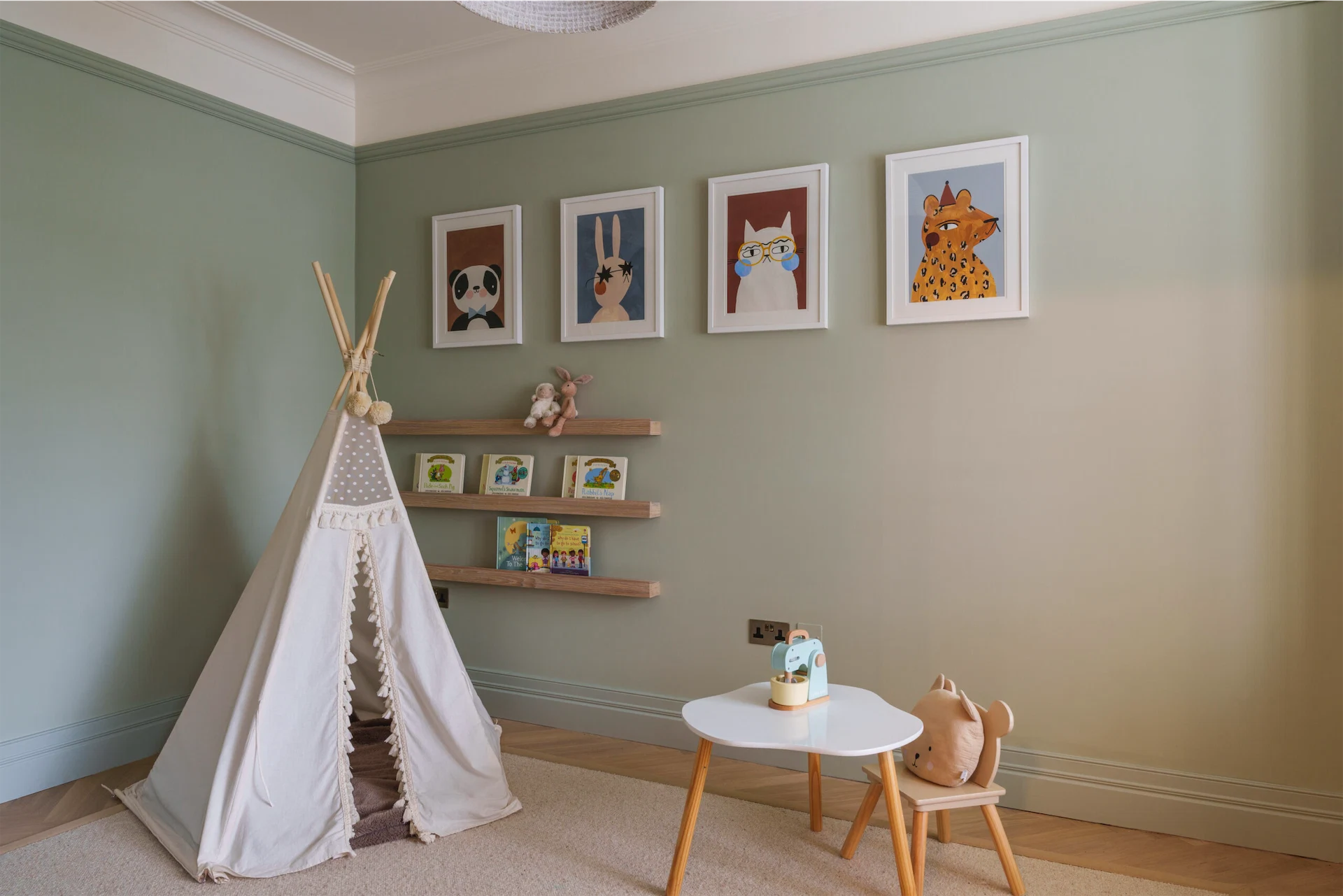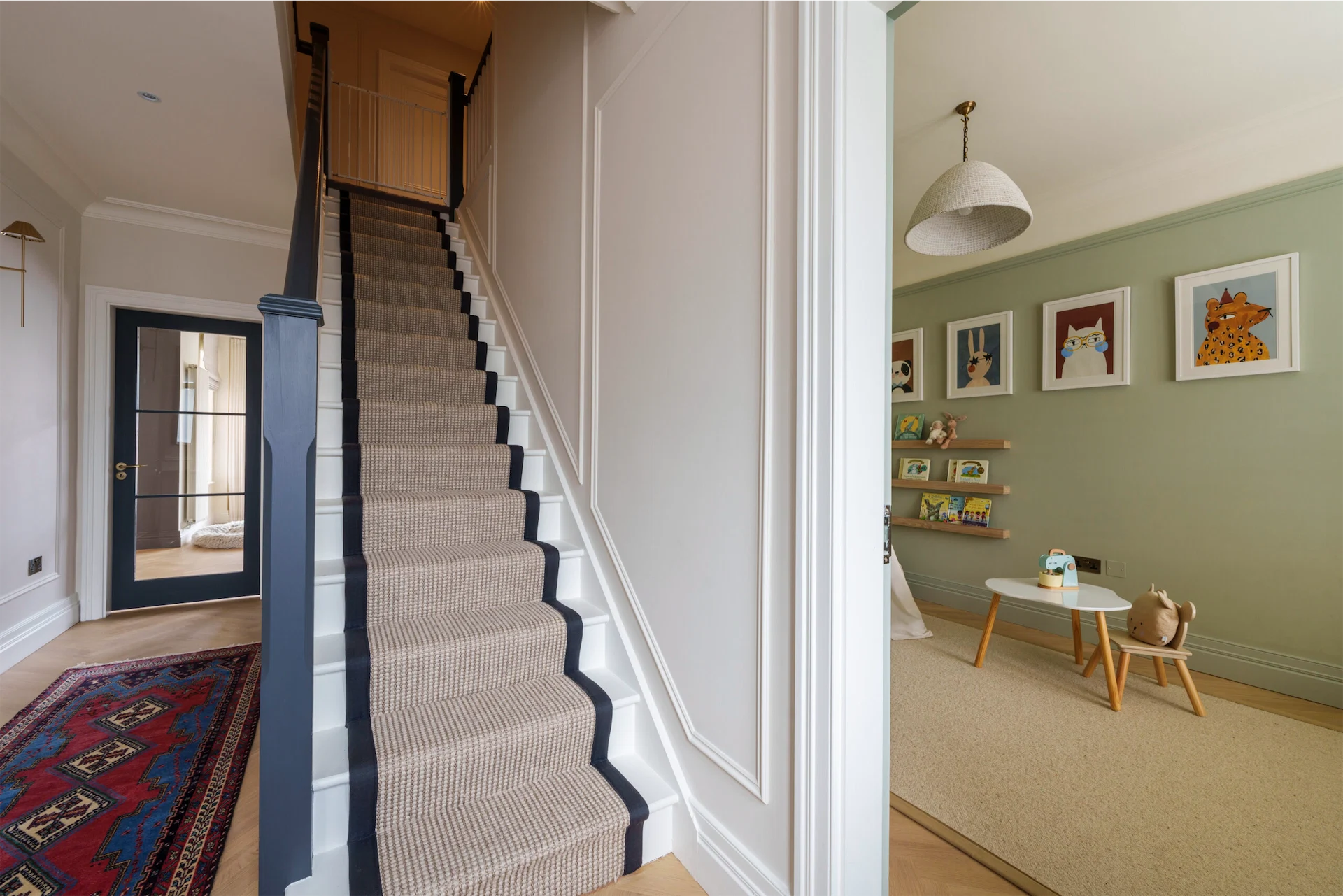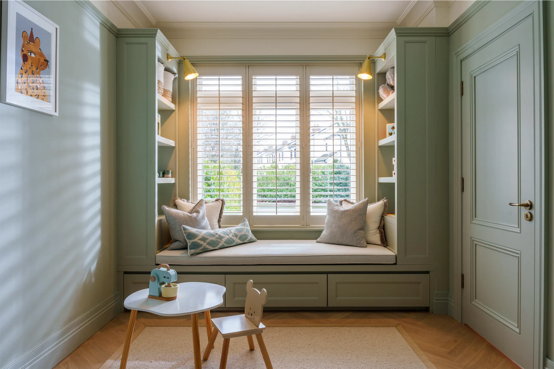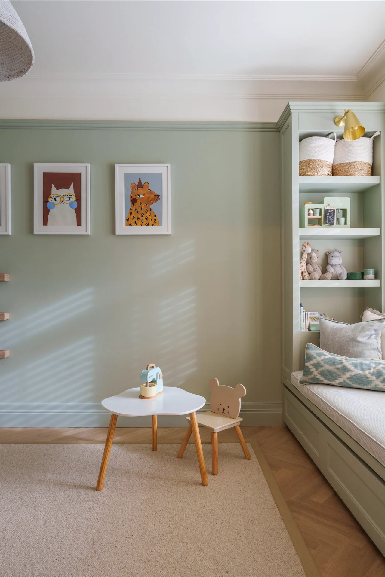 The kids’ playroom is colour-drenched in Mizzle by Farrow and Ball. “Bespoke joinery fills a window void and gives new seating and ample storage in an otherwise dead space. Lighting was selected from Pooky and Mullan Lighting to build the neoclassical style, and a 100% wool easy-clean Ecru Boucle by Deco Design covers the herringbone floor.”
