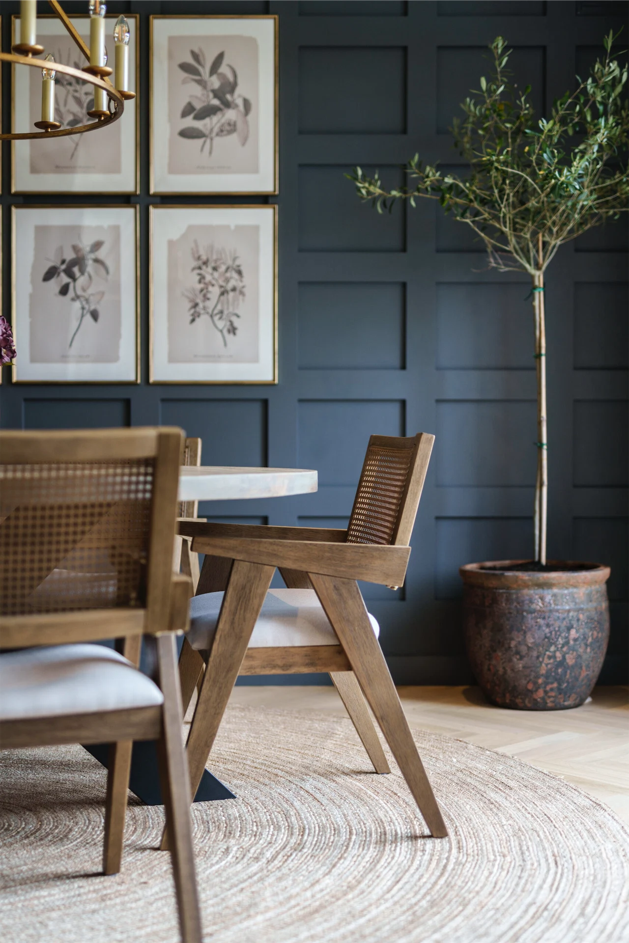 In the dining area, tones of wood and distressed gold detailing are set against the rich Zoffany Gargoyle paint on the walls and woodwork. The room gets bright sunshine, so voile adds a layer of textural warmth and is used to block direct sunlight. A stained oak table by Shanley sits over a rug with six angular dining chairs.