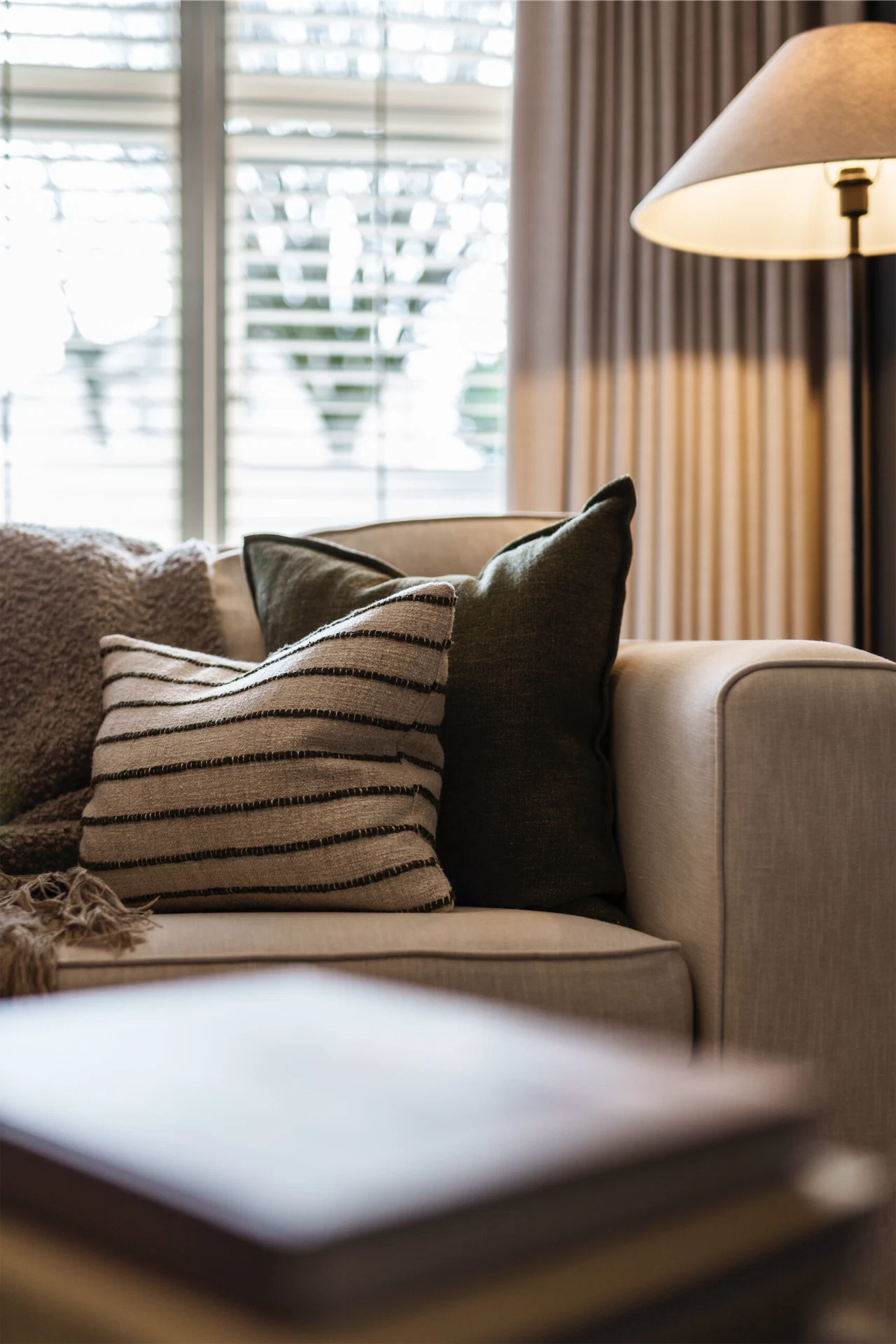 The adjoining living room continues the same paint colour. “This space was dark and northerly,” Deirdre explains. “We opted for laid back, Californian vibes with shades of off-white and natural tones; layered with subtle, autumnal rusts and greens. The existing large off-white sofa is from Shanley, with a coffee table and accessories from Rockhill in Blackrock.”