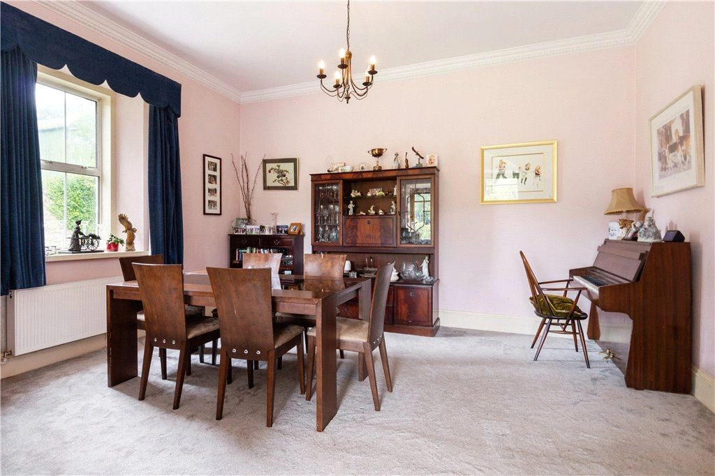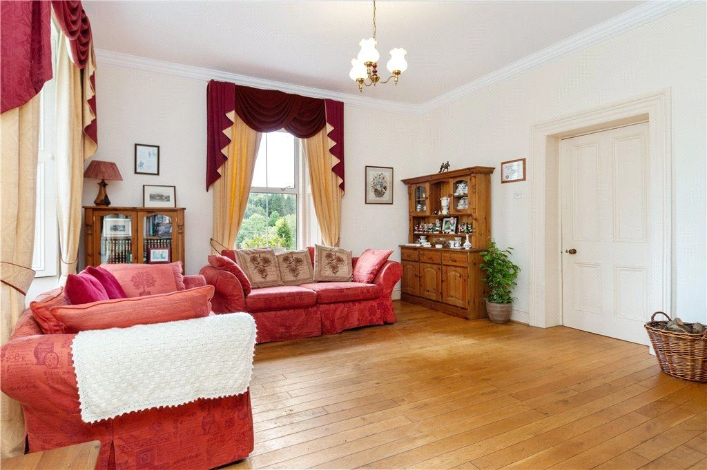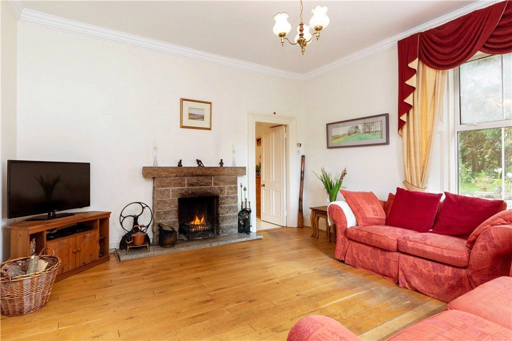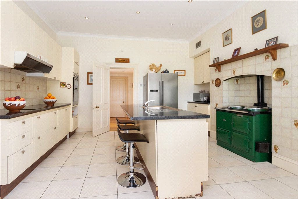 To the right of the entrance hall is a family room with solid timber floor and dual aspect windows taking in views over the gardens and grounds. A door from here leads to a traditional-style kitchen. A centre island unit with breakfast bar seating is amongst this room’s standout features.