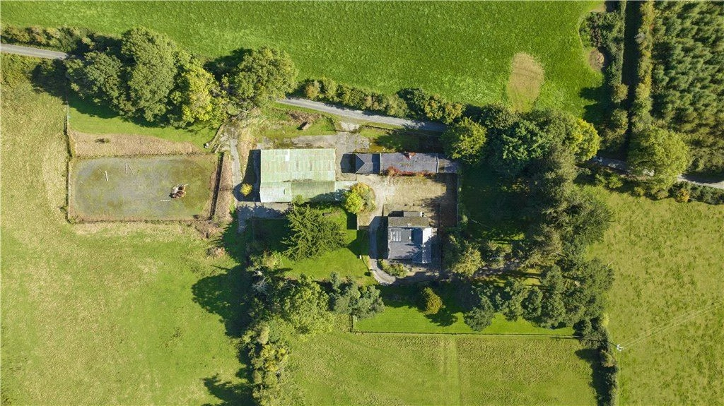 Approached by way of a pillared entrance with electric gates and a sweeping tree-lined drive, the main building comprises a three-bay two storey detached farmhouse, set on a raised platform to maximise the scenic vistas.