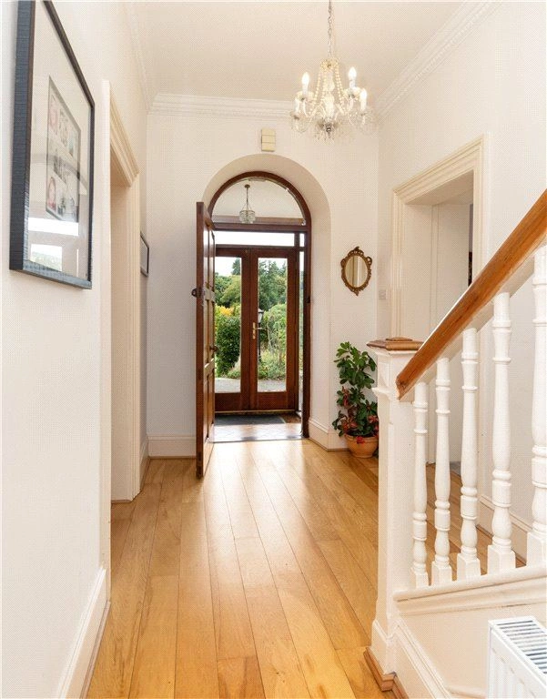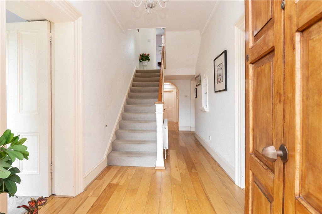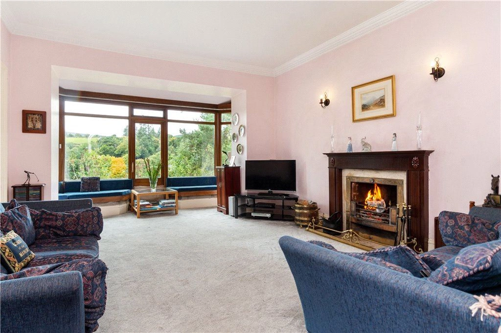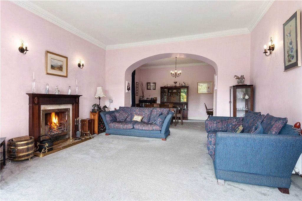 Inside, a porched entrance opens into a welcoming reception hall with solid timber floor and ornate coving. A door leads into the guest wc, while to the left, a living room with open fire and bay window can be found. An arch opens into the dining room to the rear with another door leading out to the entrance hall.