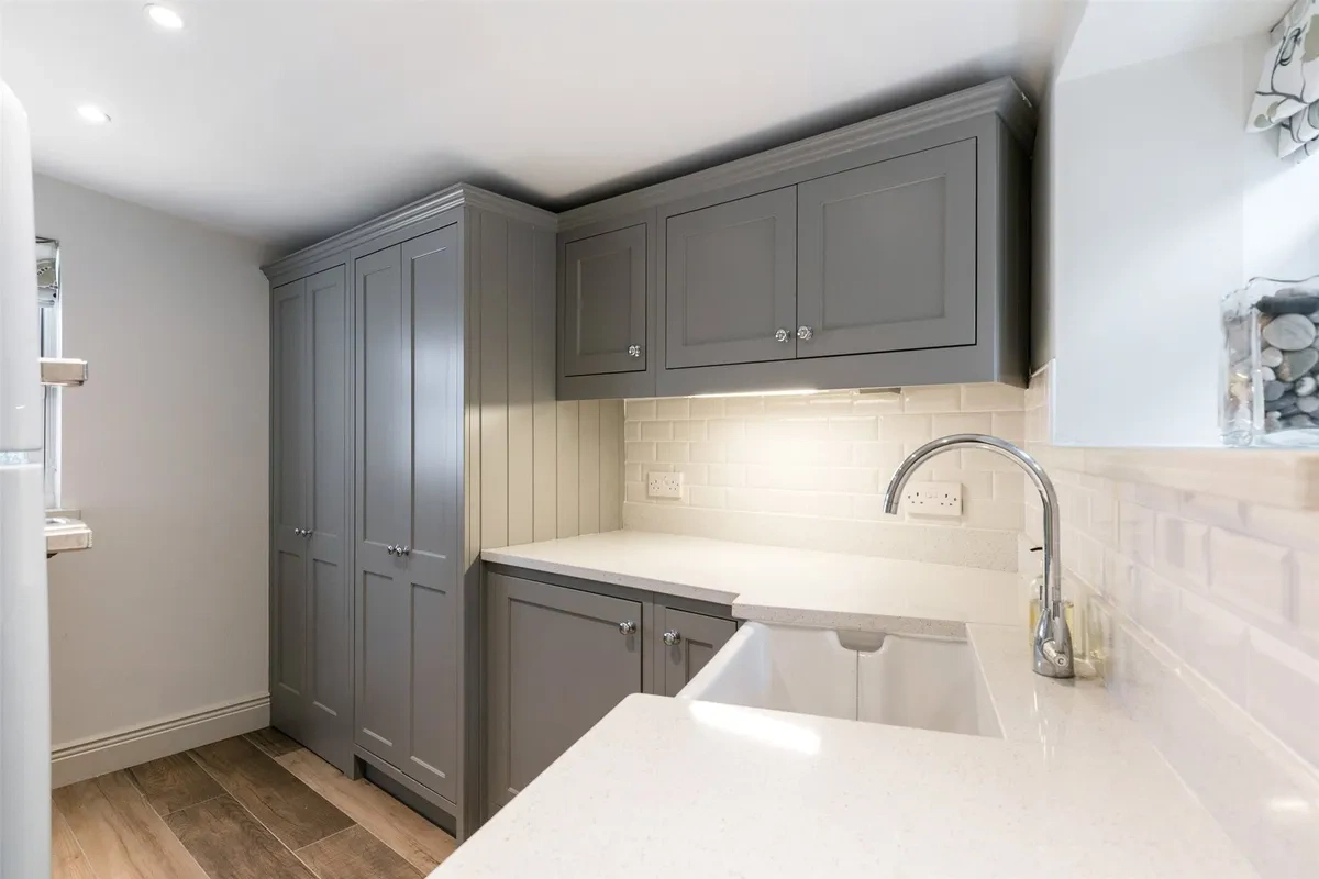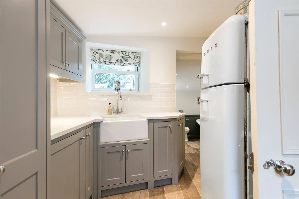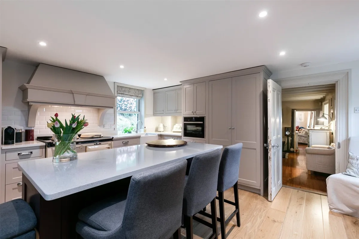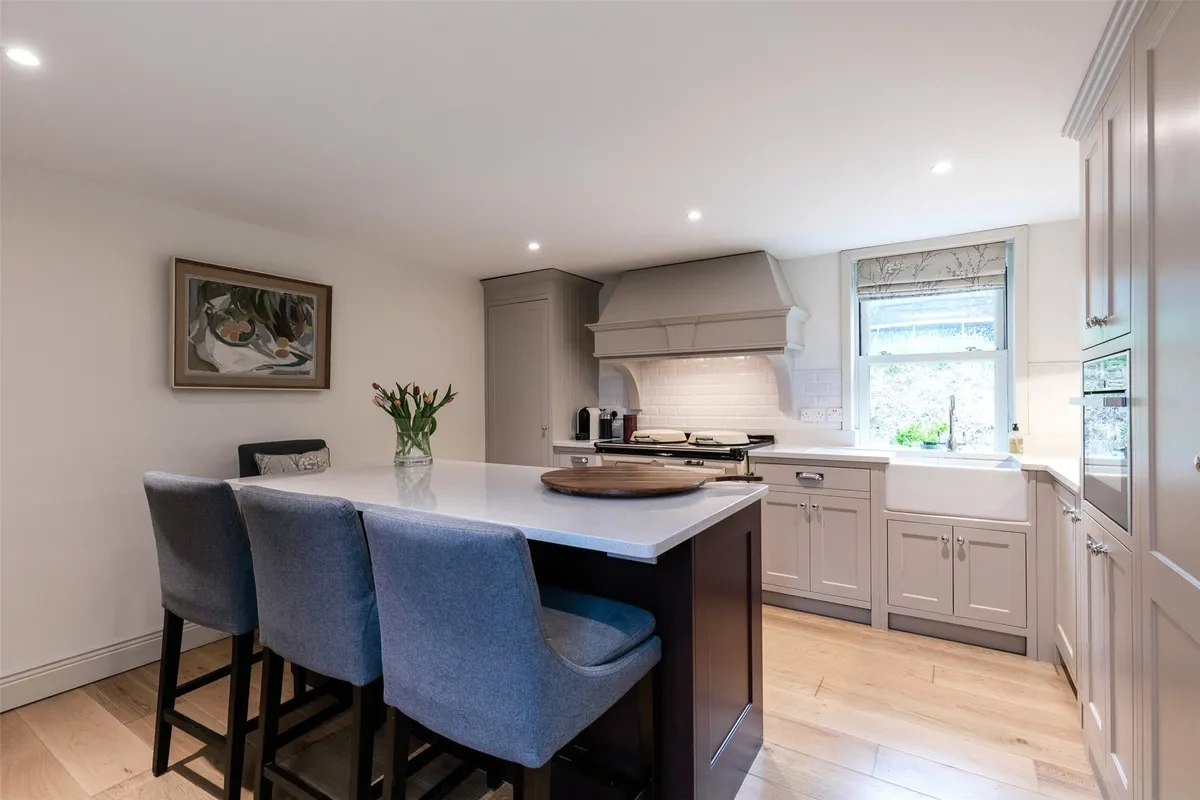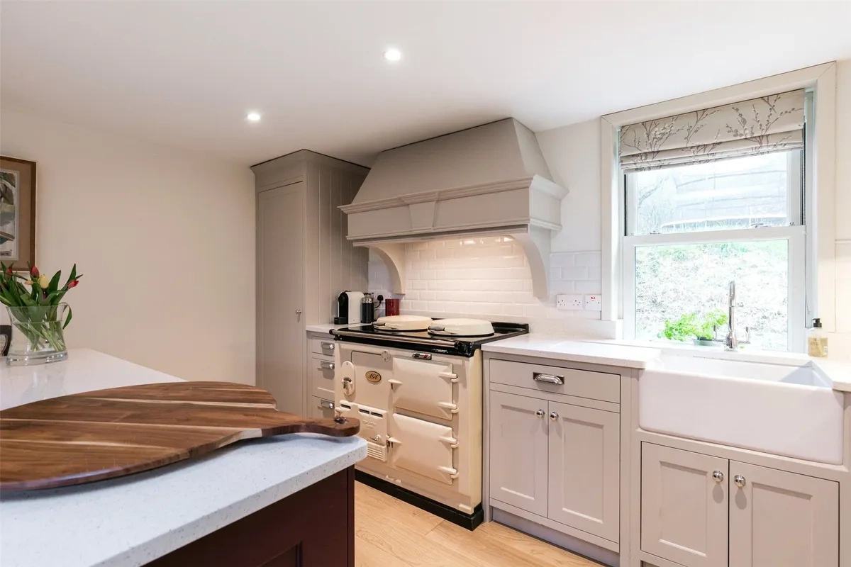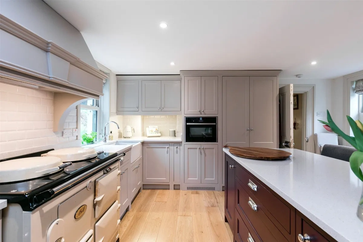 Further along, you’ll find the kitchen area which has been fitted with an AGA cooker and a large Belfast sink. There is plenty of storage space with several built-in units and presses lining the walls, as well as a large breakfast bar with additional seating in the centre of the room.