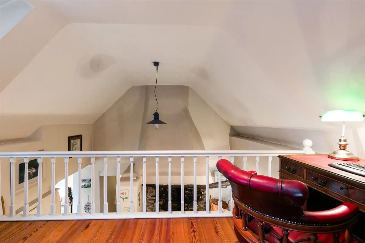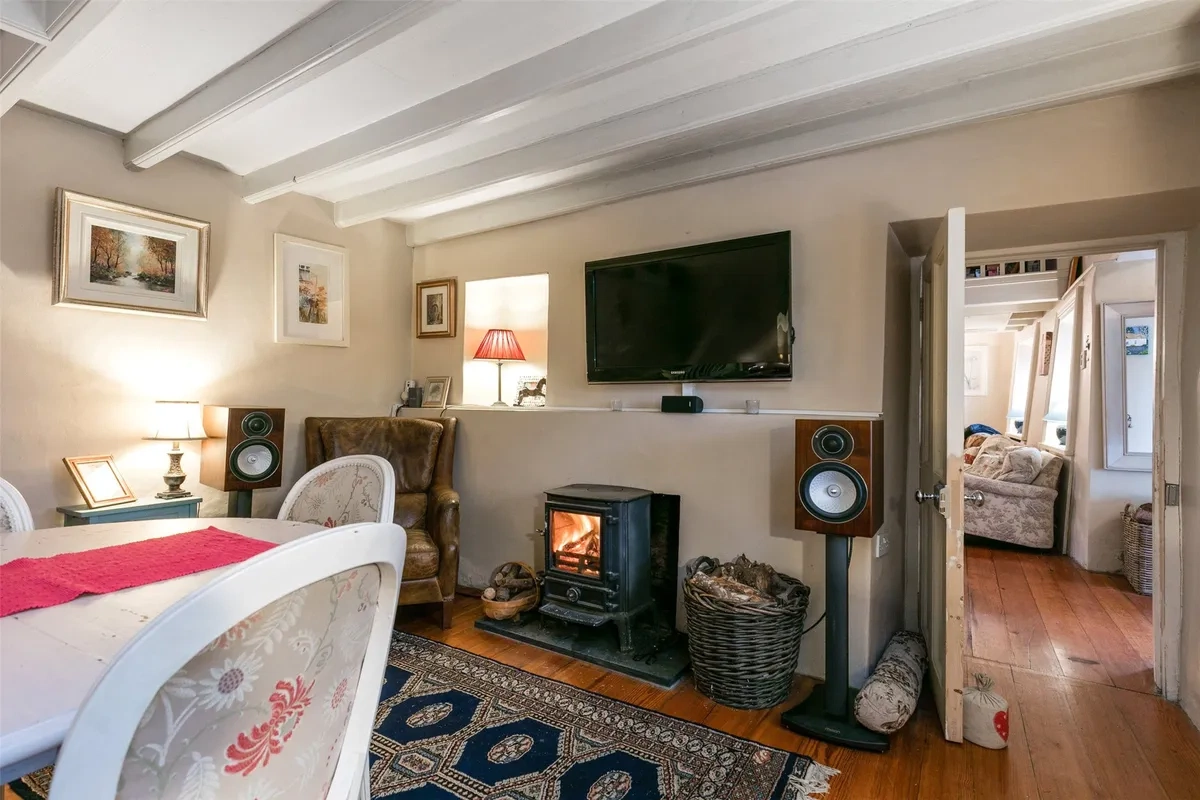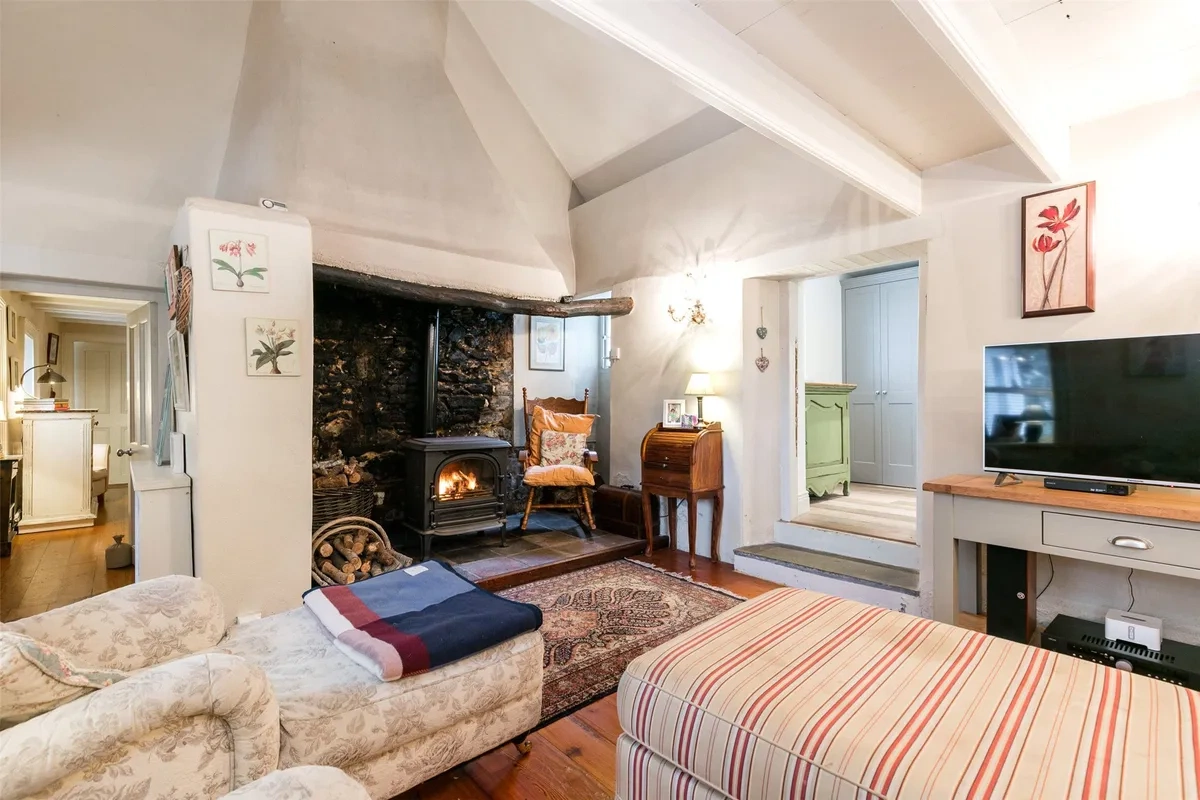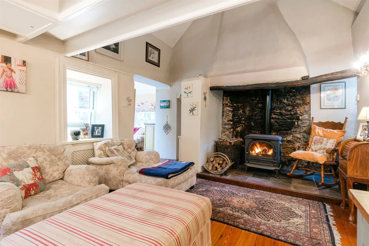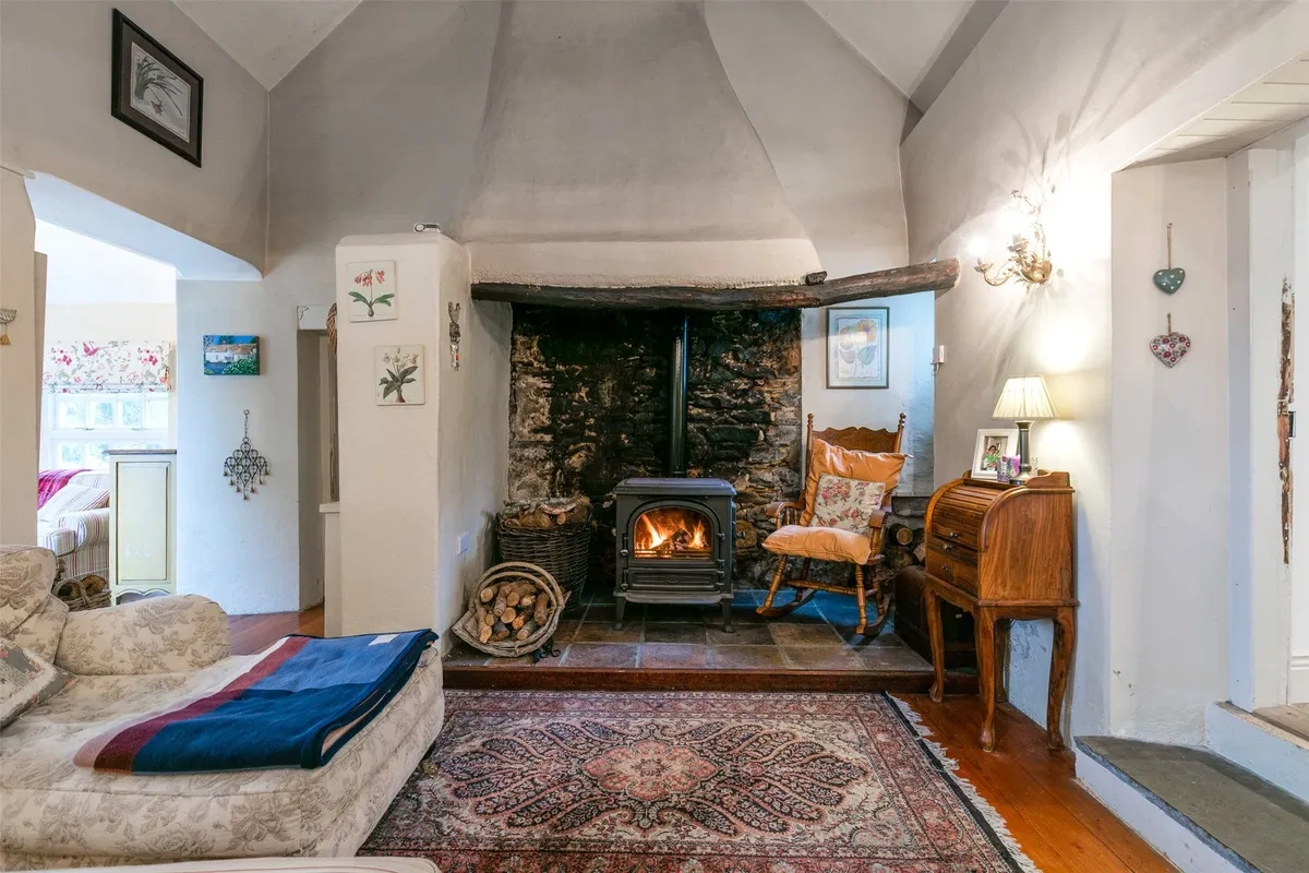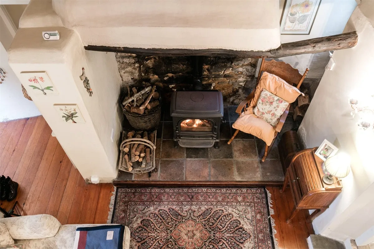 The dining room can be found off the kitchen with low ceilings and mezzanine, along with a small stove. This room leads to a larger sitting room where a feature stone fireplace and another solid fuel stove take pride of place. Pitch pine flooring has been fitted in this room.