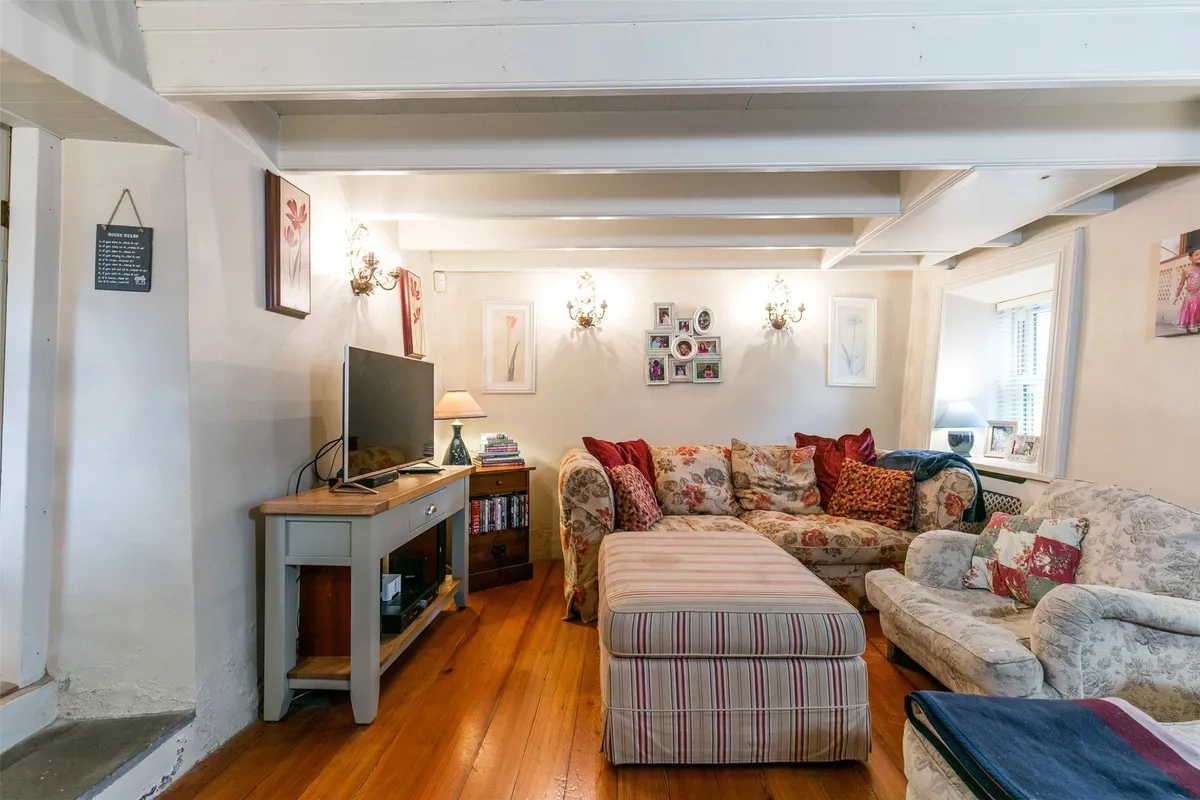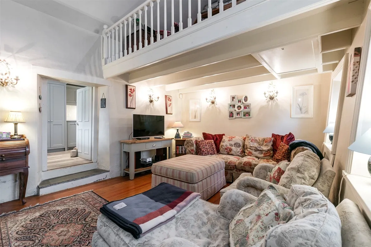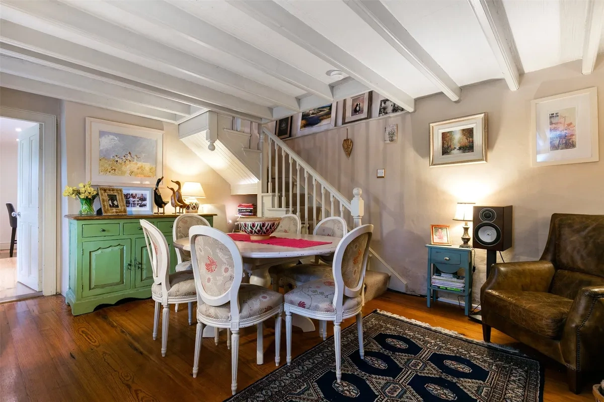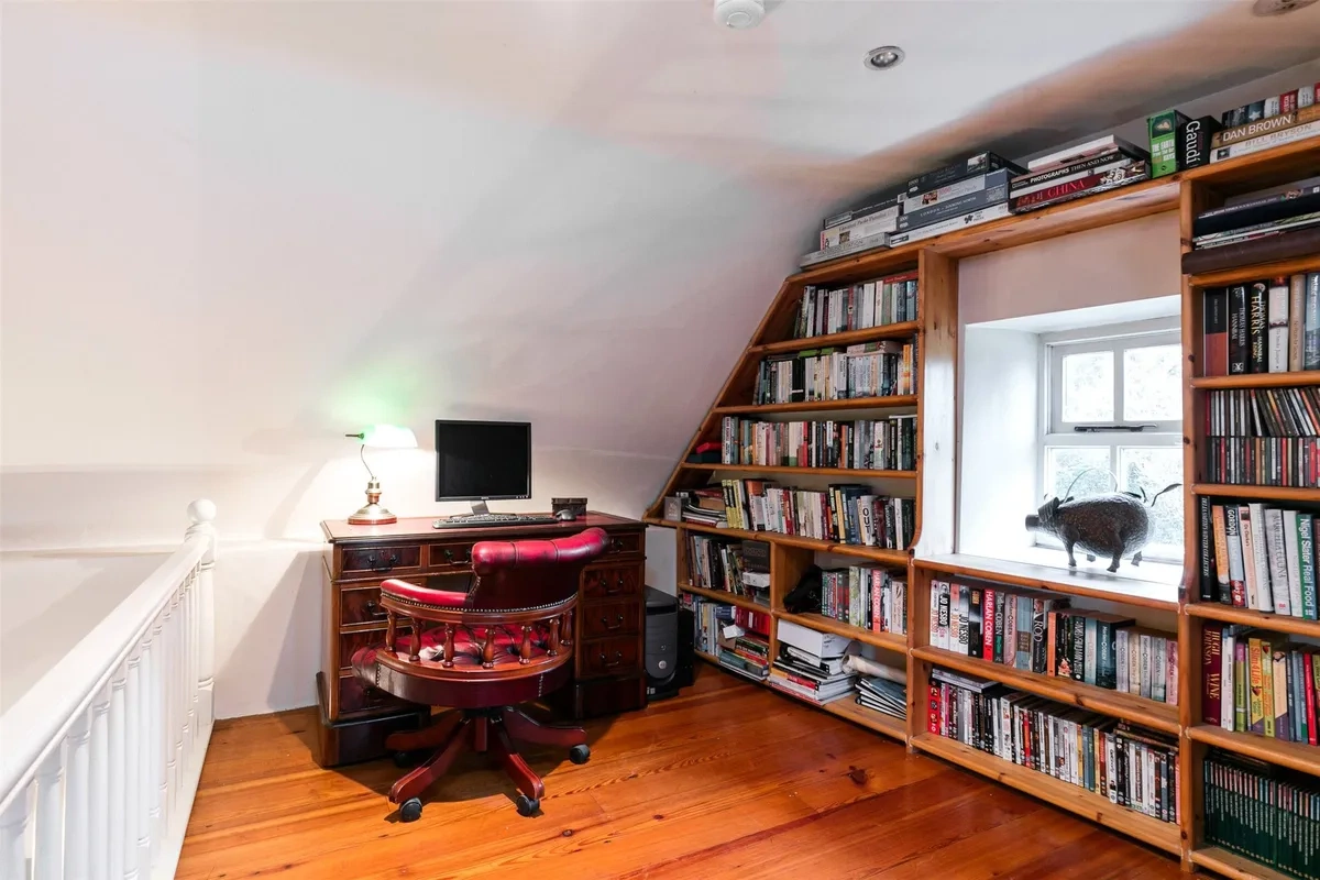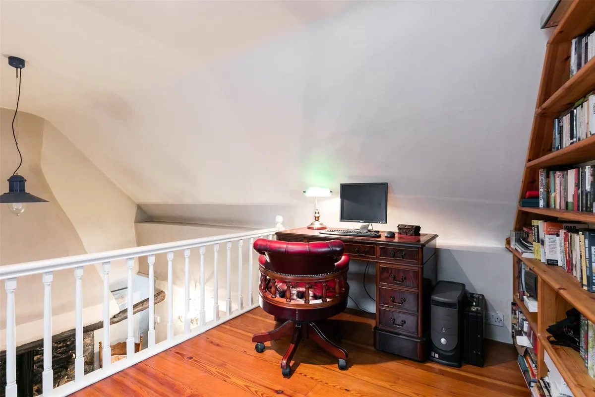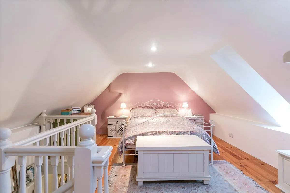 The dining room can be found off the kitchen with low ceilings and mezzanine, along with a small stove. This room leads to a larger sitting room where a feature stone fireplace and another solid fuel stove take pride of place. Pitch pine flooring has been fitted in this room.