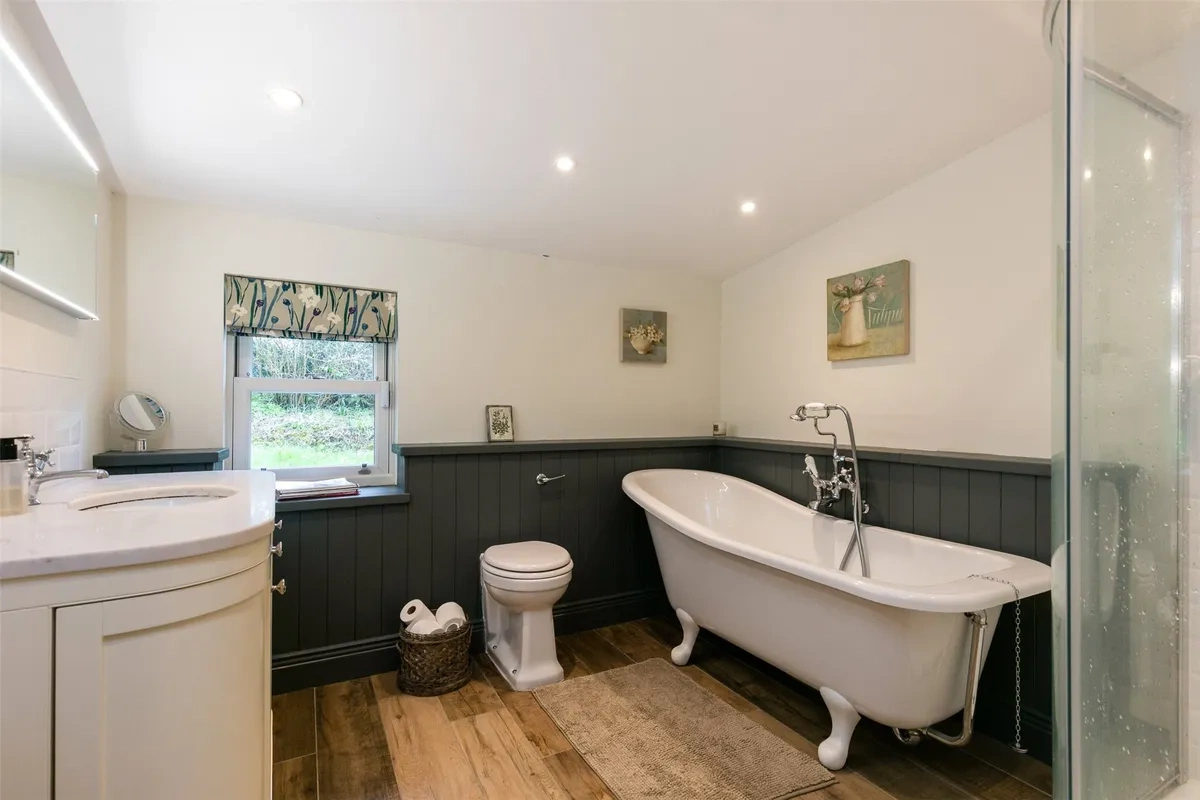 The family bathroom has a fabulous freestanding bath, a sink inset into a marble top, and a large mains shower.