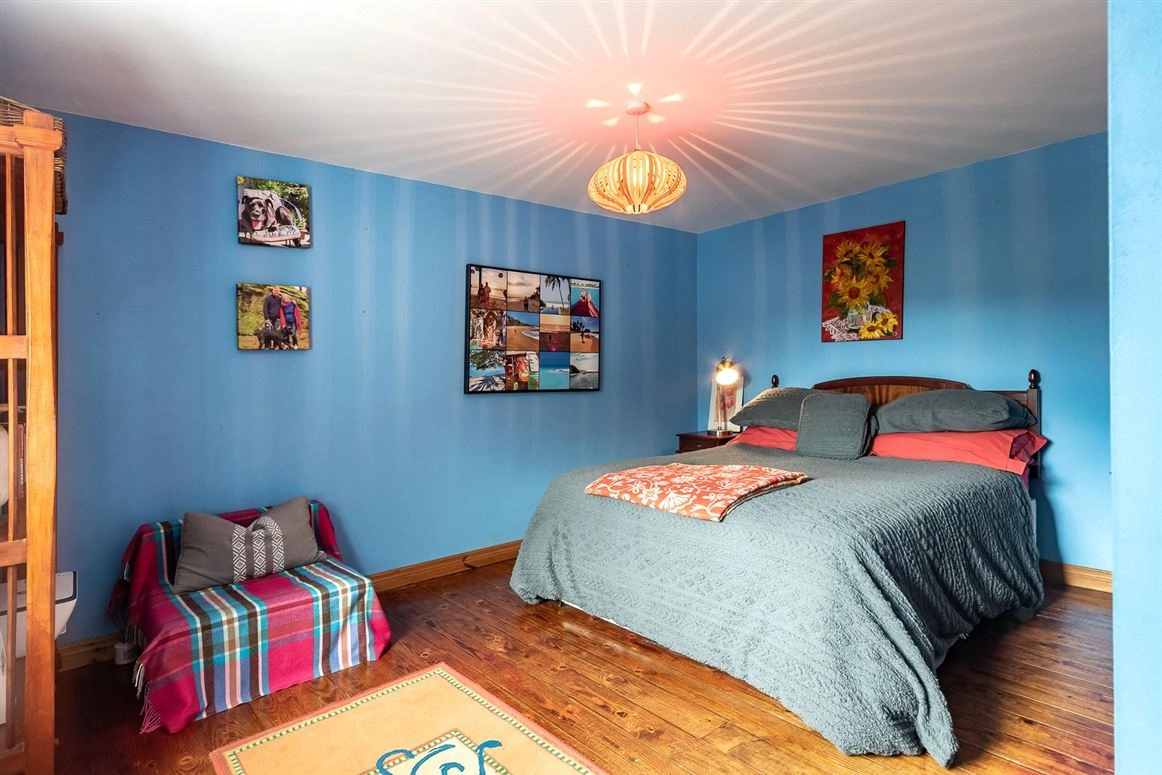 Inside, the entrance hall is located off the kitchen/dining room and the living room. Wooden floors continue throughout much of the house with colourful rugs and other soft furnishings bringing warmth and personality to each room.