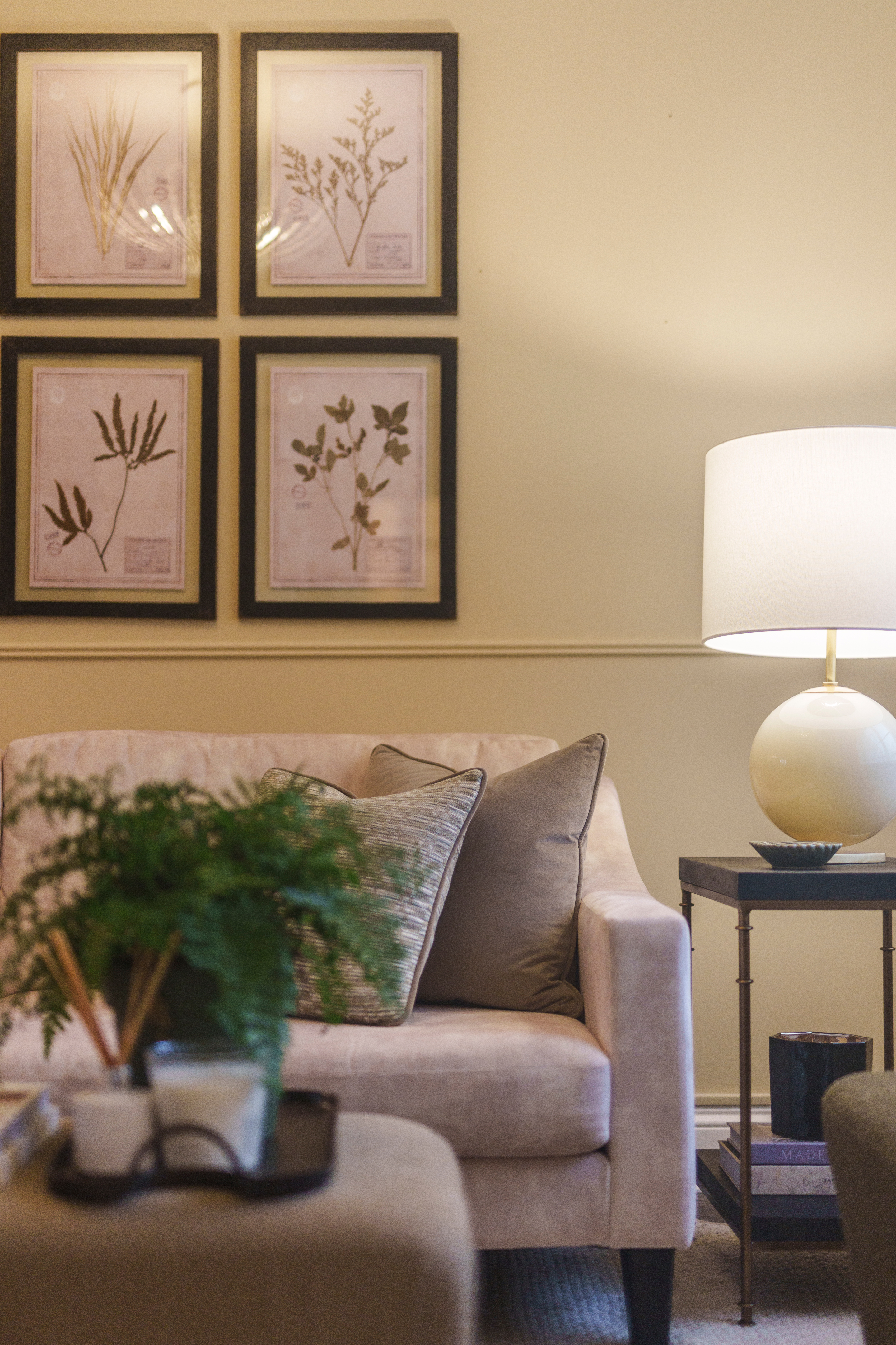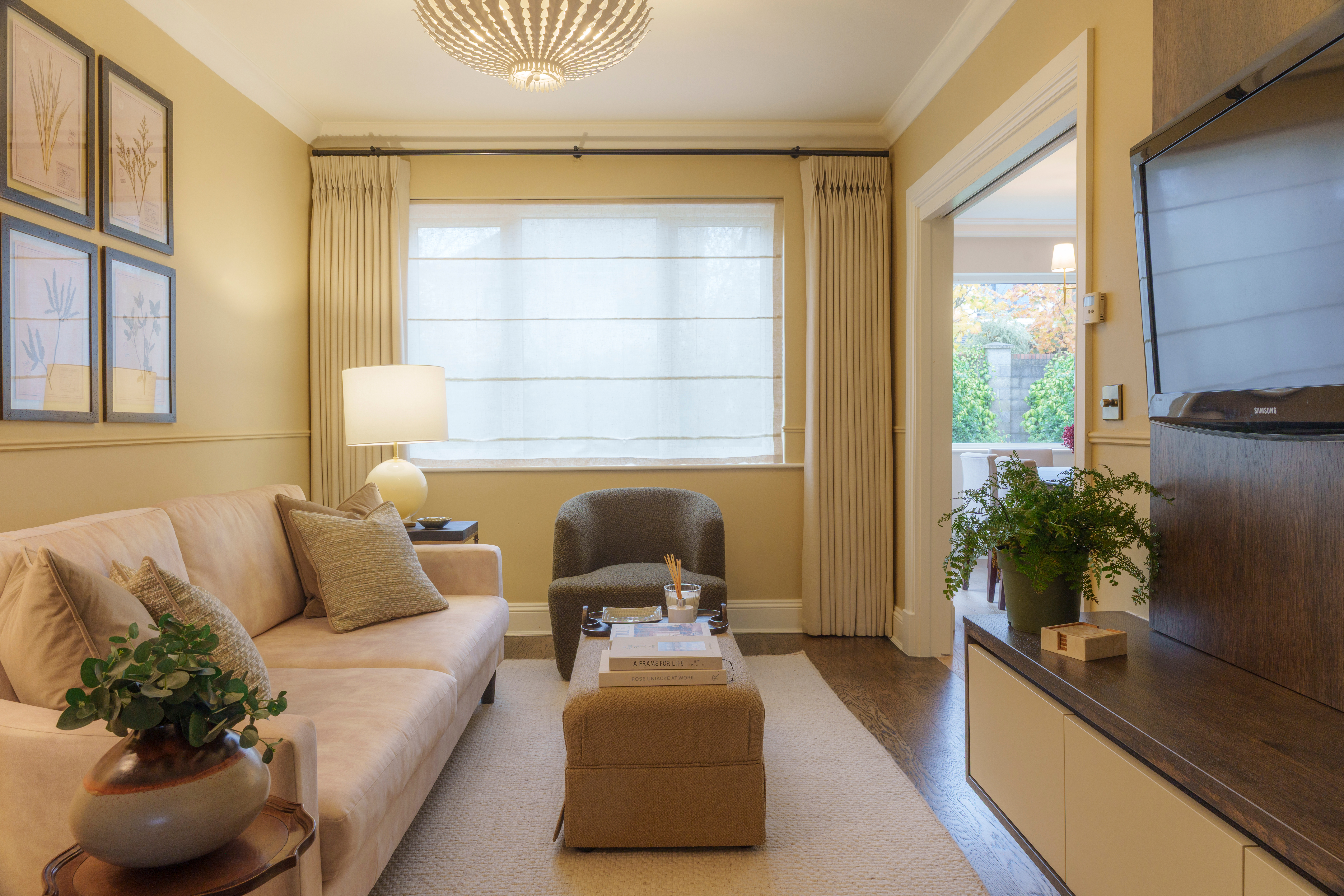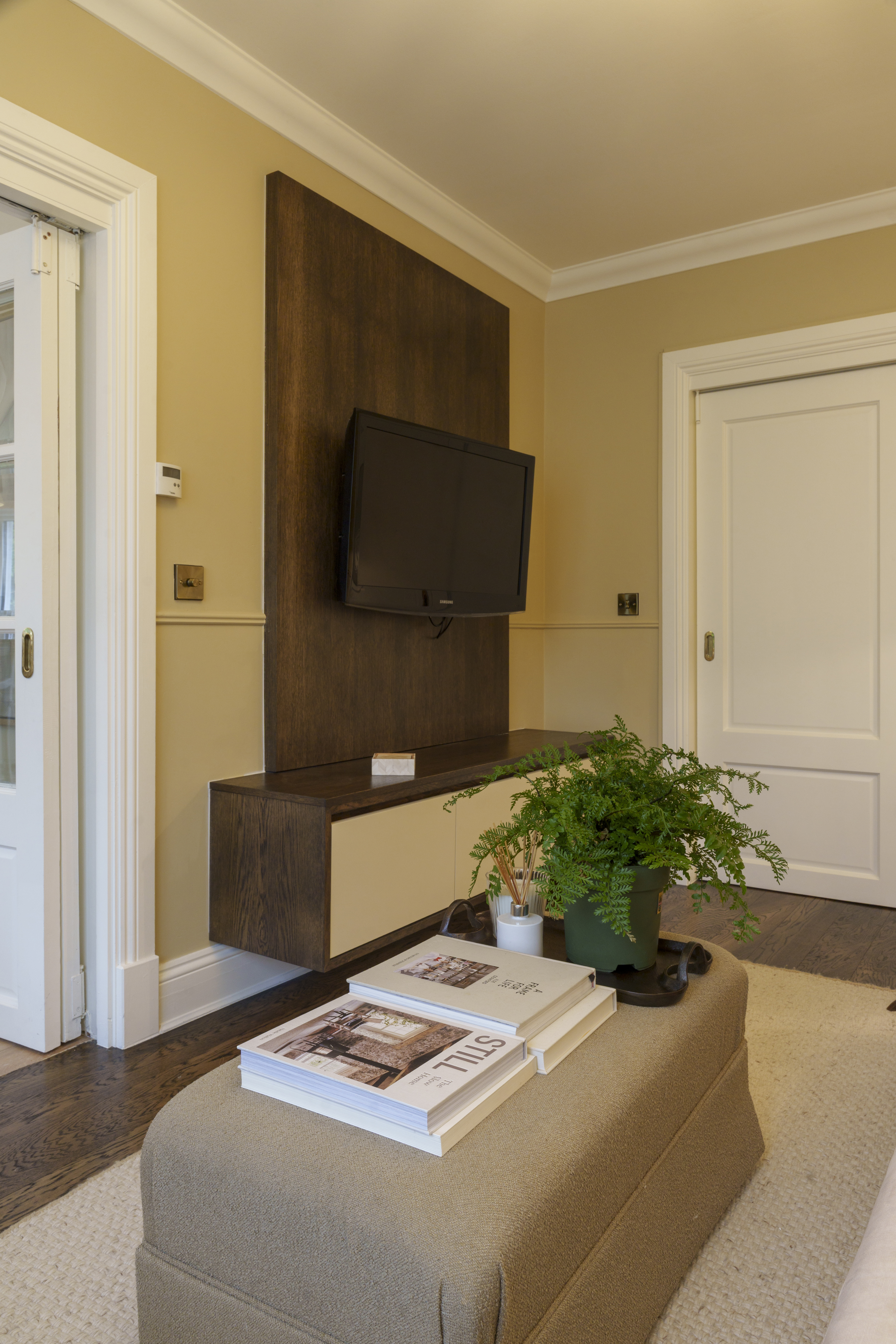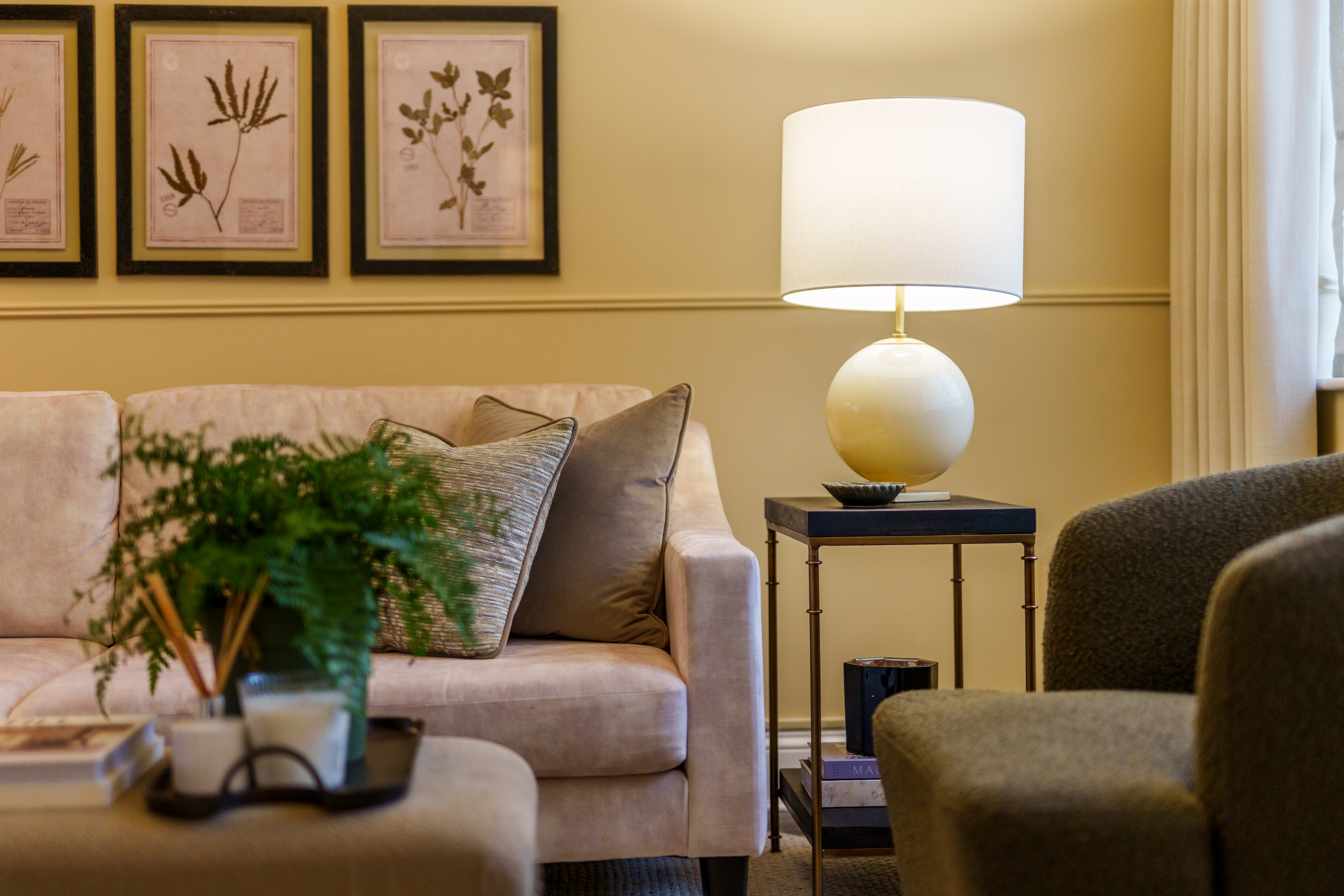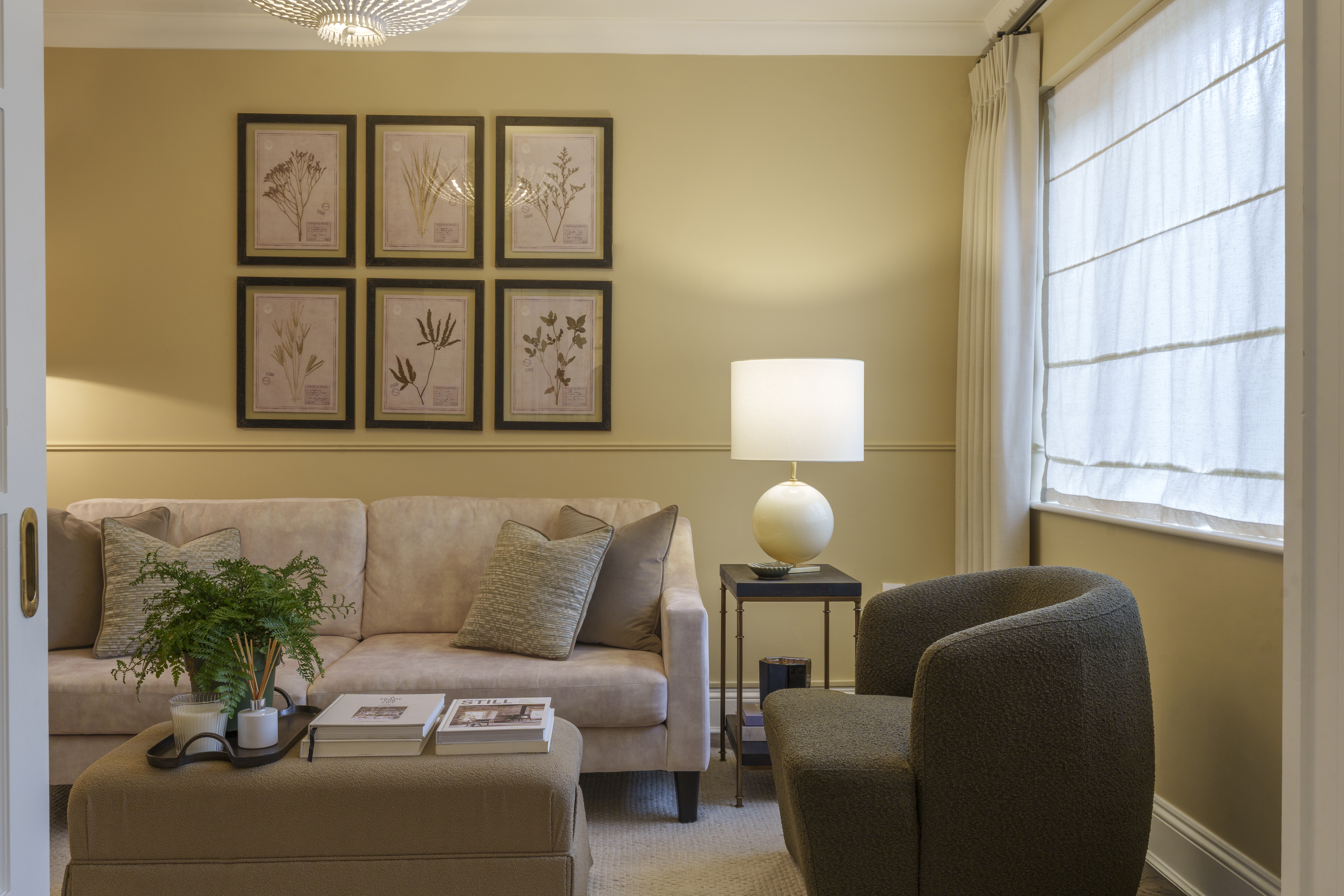 While these are the functional spaces, in contrast, on the other side of the house is a cosy snug. “The atmosphere is cocooning yet refined, soothed in the soft, warm beige of Farrow & Ball’s Cord. Our furnishings and upholstery follow a cohesive, organic theme with nods to nature and botanicals. A sculptural ceiling light adds a subtle modern glamour, while the floor-to-ceiling curtains and fabric roman blind in a creamy neutral frame the window, filtering light. The room feels comfortable and contemporary, with warmth, calm and a subtle elegance.”